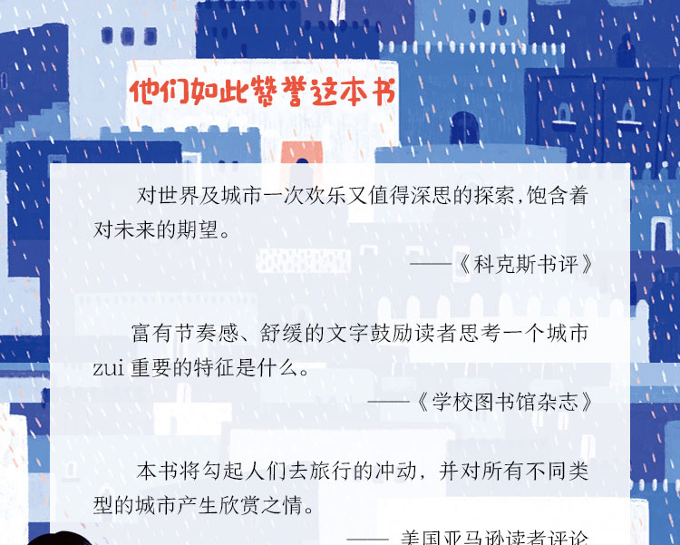 图画充满活力,将吸引读者去探索、描绘城市之间的异同……通过富有节奏感、舒缓的文字,鼓励读者去思考一个城市最重要的特征是什么。——《学校图书馆杂志》