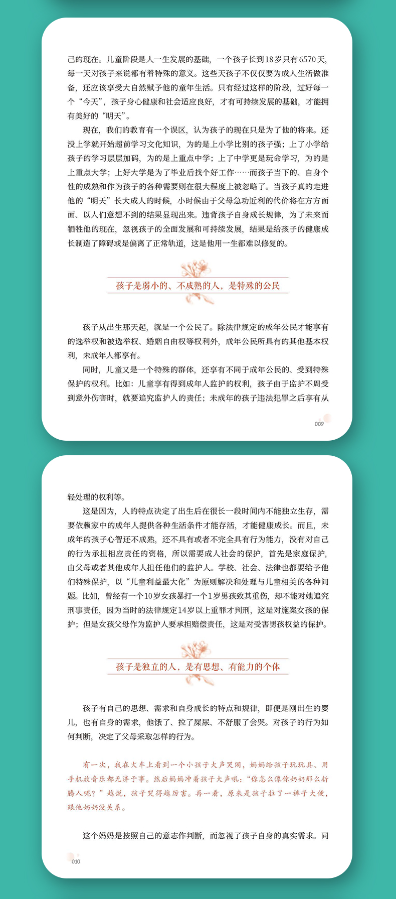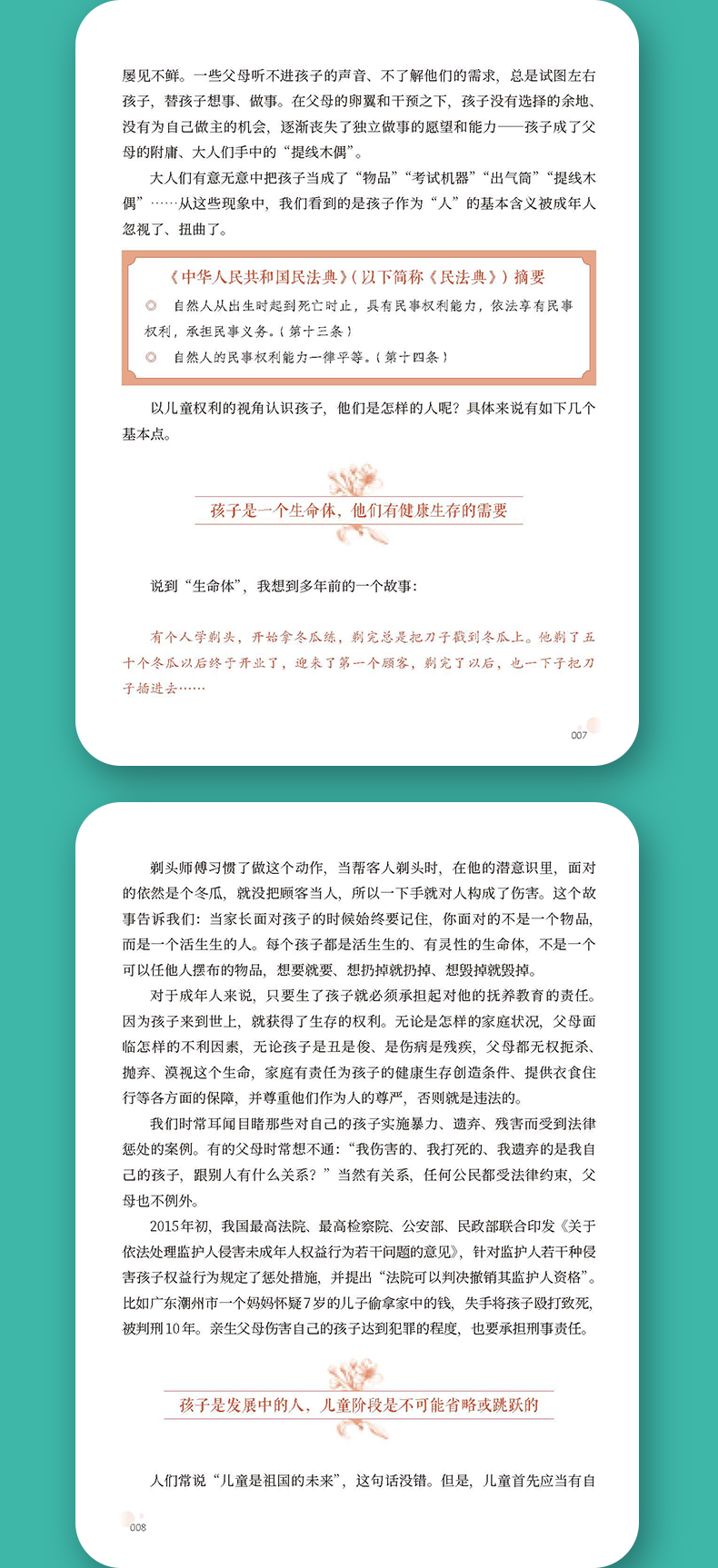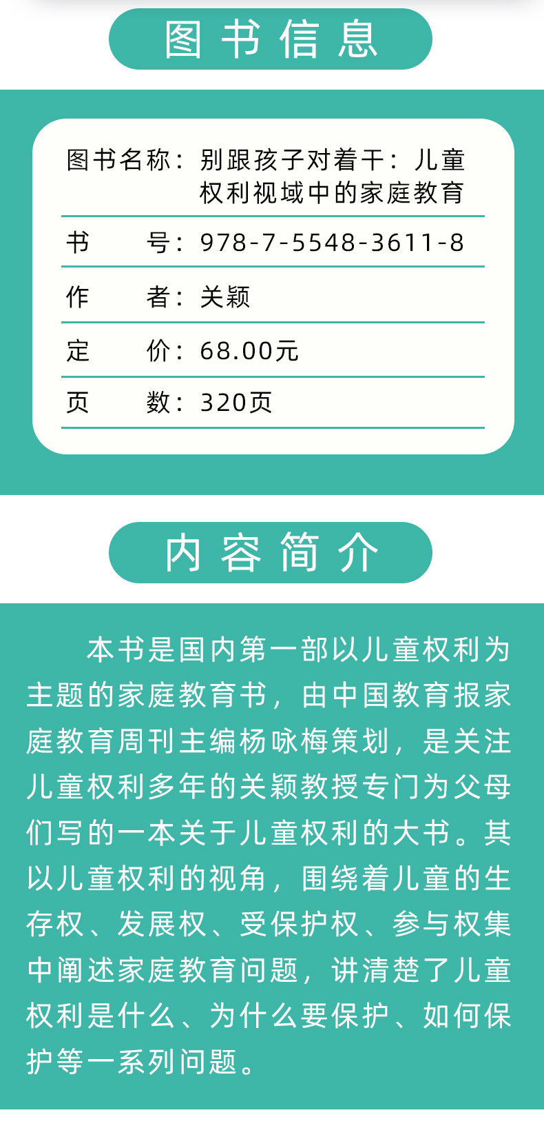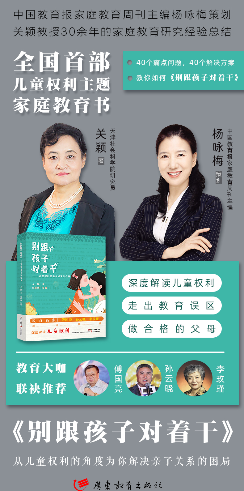 系国内第一部以儿童权利为主题的家庭教育书,由中国教育报家庭教育周刊主编杨咏梅策划,是关注儿童权利多年的关颖教授专门为父母们写的一本关于儿童权利的大书。其以儿童权利的视角,围绕着儿童的生存权、发展权、受保护权、参与权集中阐述家庭教育问题,讲清楚了儿童权利是什么、为什么要保护、如何保护等一系列问题。