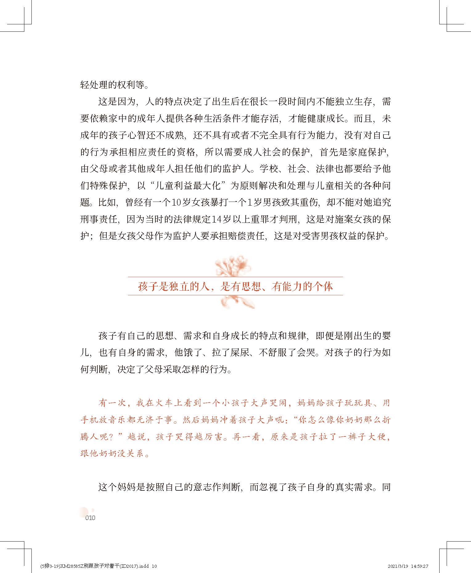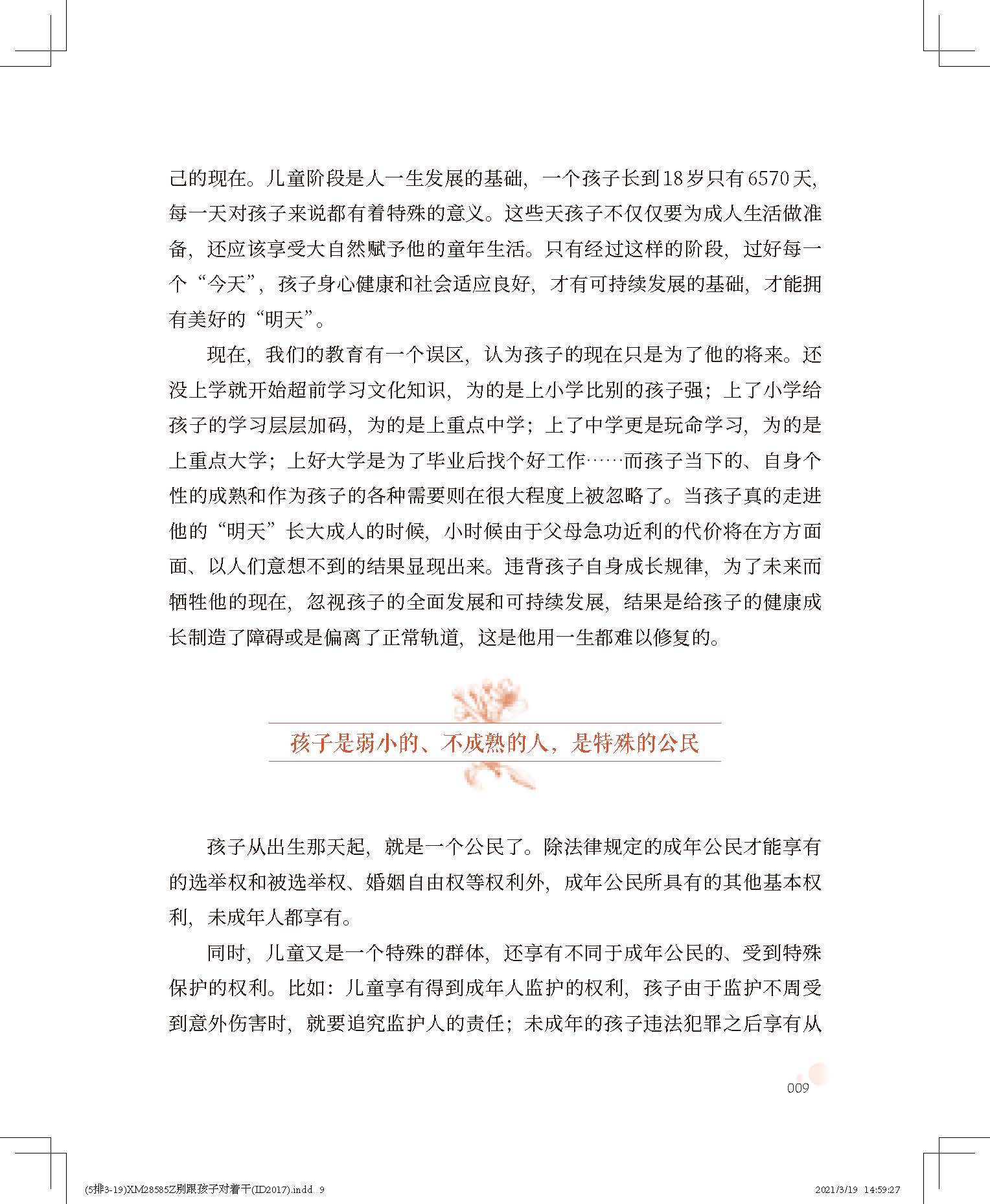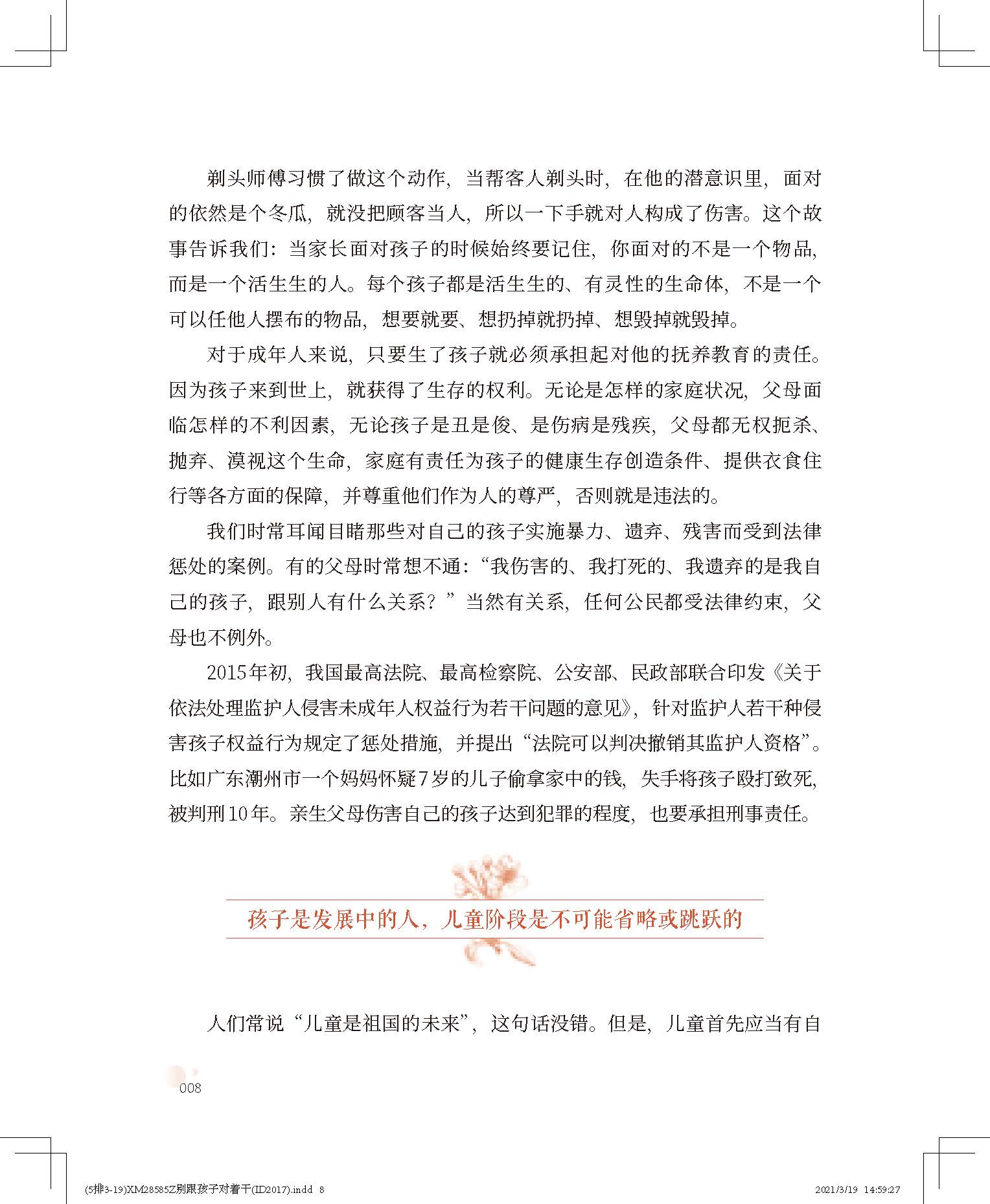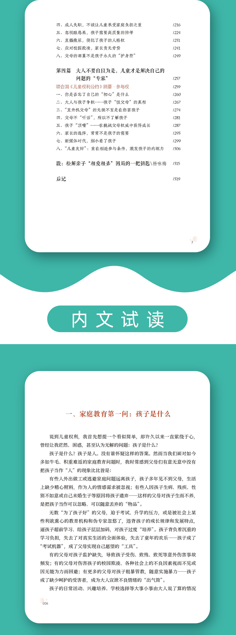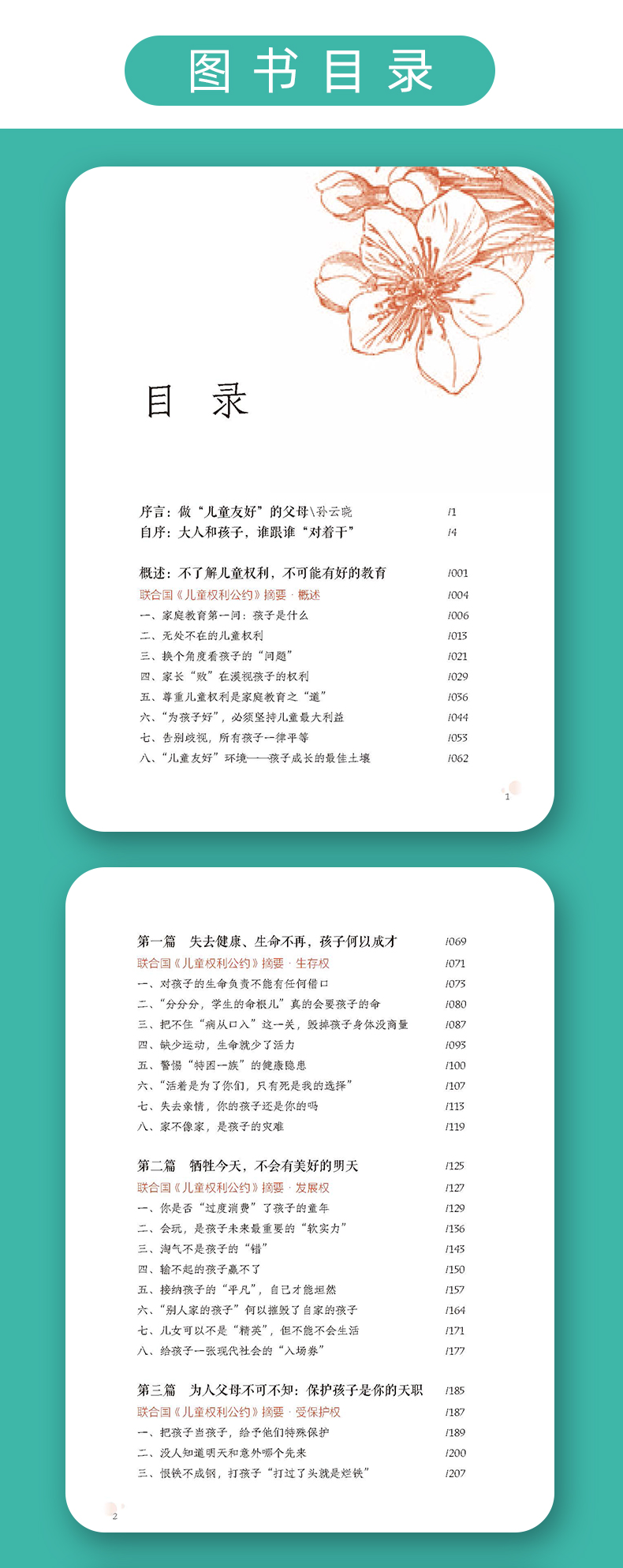 系国内第一部以儿童权利为主题的家庭教育书,由中国教育报家庭教育周刊主编杨咏梅策划,是关注儿童权利多年的关颖教授专门为父母们写的一本关于儿童权利的大书。其以儿童权利的视角,围绕着儿童的生存权、发展权、受保护权、参与权集中阐述家庭教育问题,讲清楚了儿童权利是什么、为什么要保护、如何保护等一系列问题。