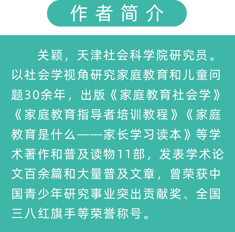 关颖,天津社会科学院研究员。以社会学视角研究家庭教育和儿童问题30余年,出版《家庭教育社会学》《家庭教育指导者培训教程》《家庭教育是什么——家长学习读本》等学术著作和普及读物11部,发表学术论文百余篇和大量普及文章,曾荣获中国青少年研究事业突出贡献奖、全国三八红旗手等荣誉称号。