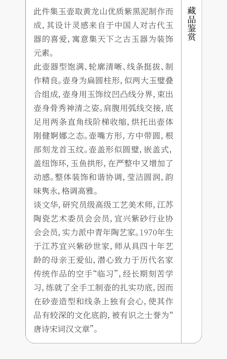 《集玉壶》 谈文华 正高级工艺美术师(研究员级高级工艺美术师)、江苏陶瓷艺术委员会会员、宜兴紫砂行业协会会员、实力派中青年陶艺家