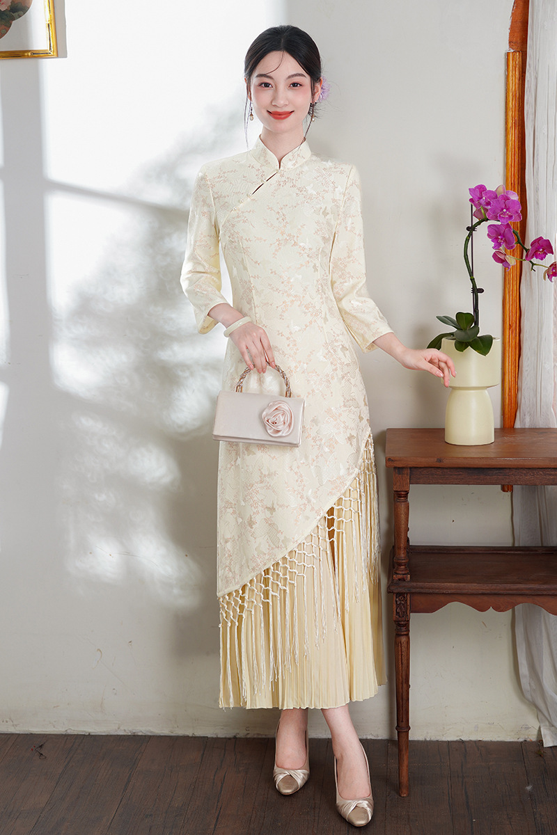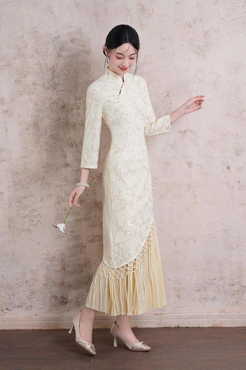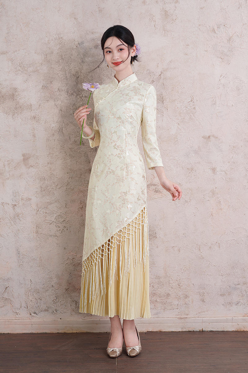 2025年秋季新款改良旗袍大裙摆气质日常米白流苏长款连衣裙女装 商品图0