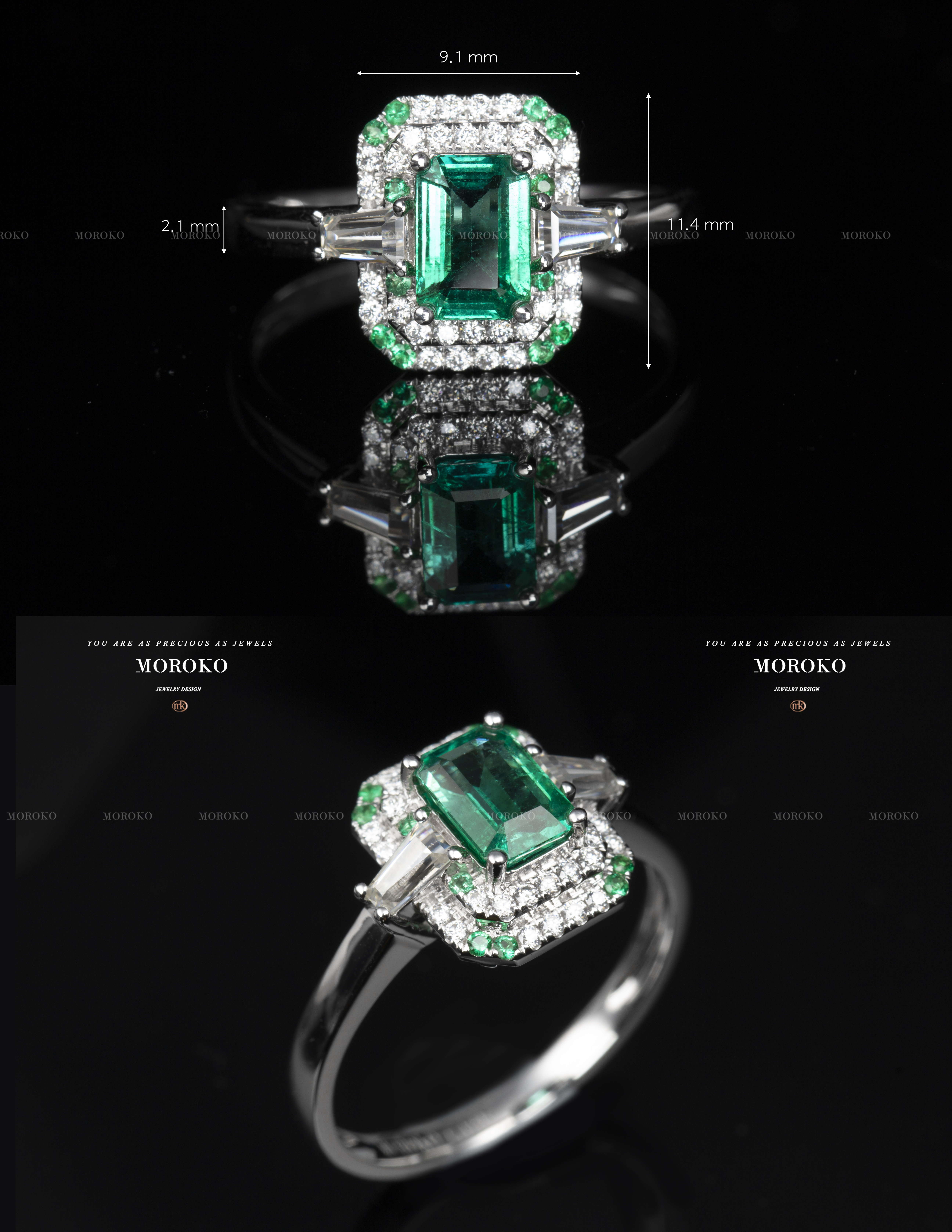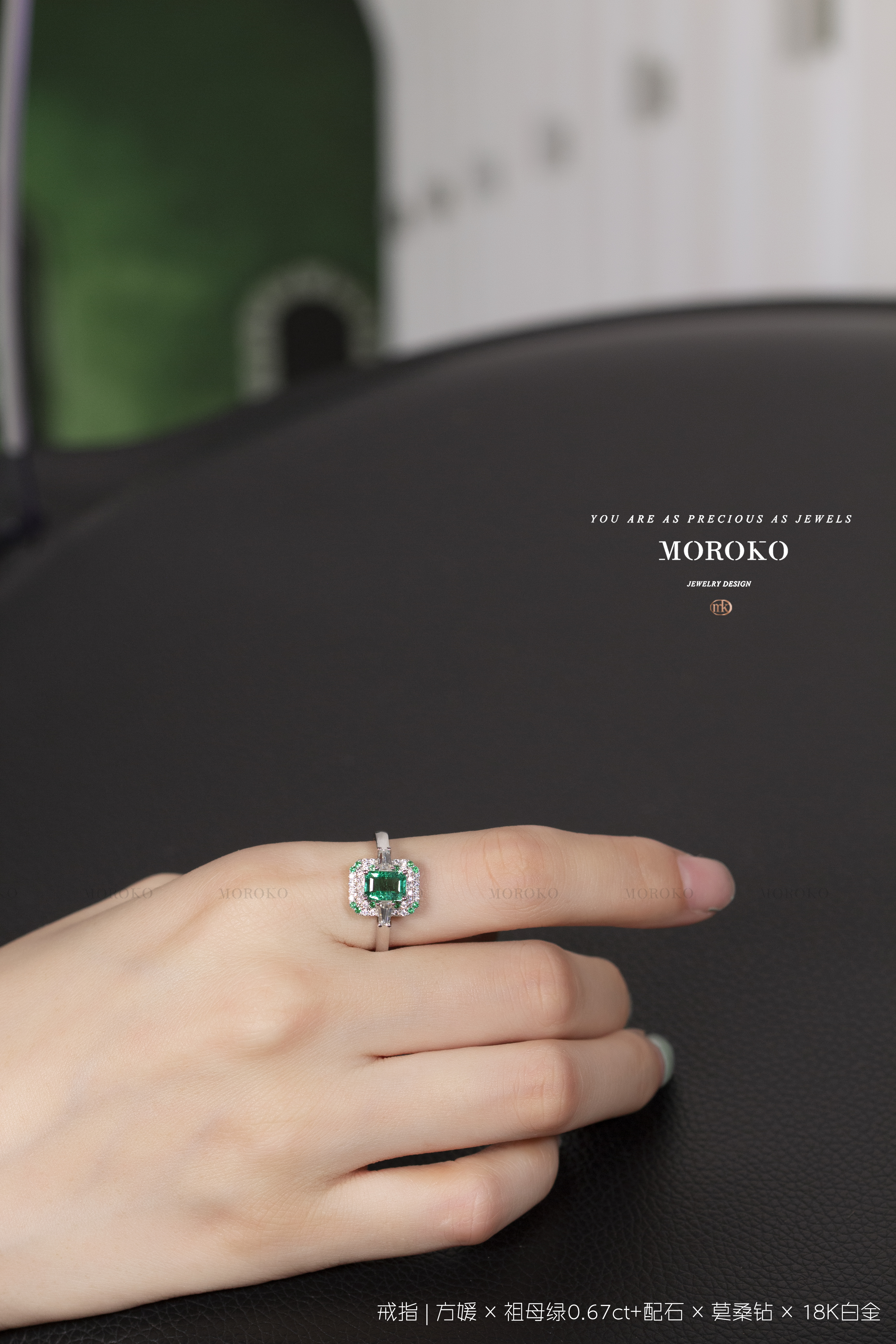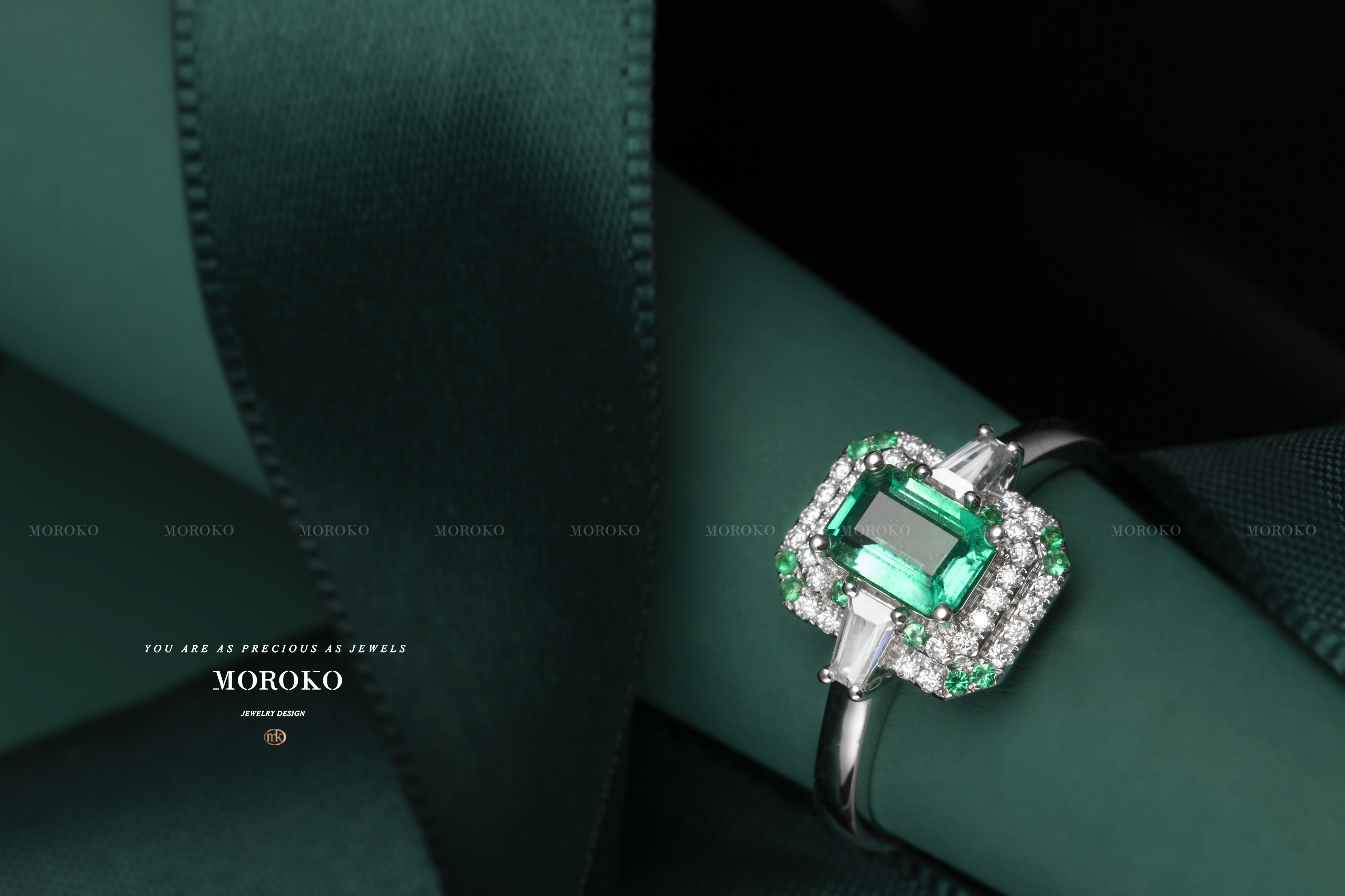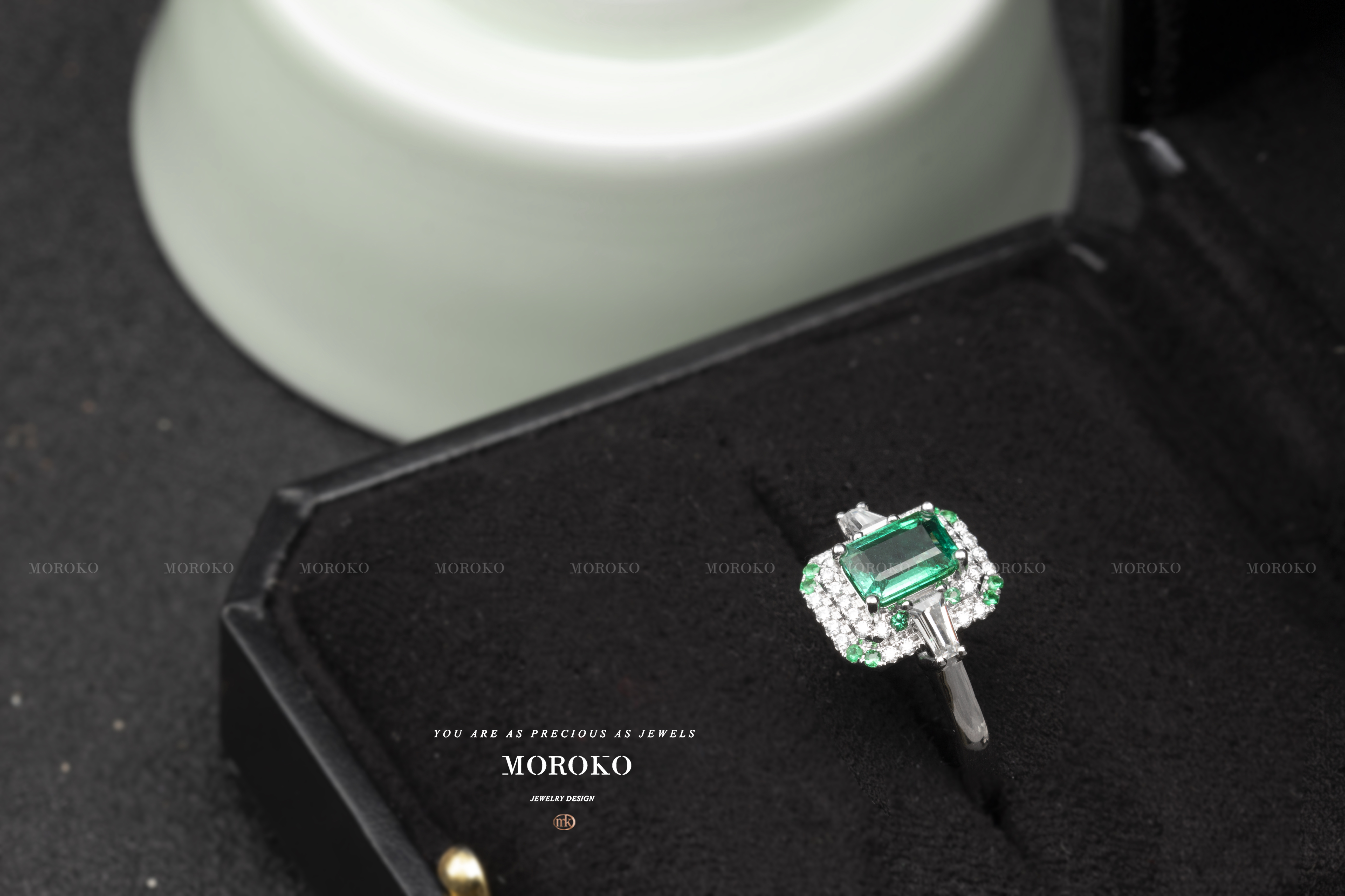 侧面围绕主石的一圈配钻和小祖母绿镶嵌