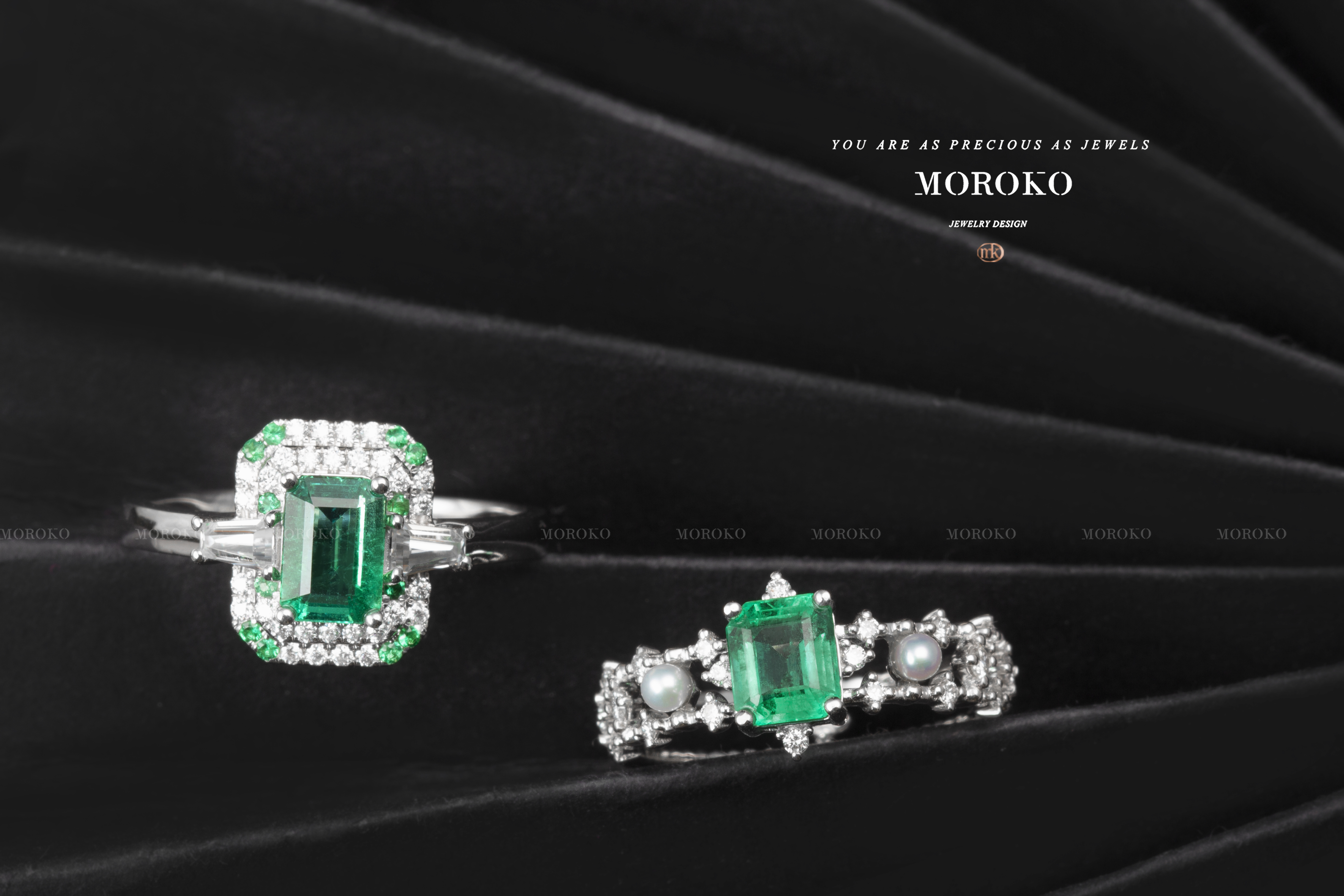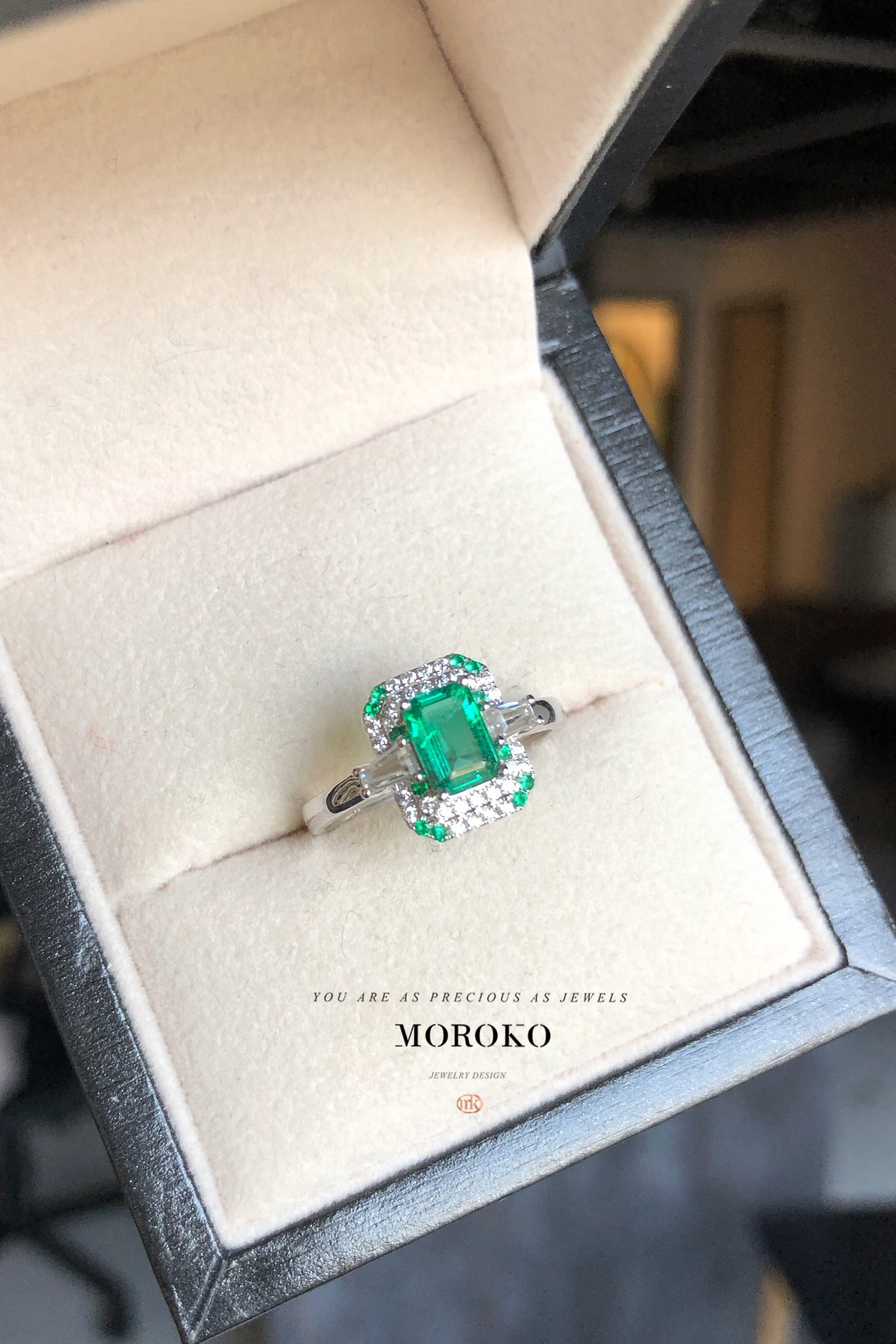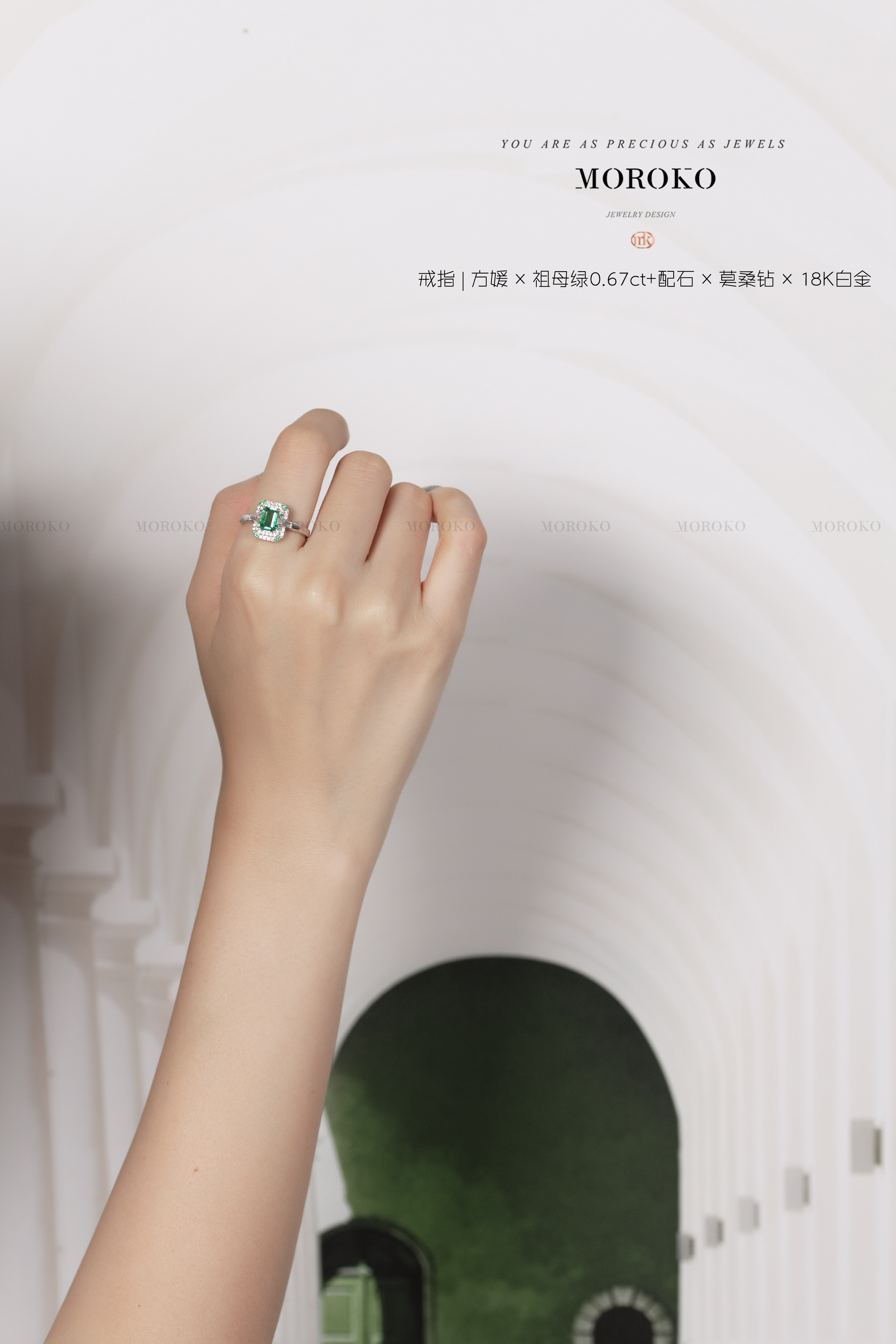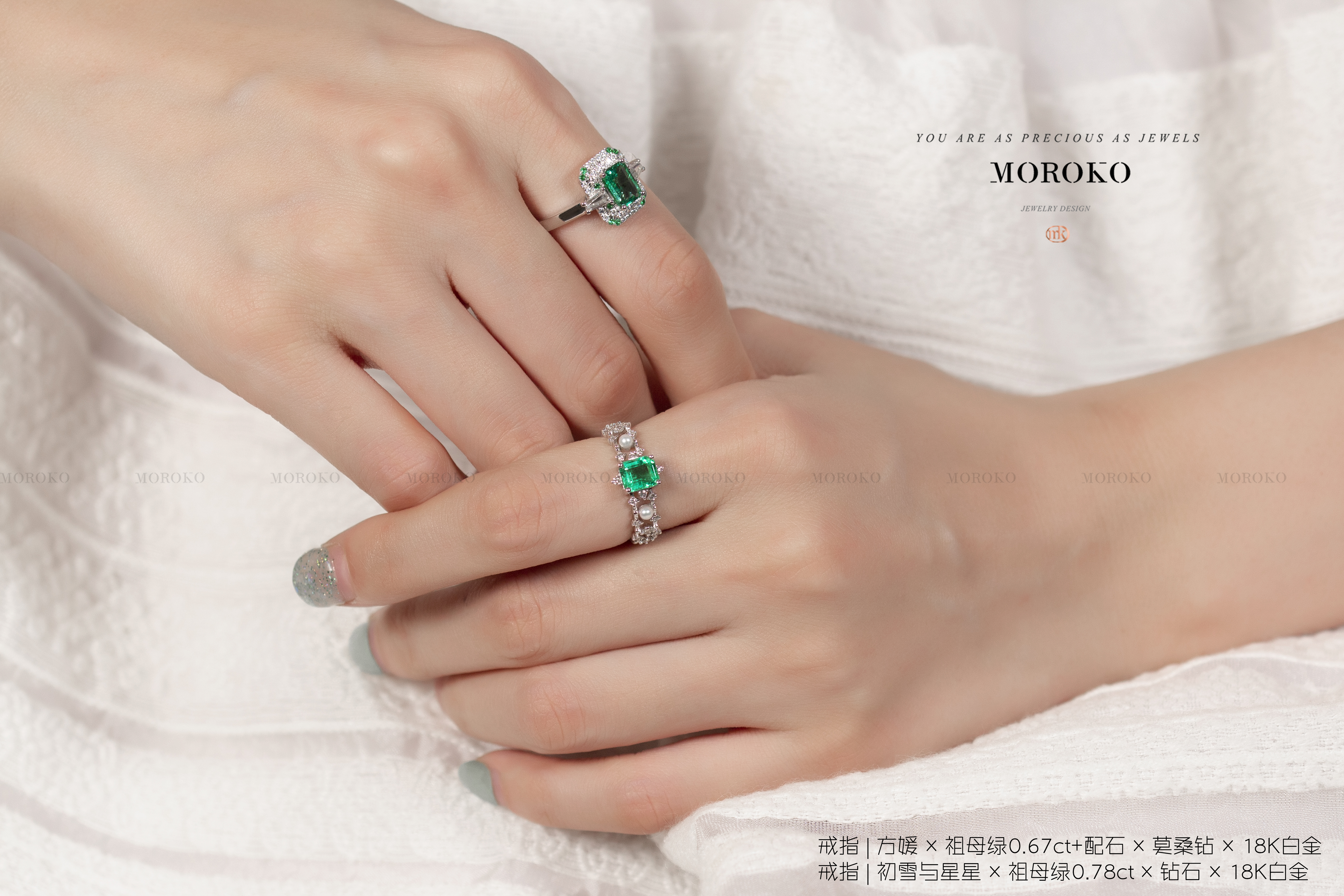 侧面围绕主石的一圈配钻和小祖母绿镶嵌