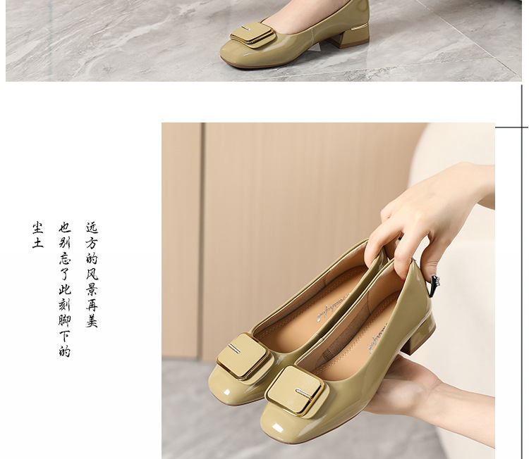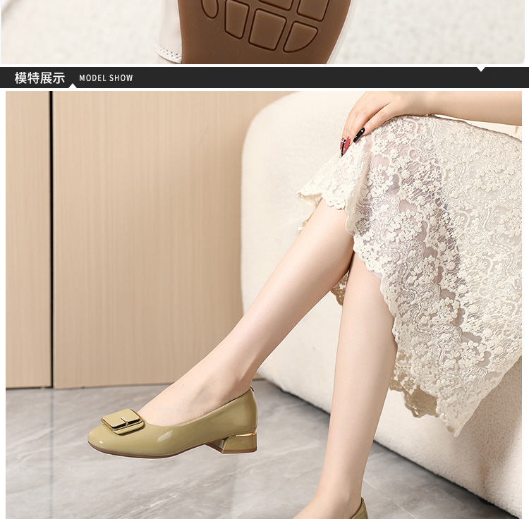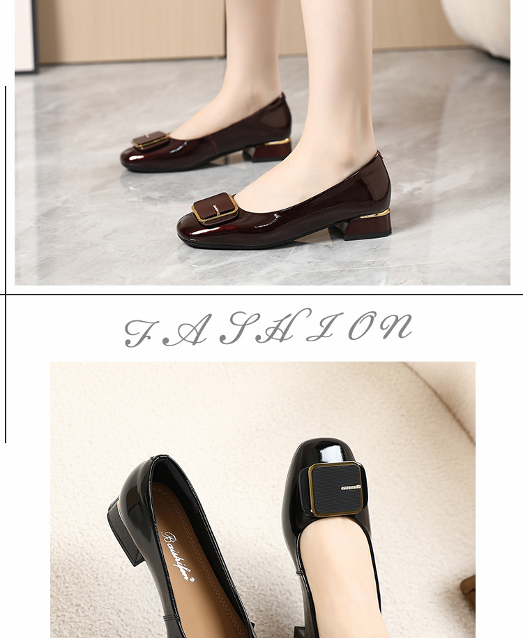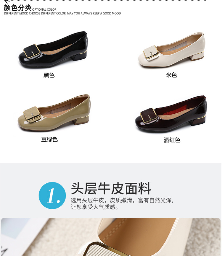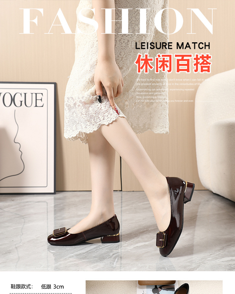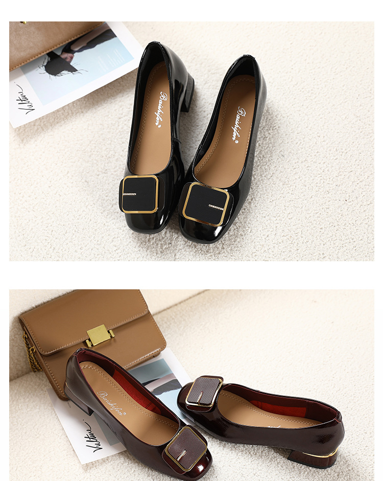 丁摩 漆皮低跟女单鞋圆头浅口女鞋真皮粗跟方扣时尚女跟鞋大码5ZF-811