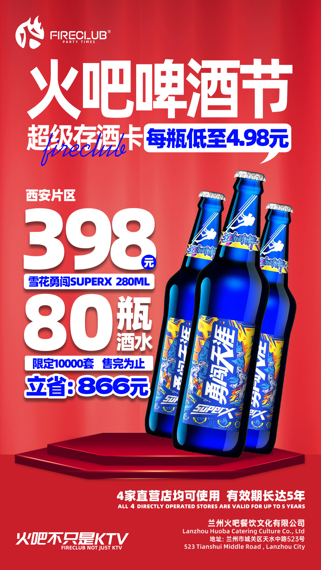 【西安通用】118火吧啤酒节—超值存酒卡—398元80瓶雪花SuperX280ml