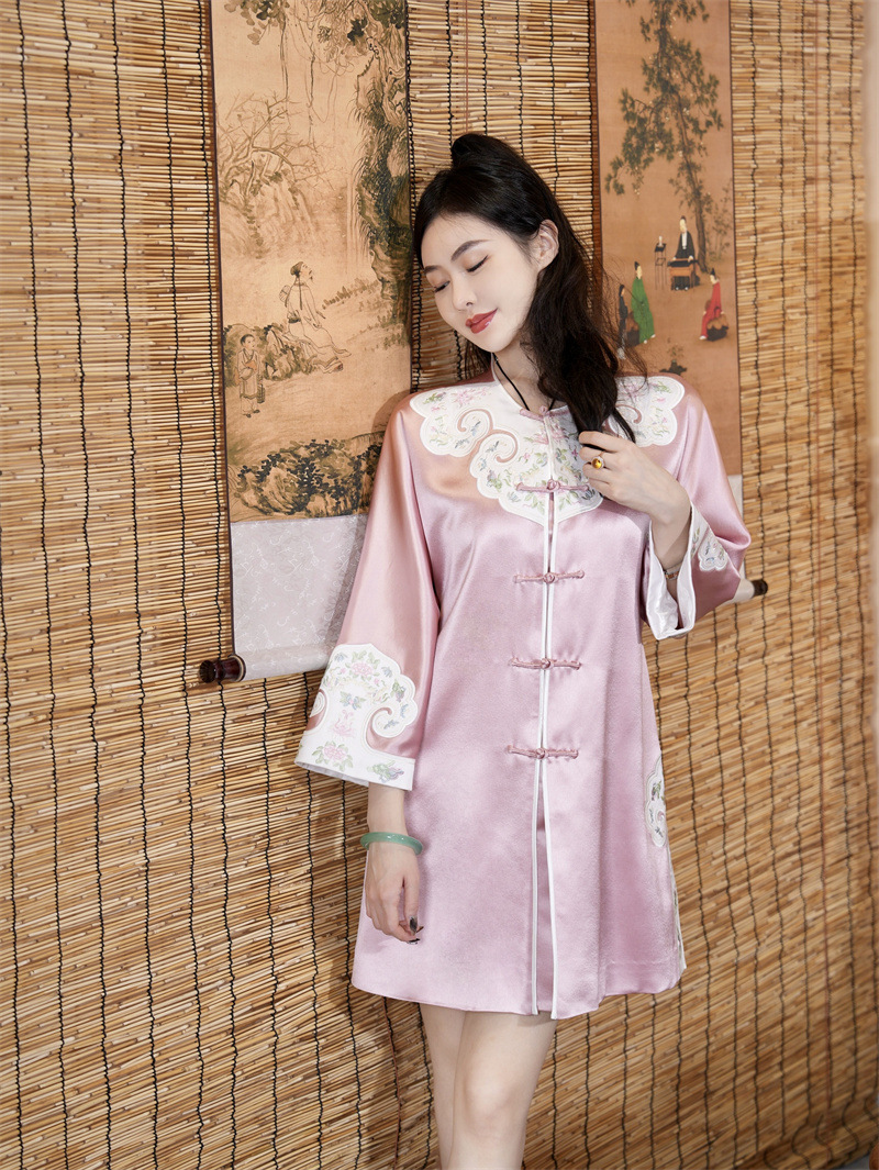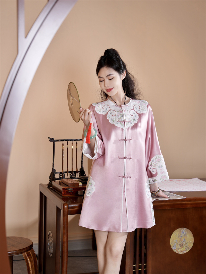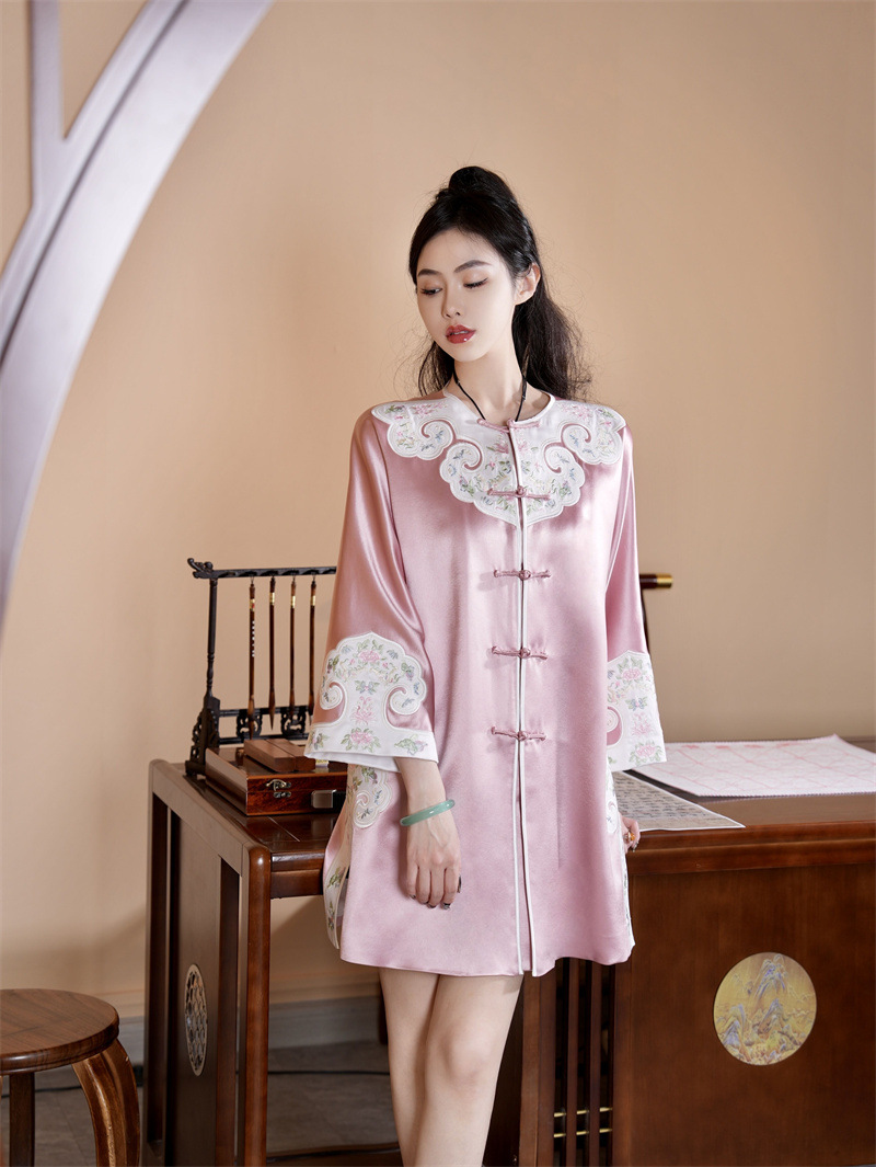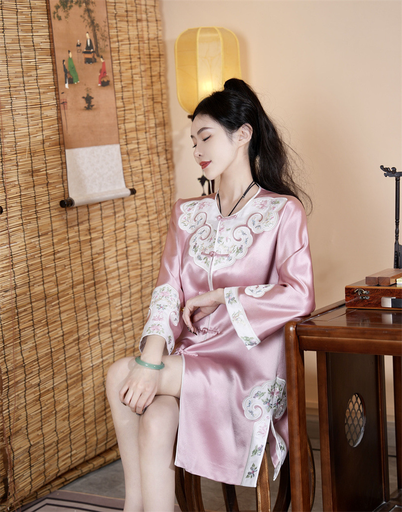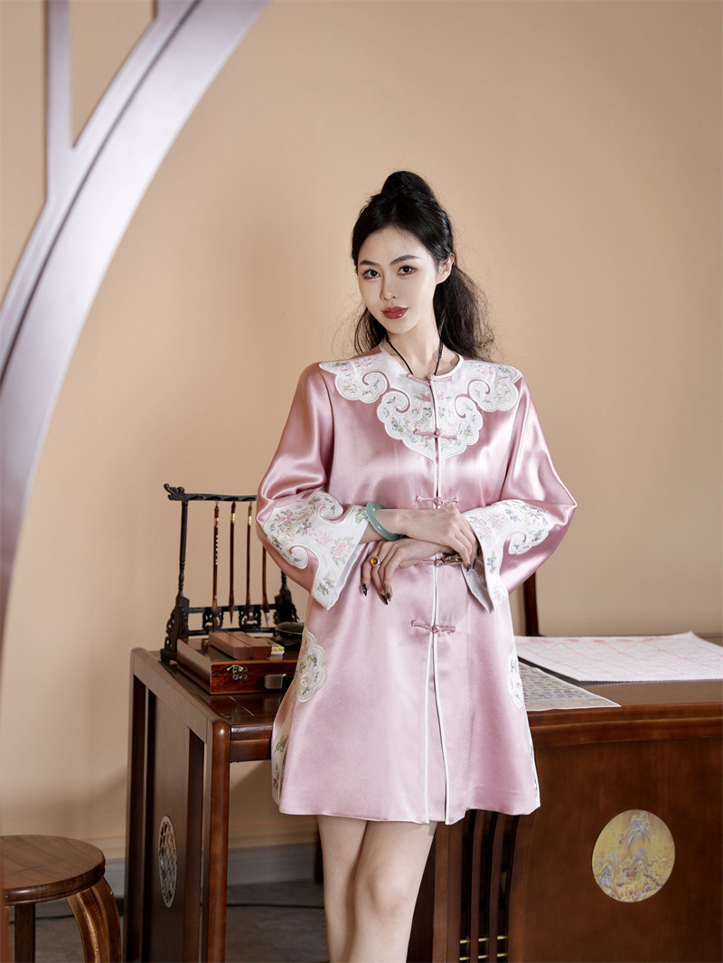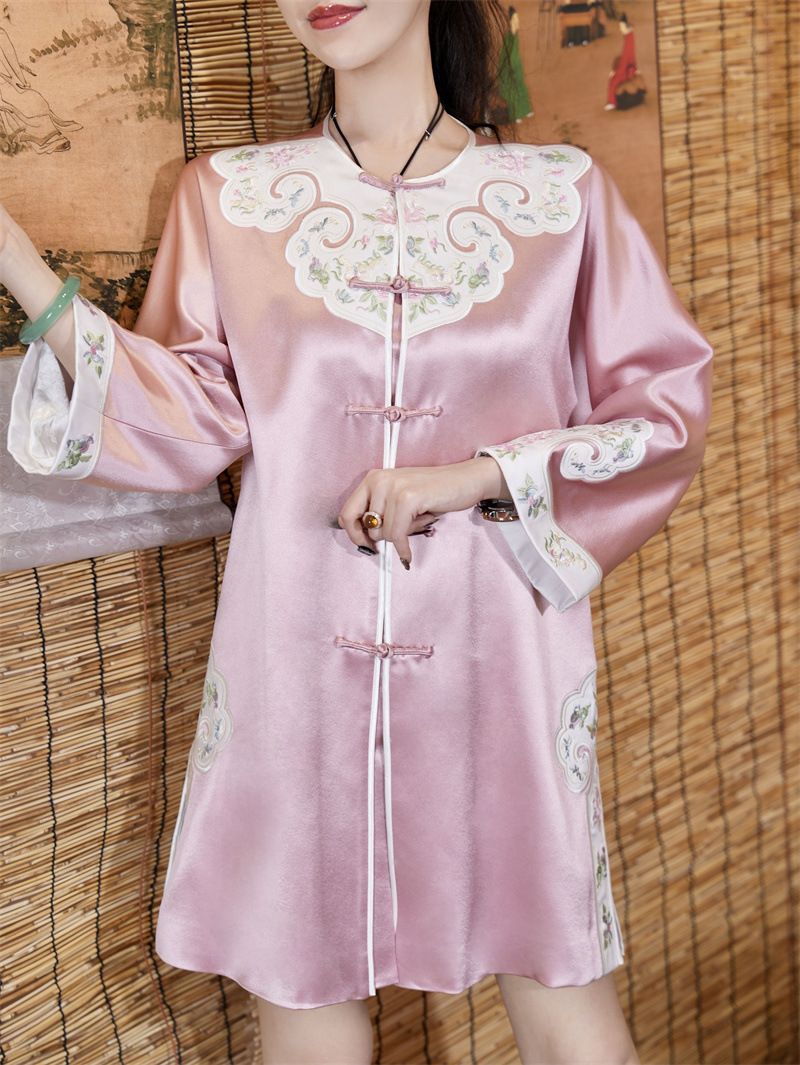 FLZD-A9569秋新款三醋酸重工刺绣拼接蝶恋花风衣中长款开衫盘扣外套国风