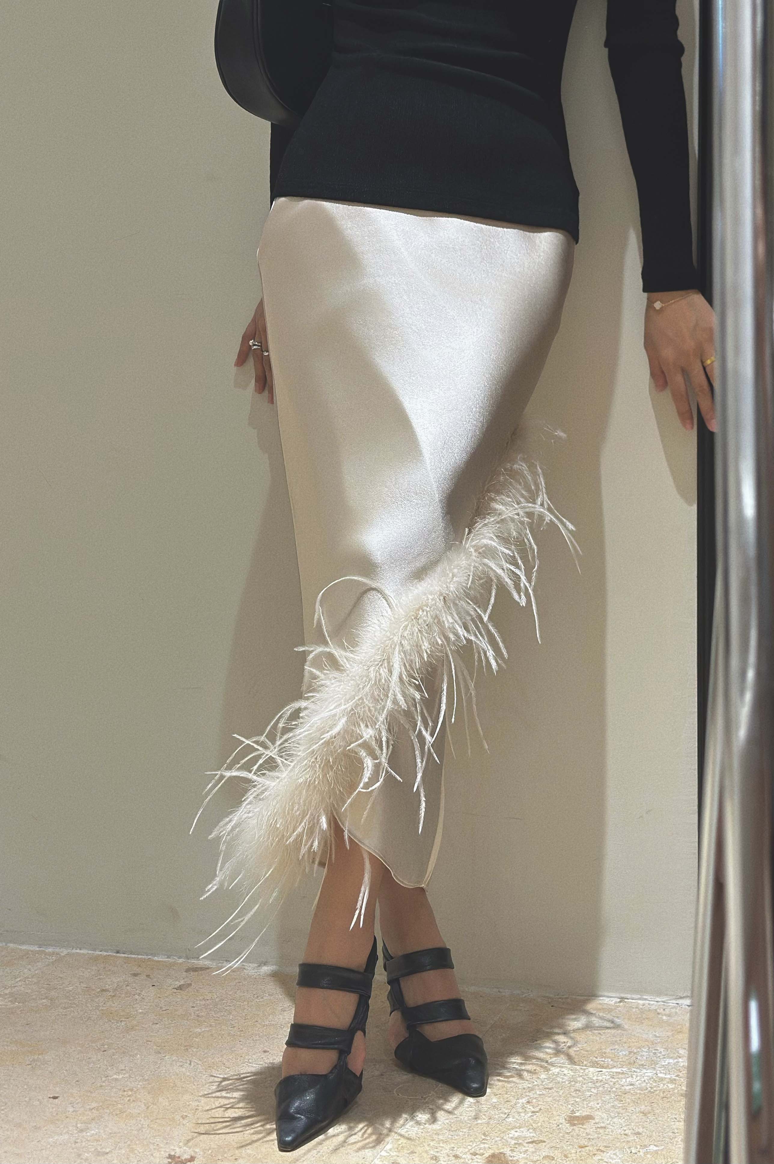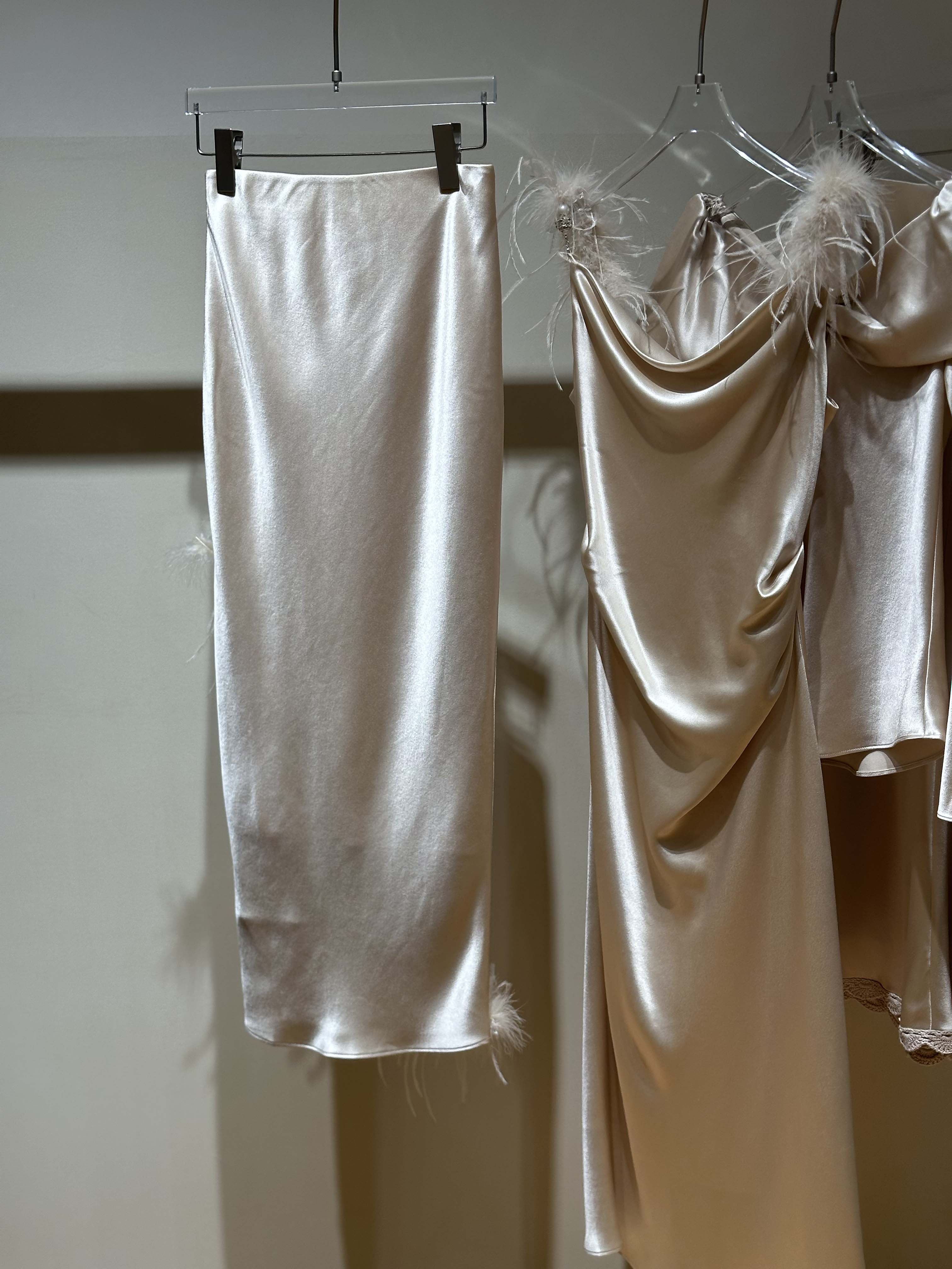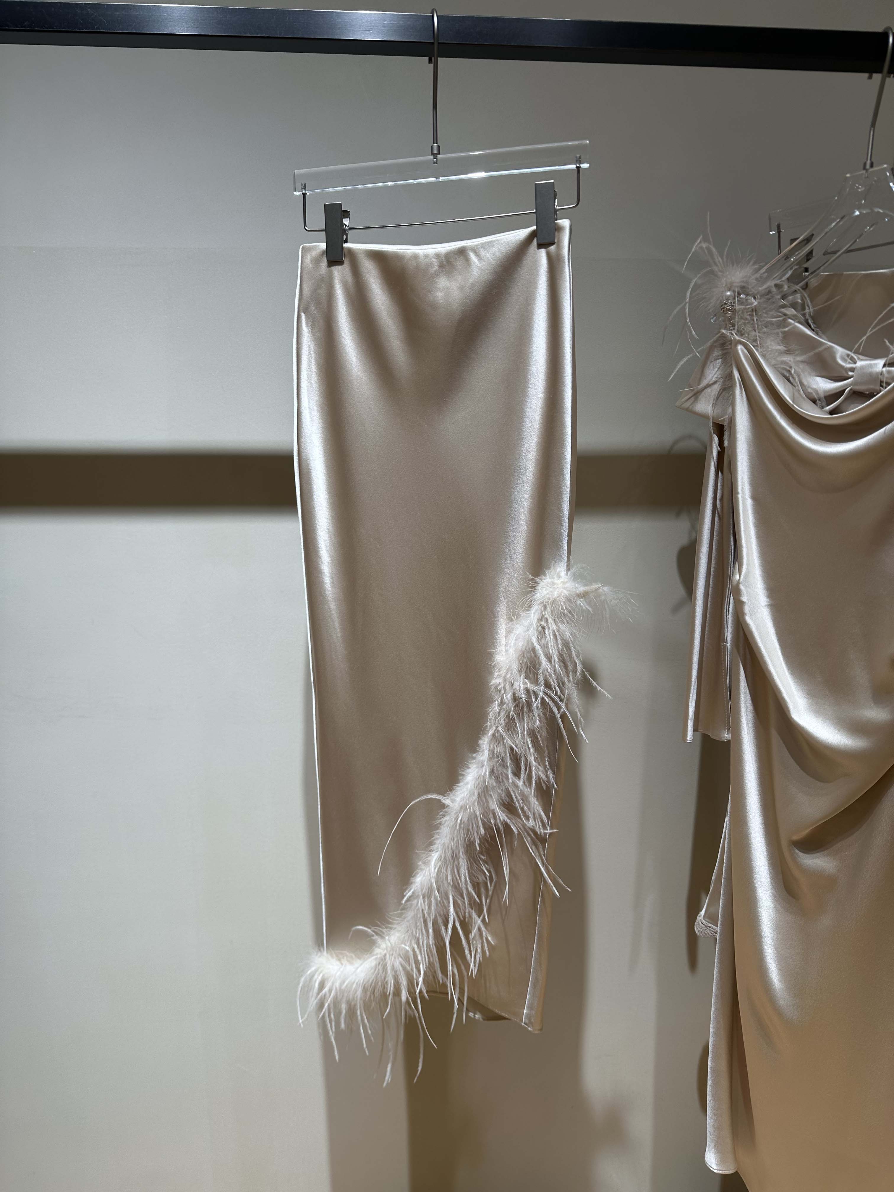 优雅的包身半裙,搭配可拆卸羽毛条的点缀,质地柔软,丰满飘逸又增加一丝轻奢感