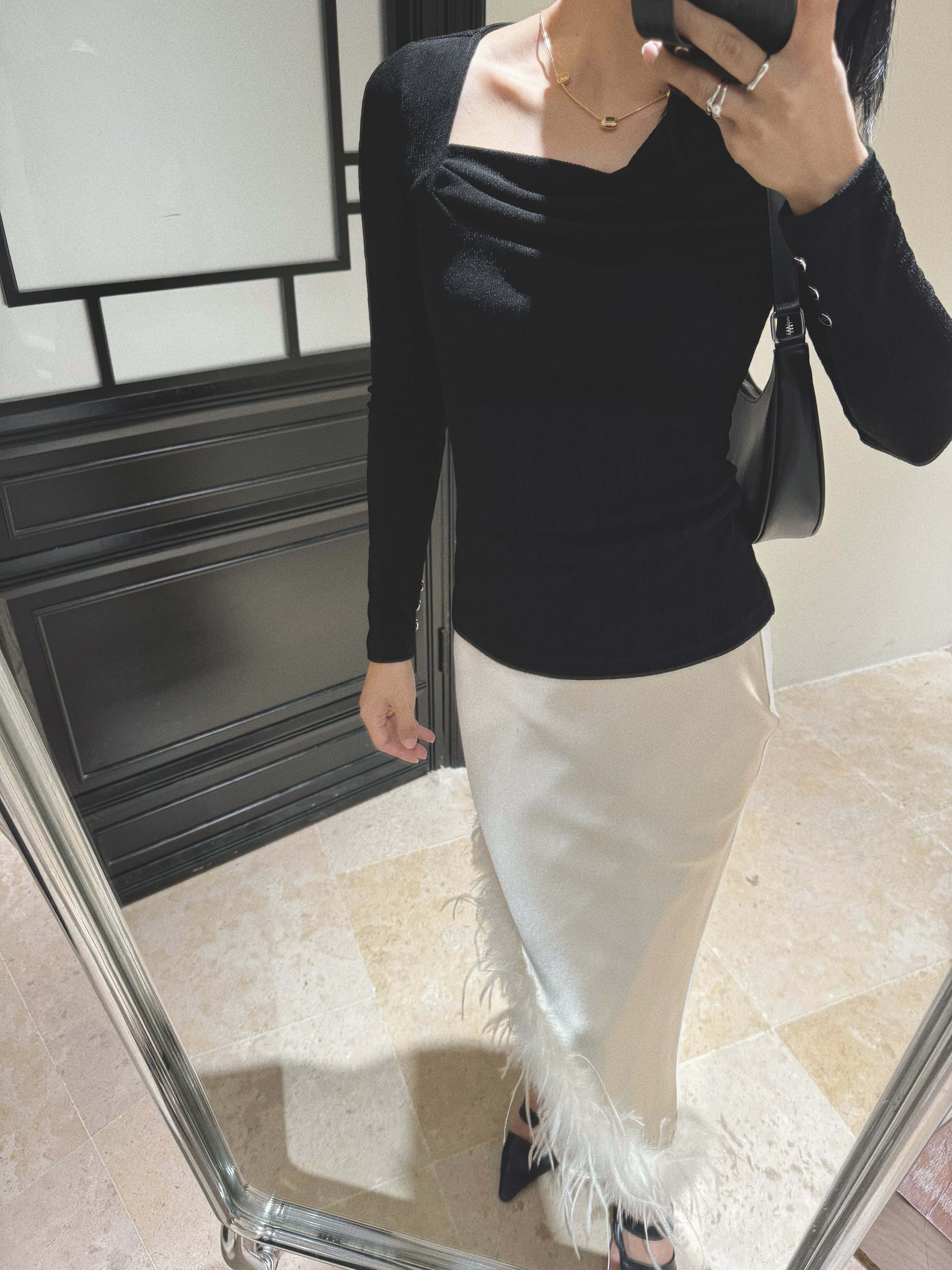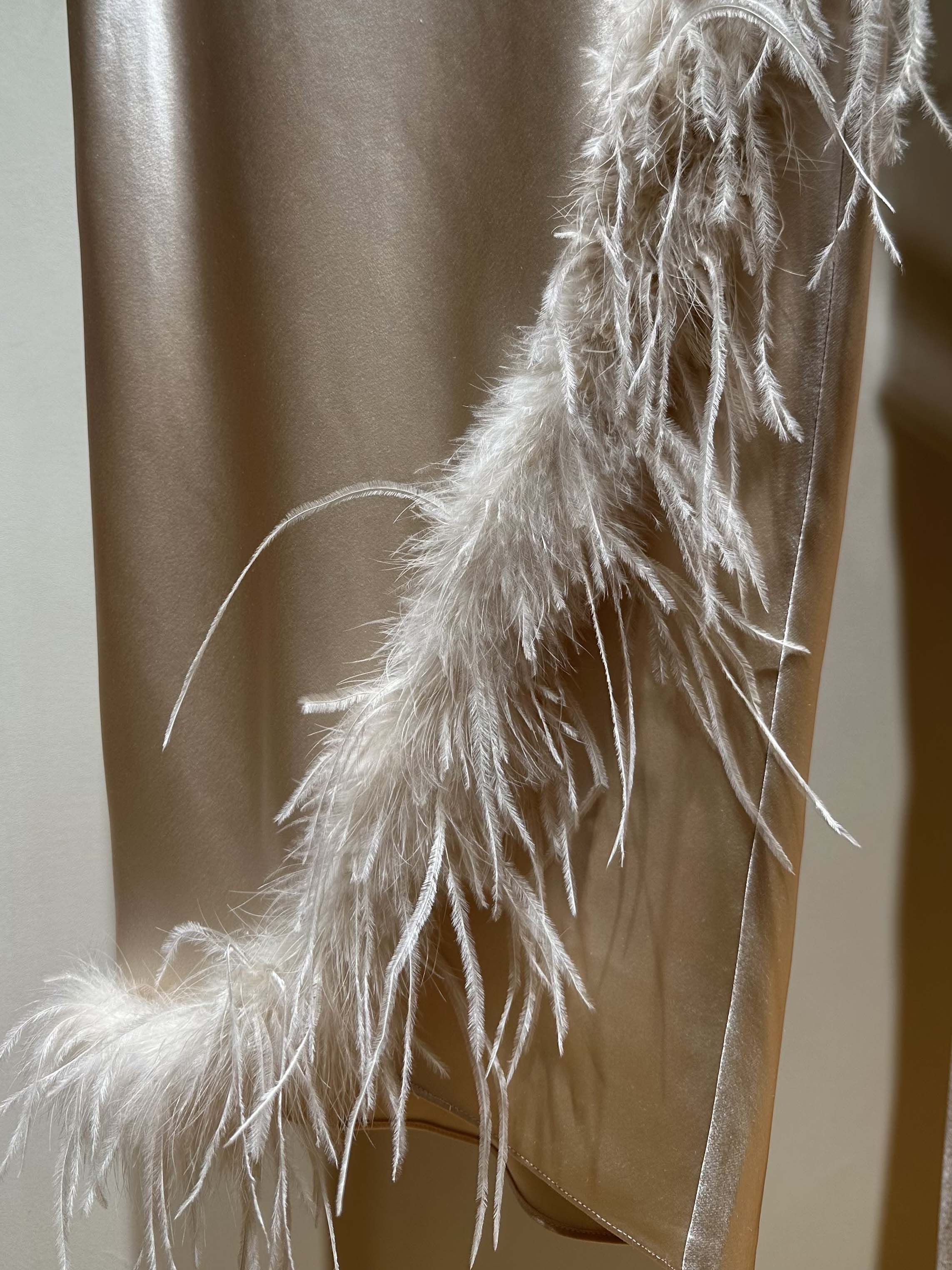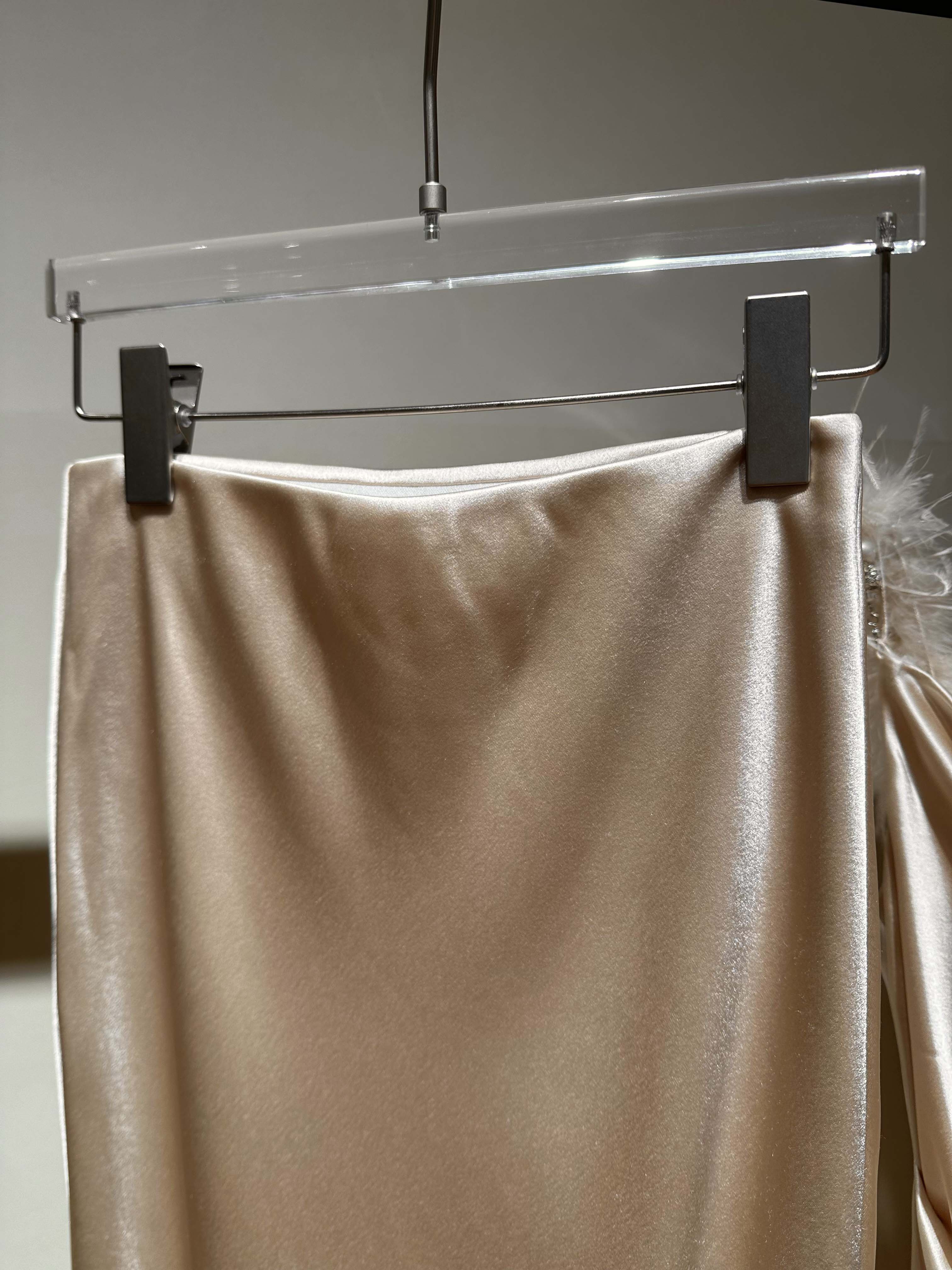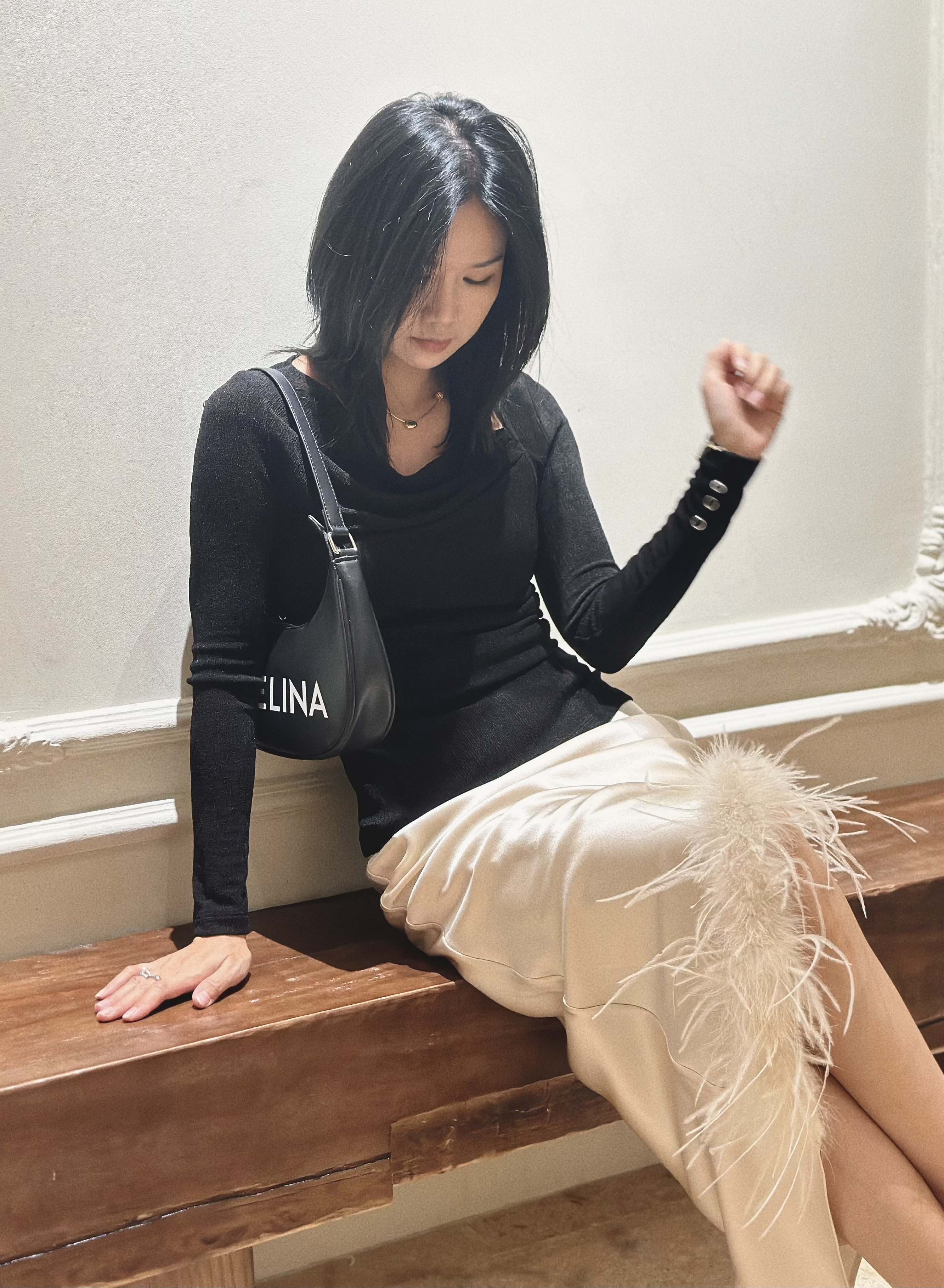 优雅的包身半裙,搭配可拆卸羽毛条的点缀,质地柔软,丰满飘逸又增加一丝轻奢感