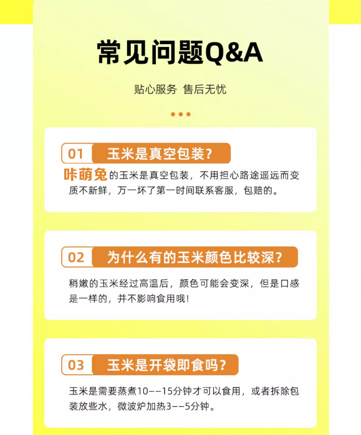 玉米基本无售后,本产品是真空包装,收到货后如发现包装有漏气、胀包、变质请勿食用,出现以上情况,联系售后闪电赔付