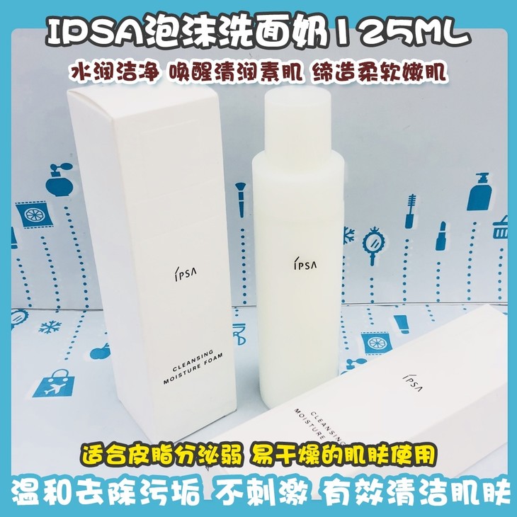 IPSA泡沫洗面奶125ML👍水润洁净,唤醒清润素肌,缔造柔软嫩肌。🌱适合皮脂分泌弱,易干燥的肌肤使用。乳液质地,轻轻一搓,☁泡沫丰富且细腻,洗后肌肤柔润顺溜,不假滑。🍃温和去除污垢,不刺激,有效清洁肌肤,促进后续护肤品被肌肤吸收。💦蕴含天然保湿成分,洗后肌肤富有光泽不紧绷。💫