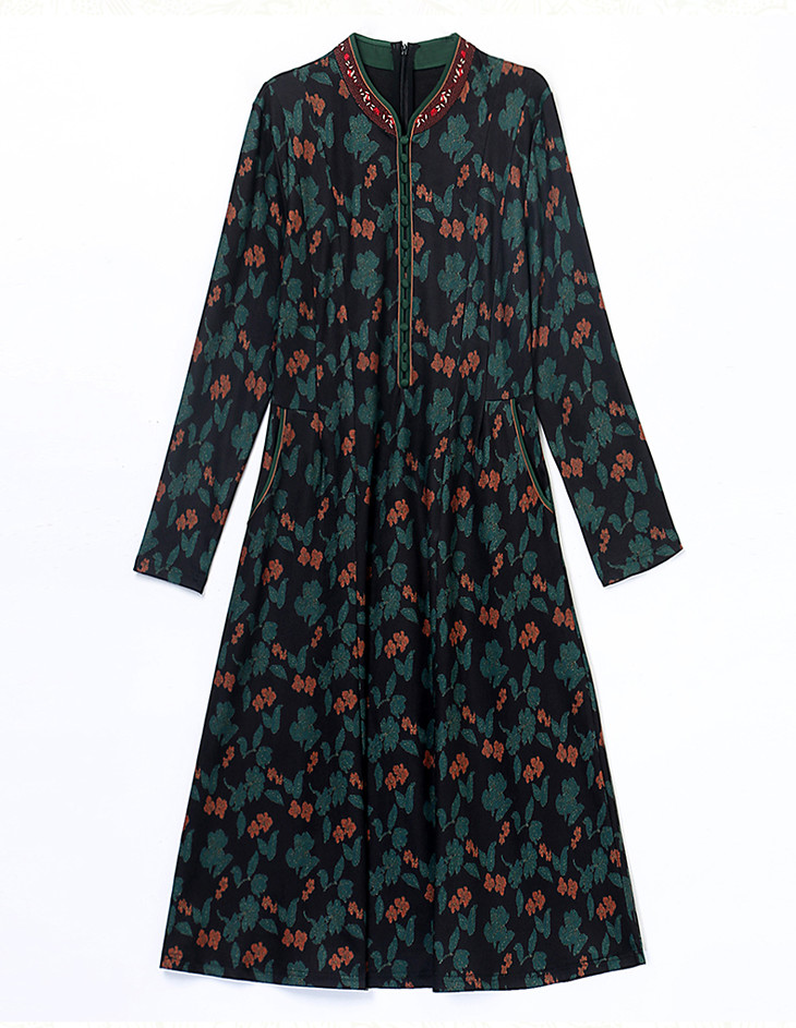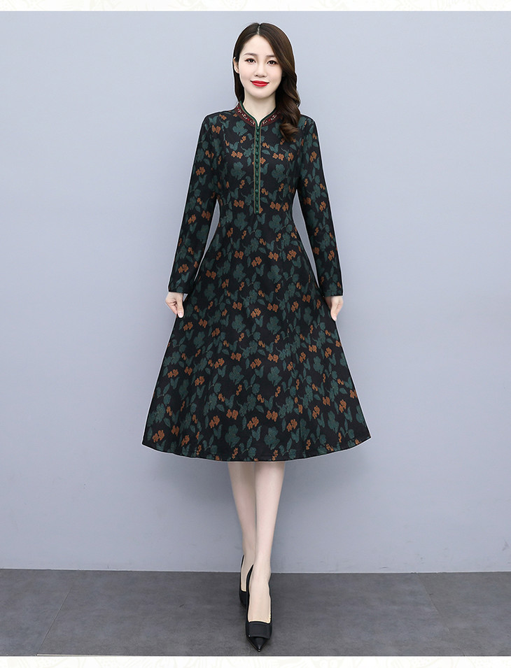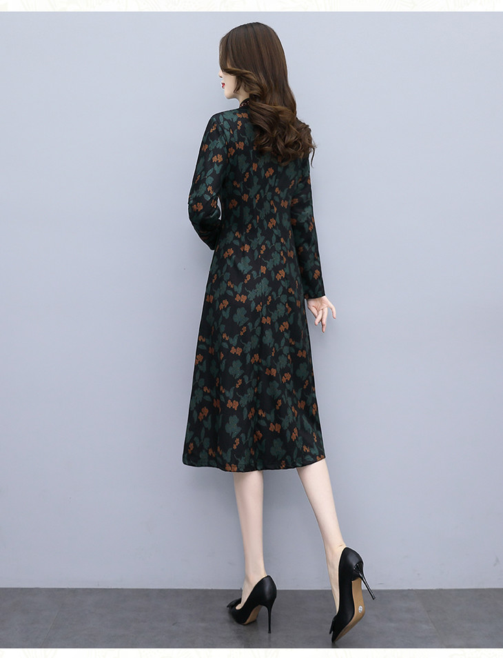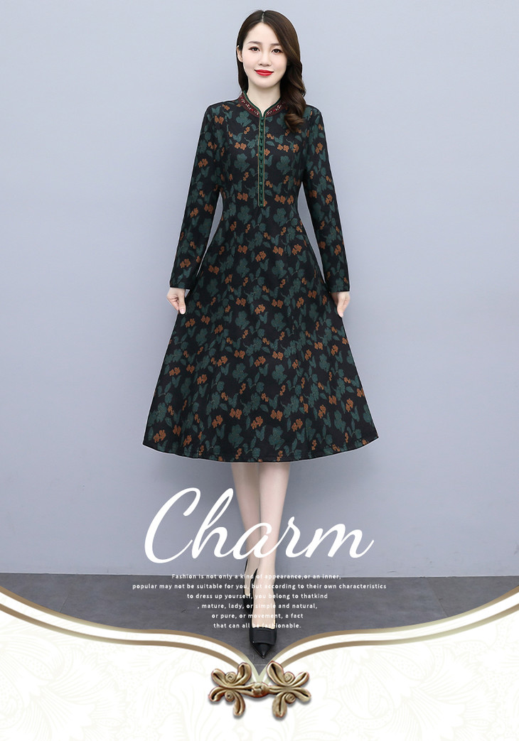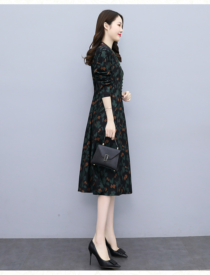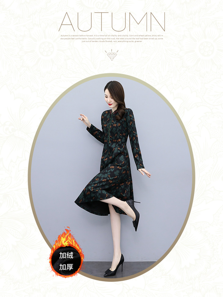 HRYZ7666-1 法式气质阔太太连衣裙女秋冬新款复古亮丝收腰大码印花裙