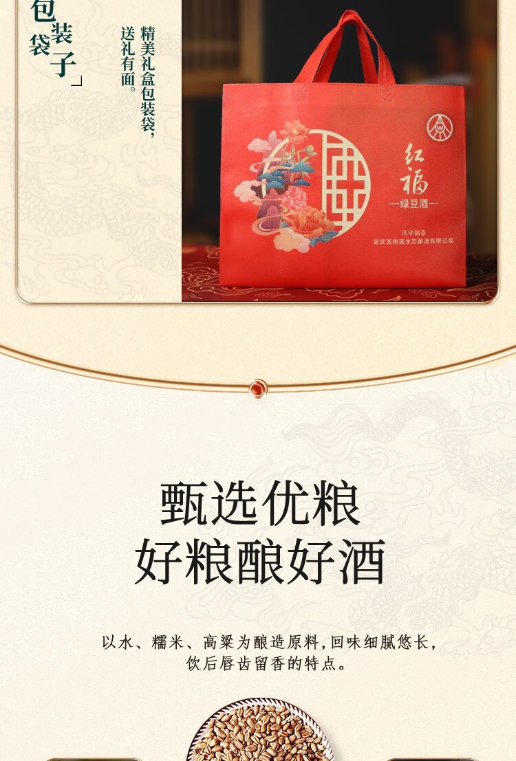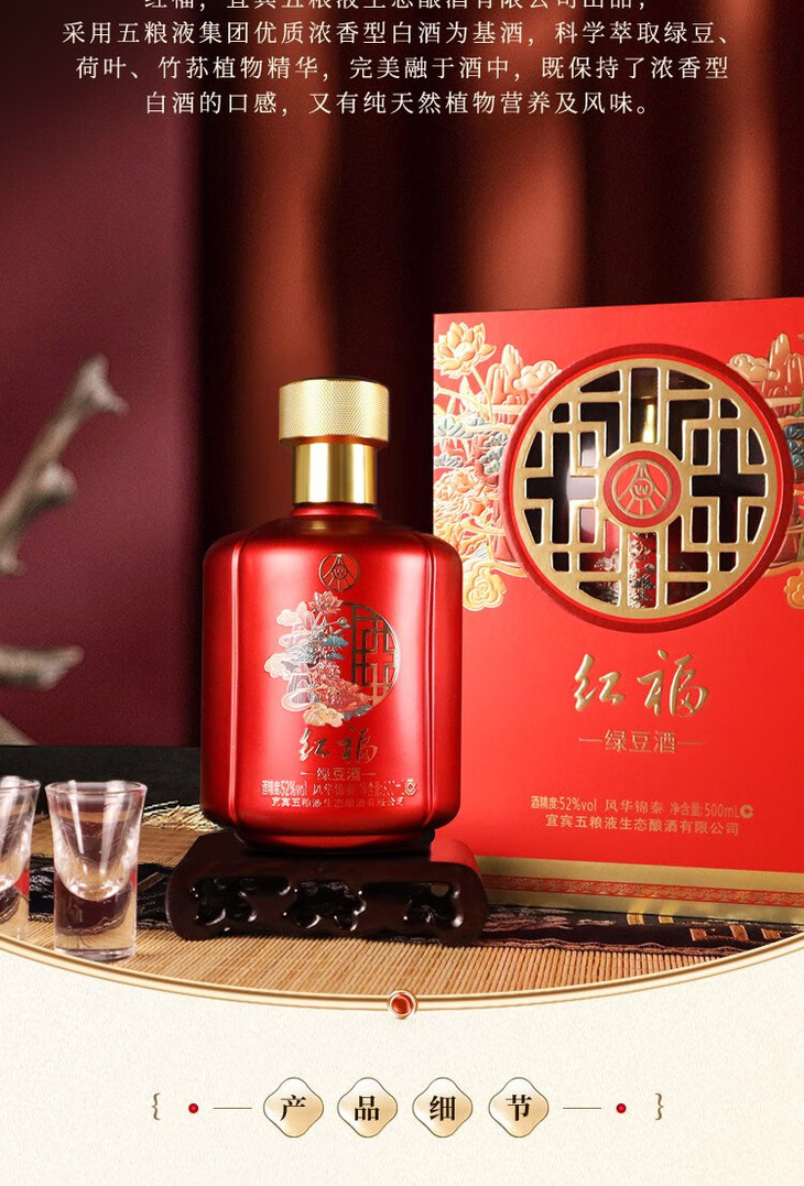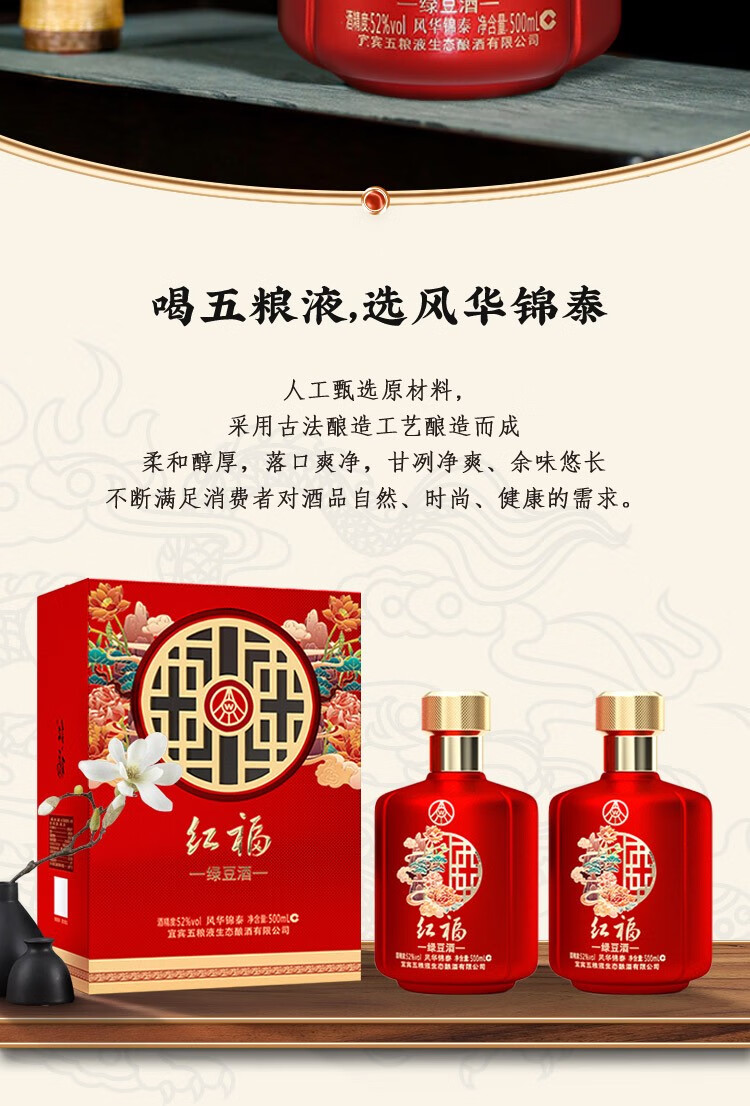 【2022年】五粮液生态 红福 风华锦泰 绿豆酒 52度 500ml x6【整箱】