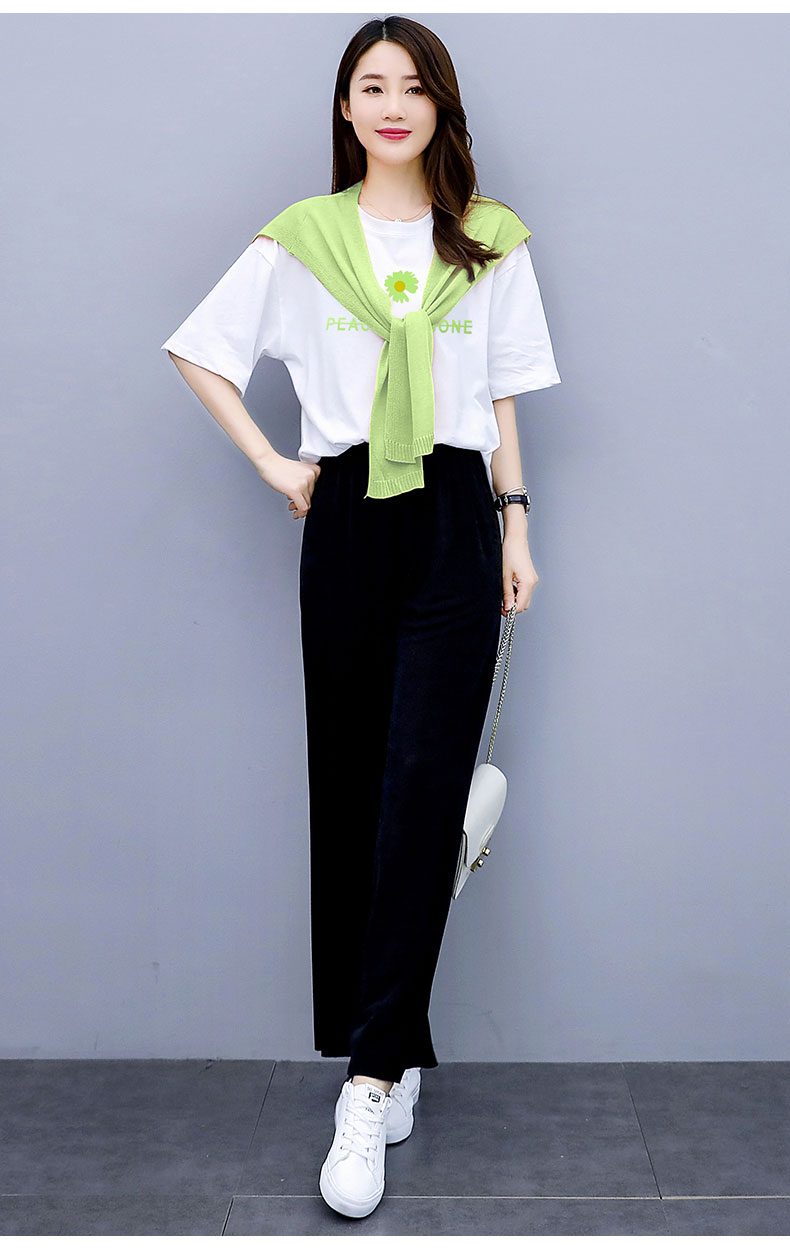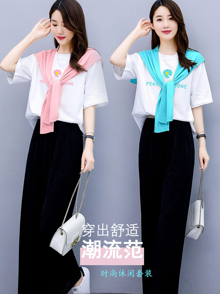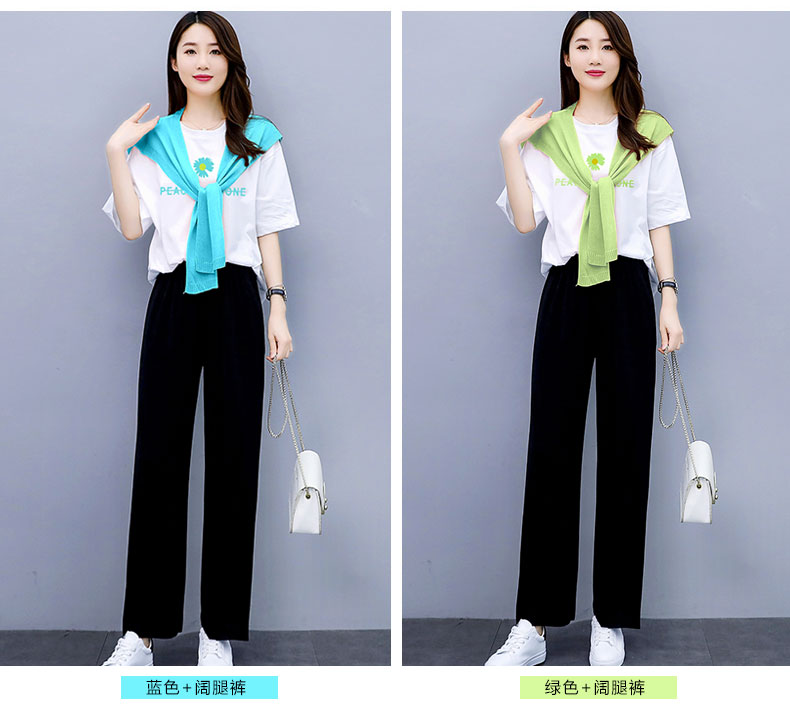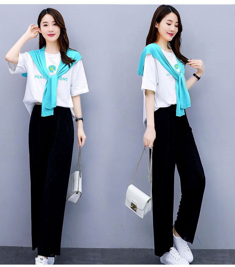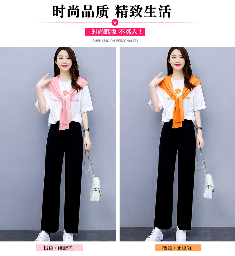 WZNH-QYQX2024新款休闲套装女阔腿裤+T恤+披肩三件套韩版时尚气质减龄必备