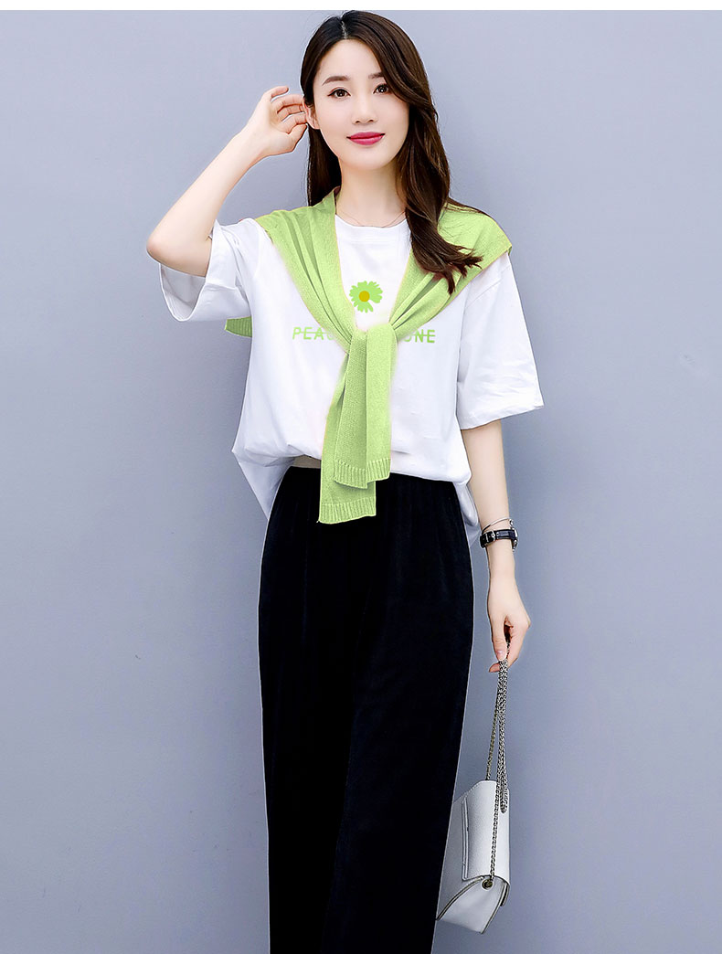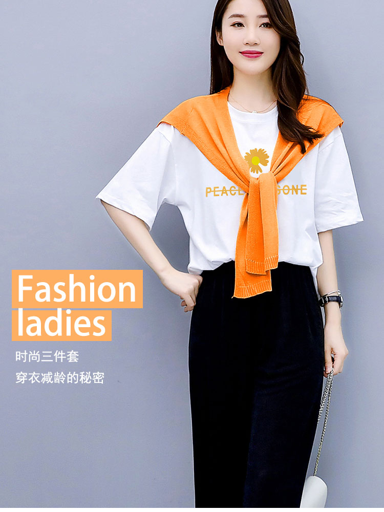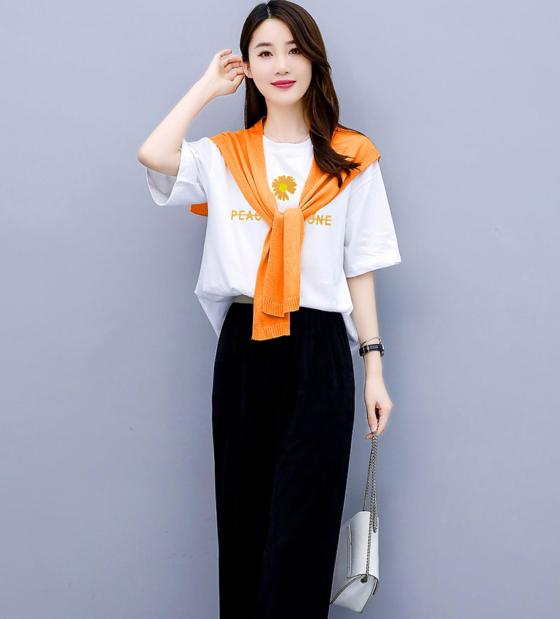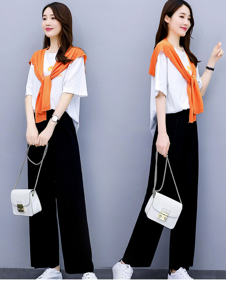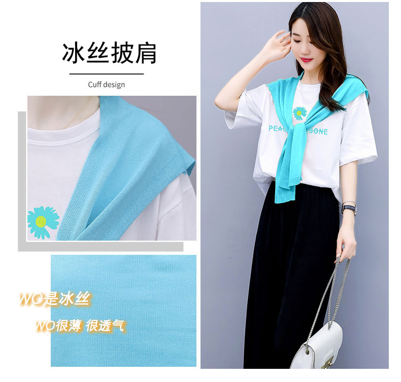 WZNH-QYQX2024新款休闲套装女阔腿裤+T恤+披肩三件套韩版时尚气质减龄必备