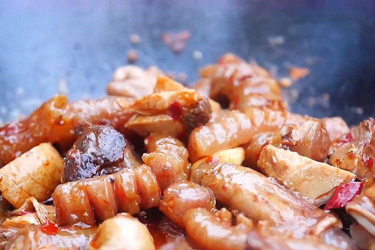(3)锅中倒入花生油,待油烧热后将切好的牛鞭放入油中微炒,期间加少许料酒及酱油;
