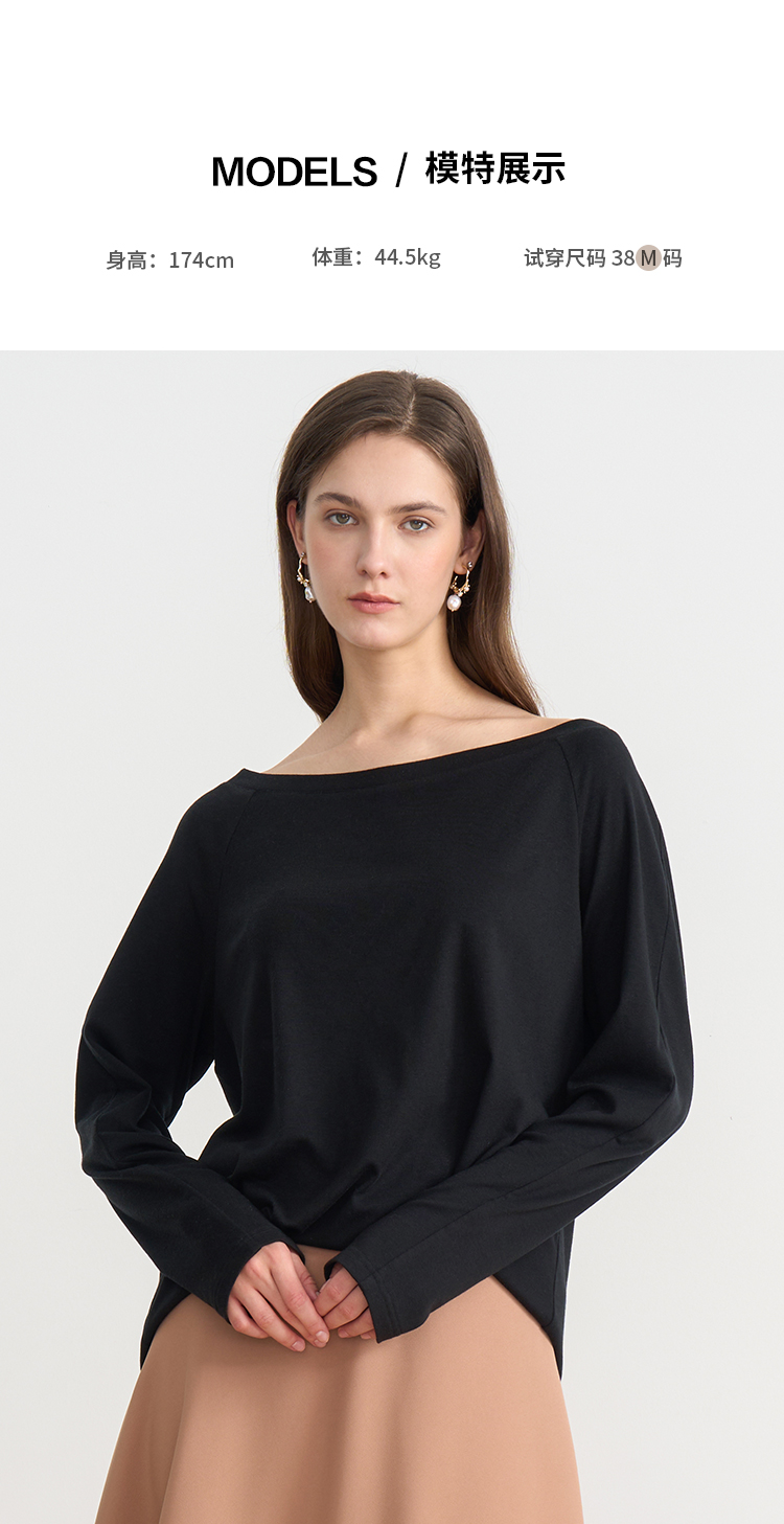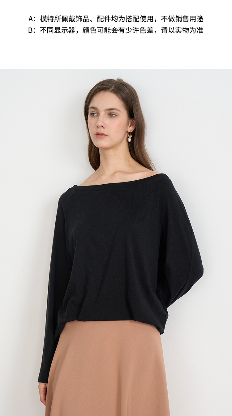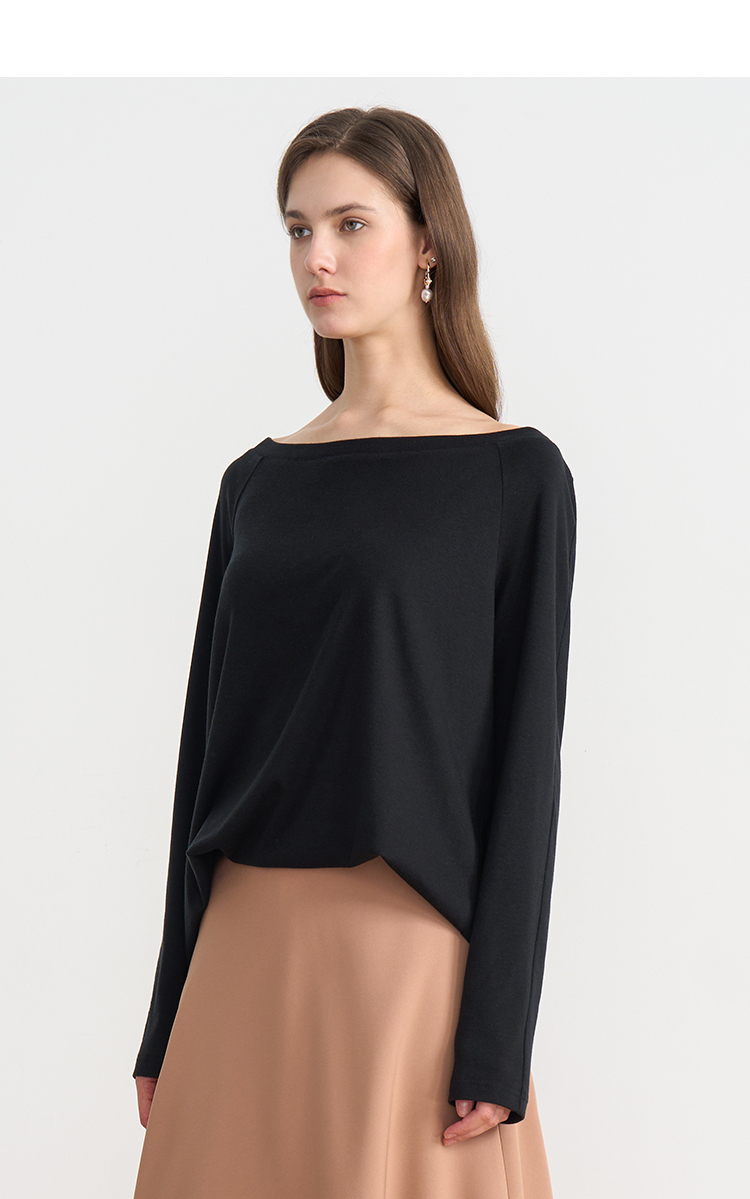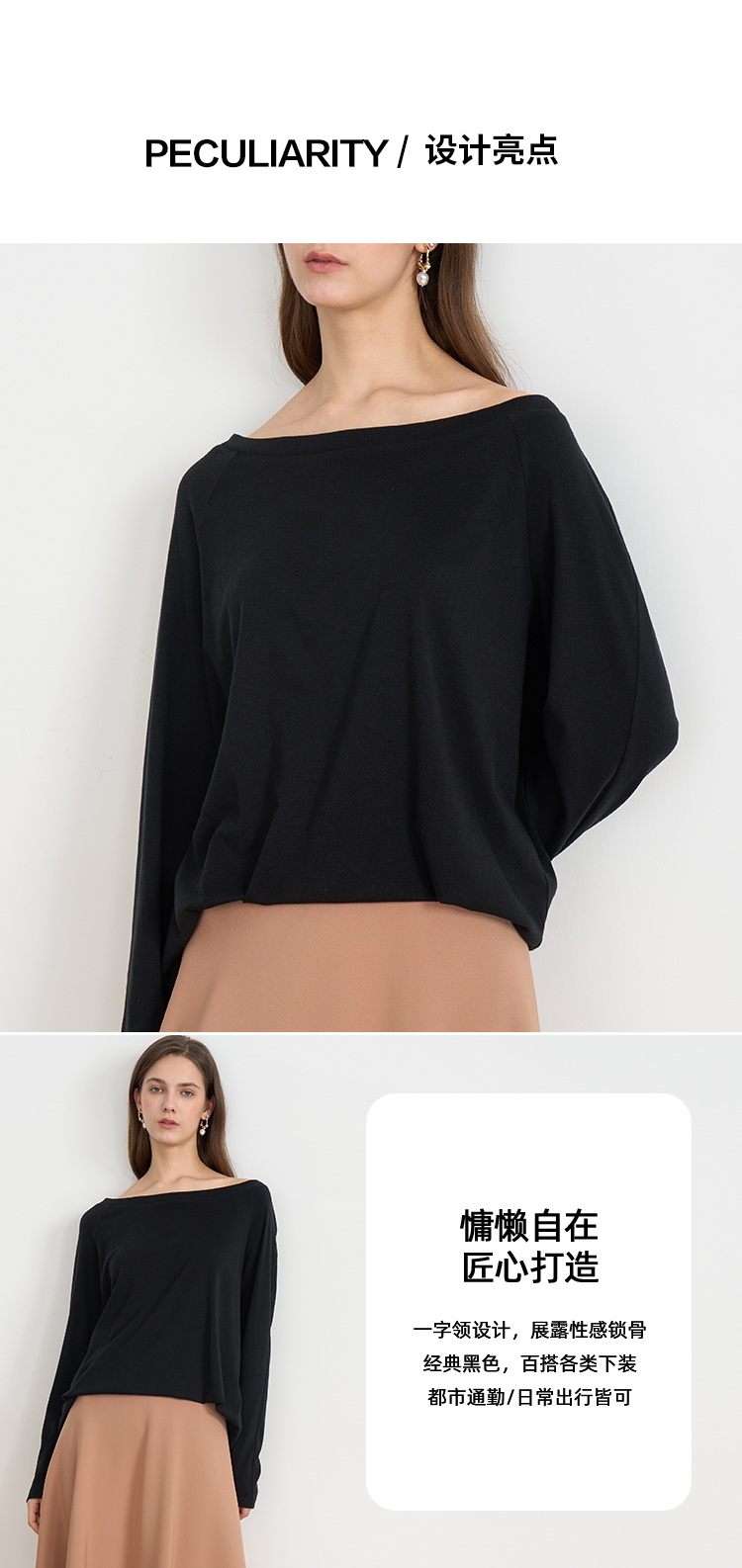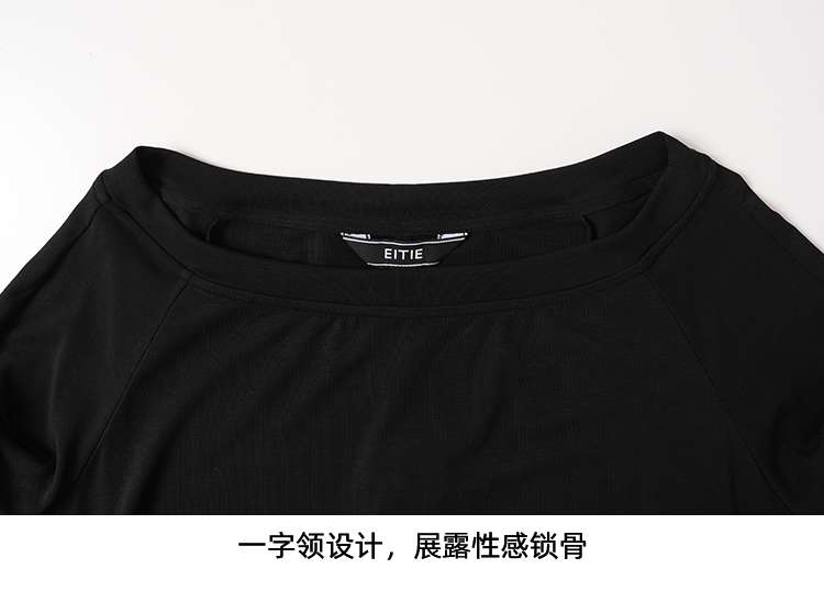 EITIE爱特爱简约黑色慵懒宽松一字领莱赛尔长袖T恤衫2025秋季新款小上衣C2513820