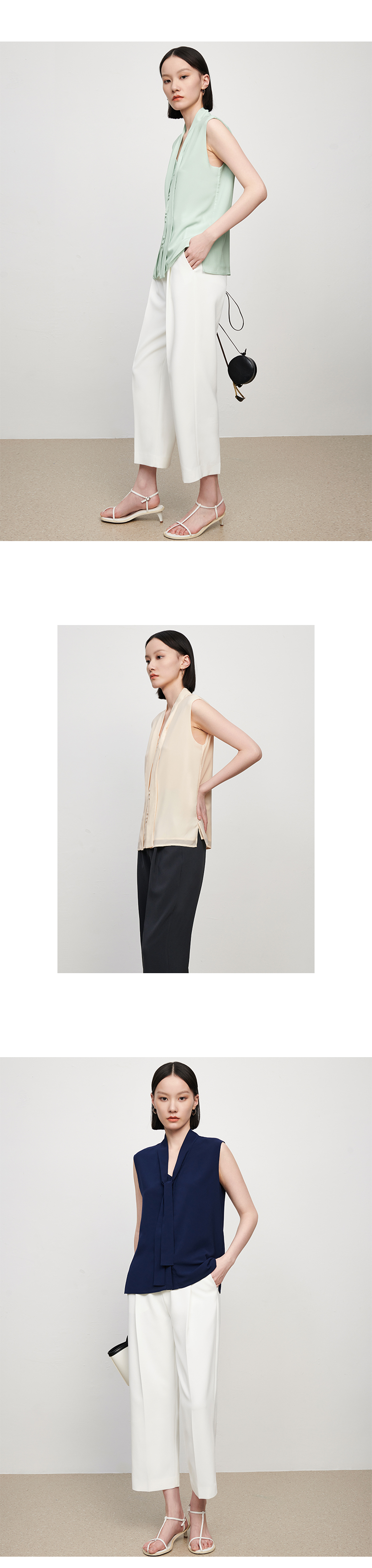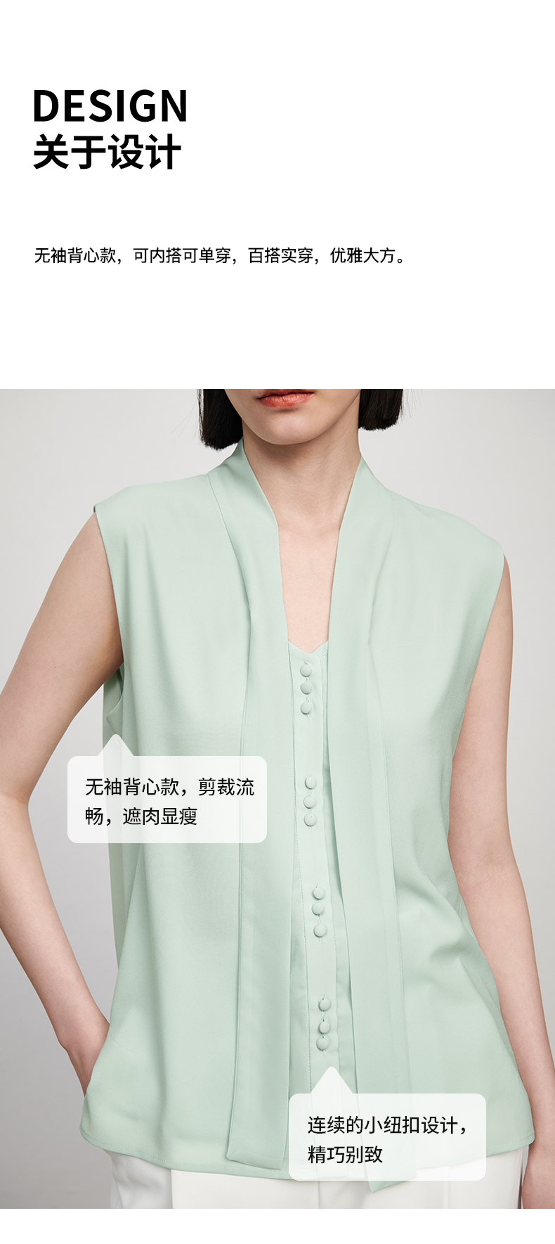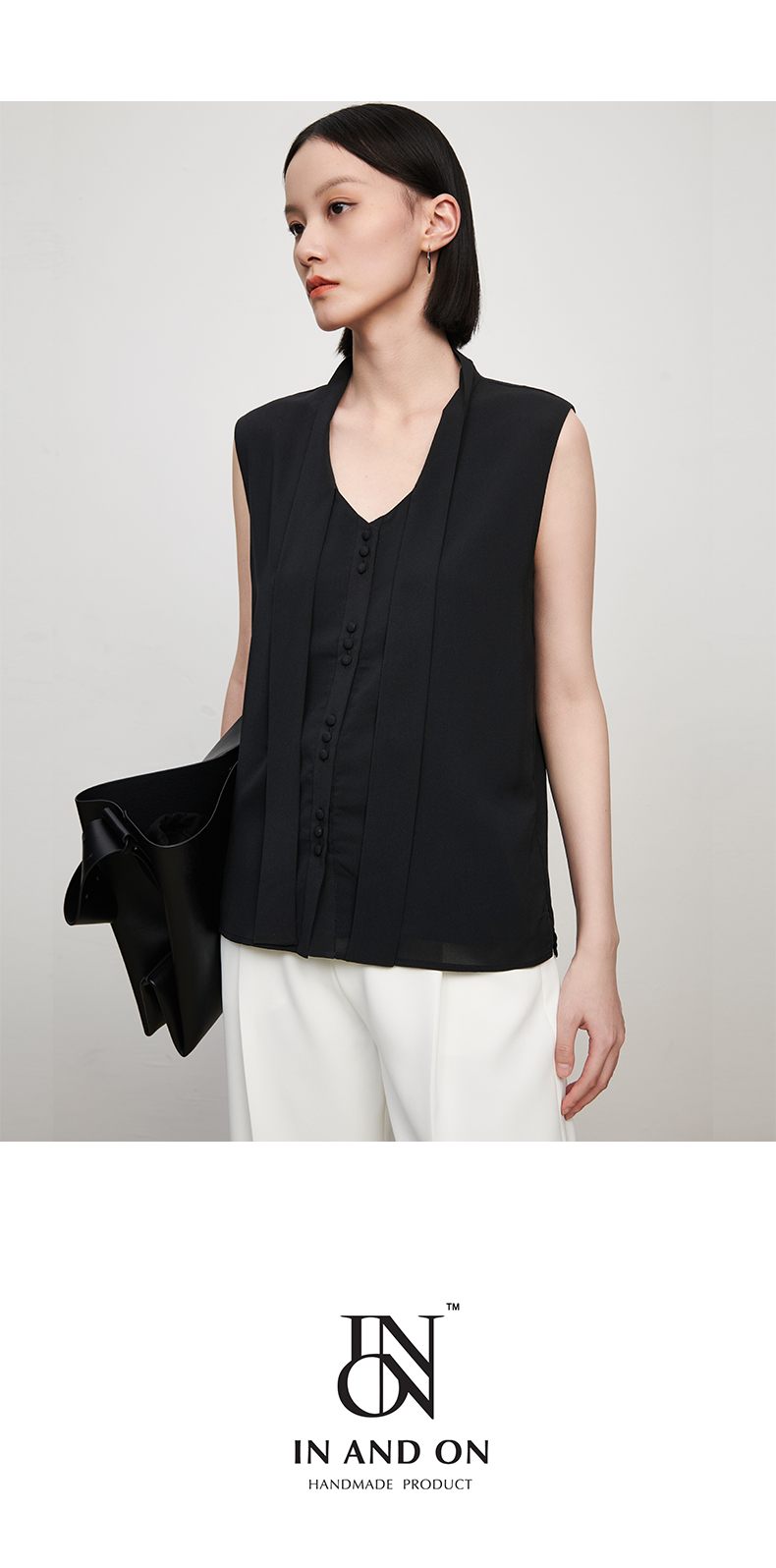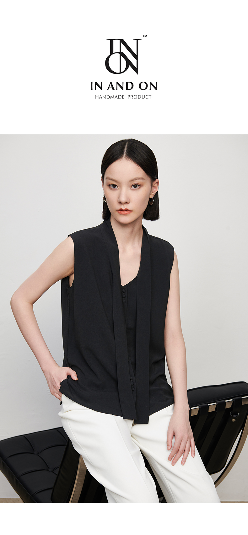 IN AND ON21210夏季新款设计感丝滑飘带衬衫女V领丝质无袖背心上衣