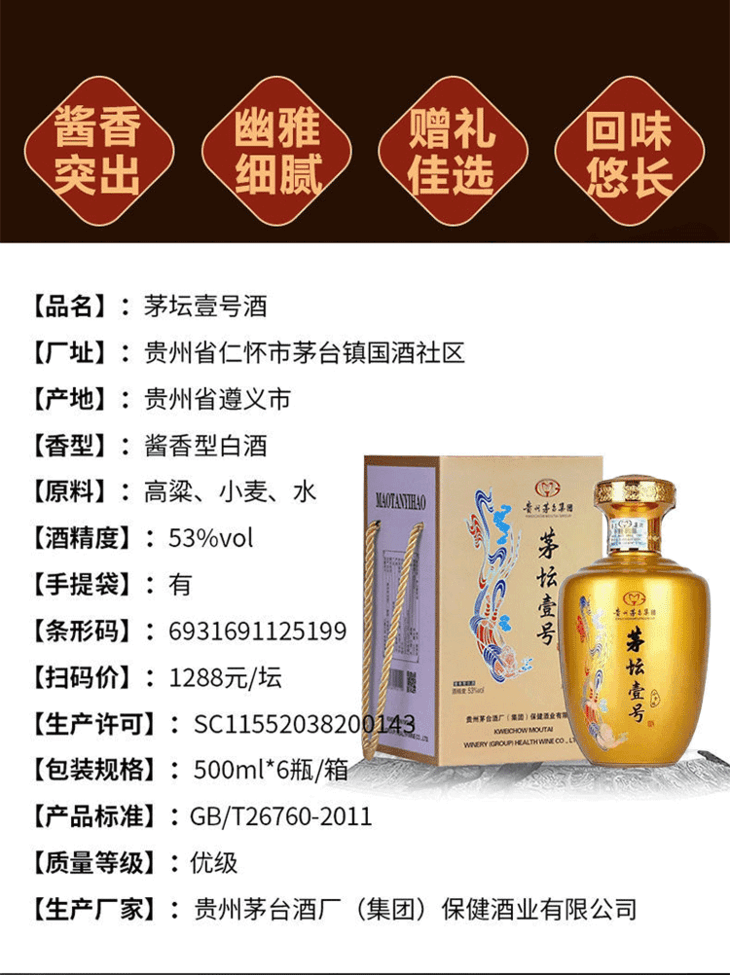 【推荐】茅台集团 茅坛壹号 酱香型 53度 500ml 单瓶装
