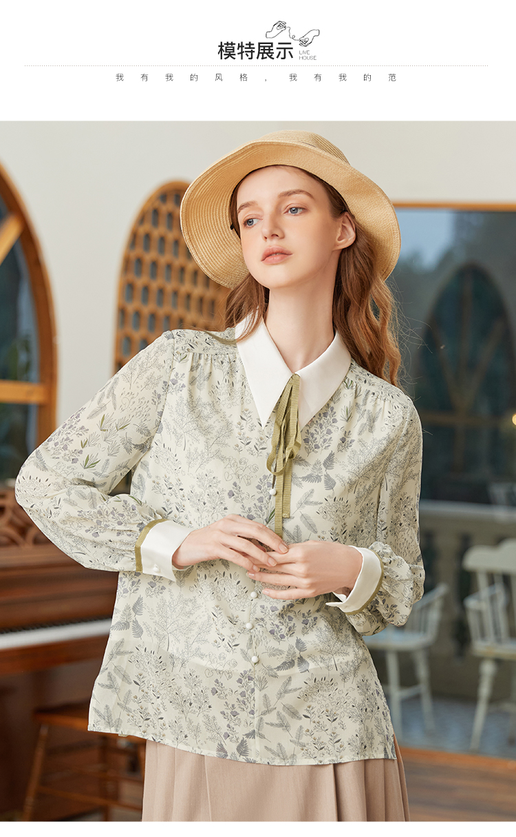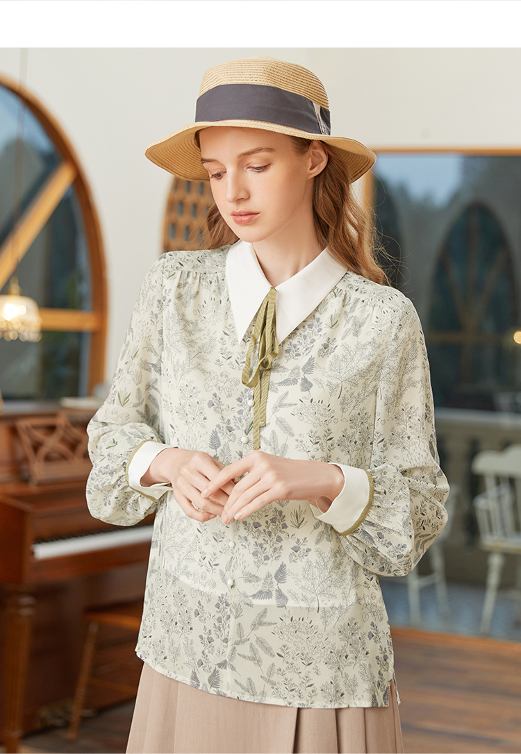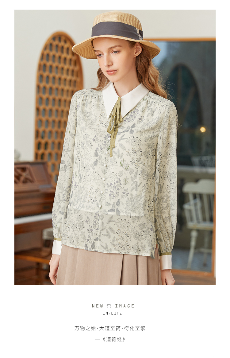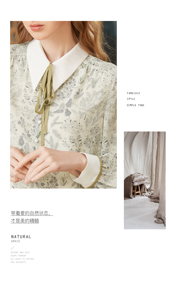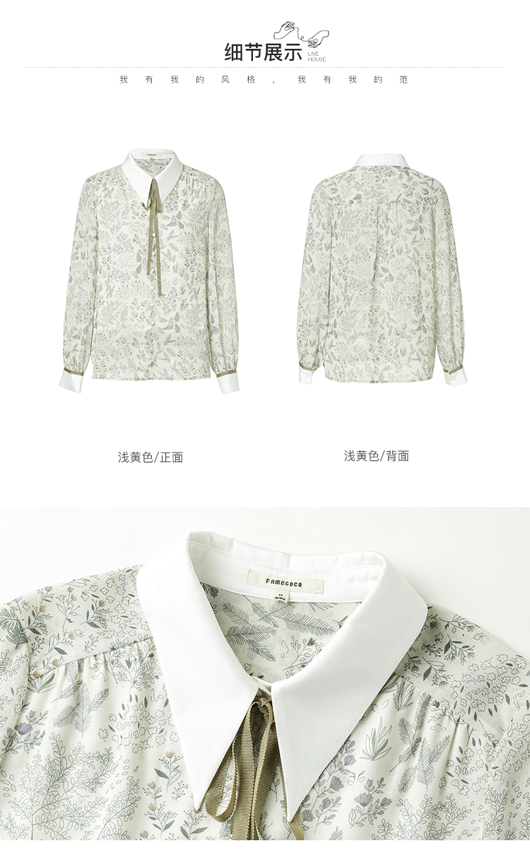famecoco范可儿尖领系带雪纺衬衫女春款显瘦优雅印花上衣FAB1BA014