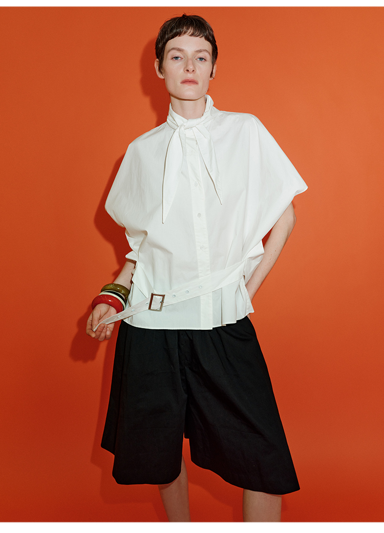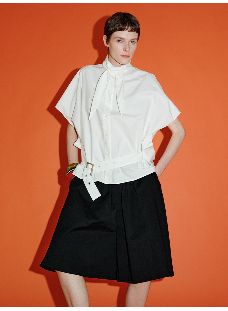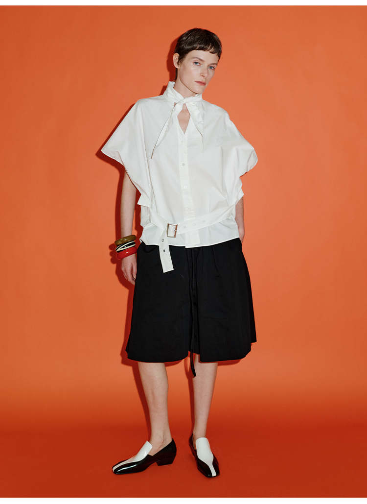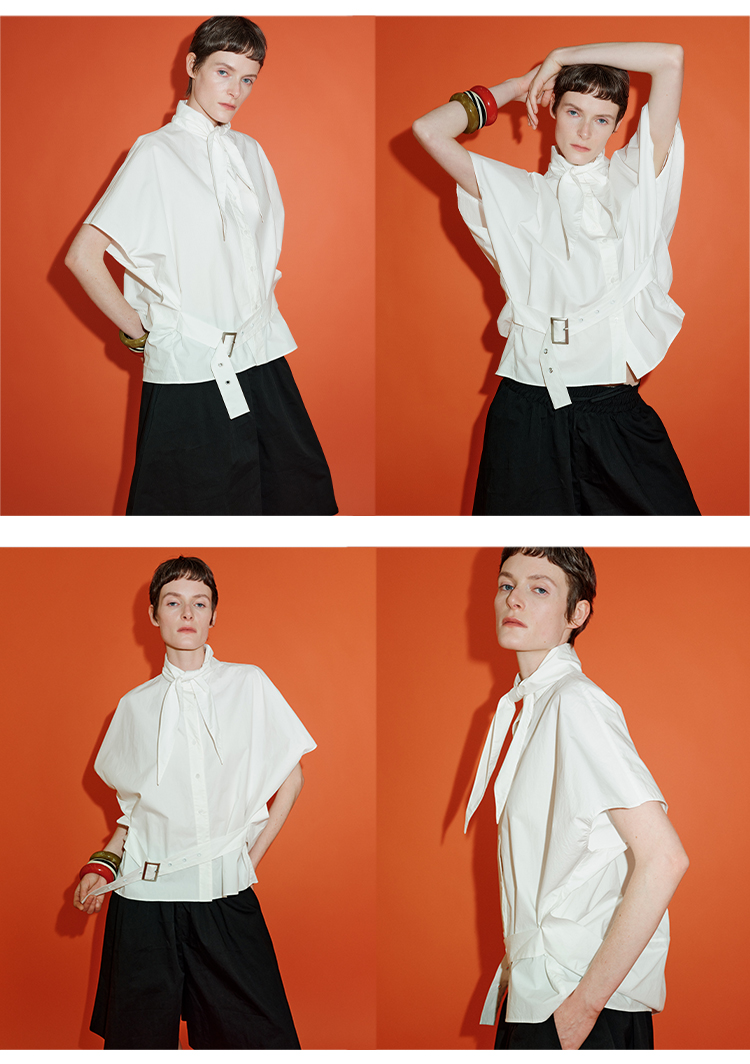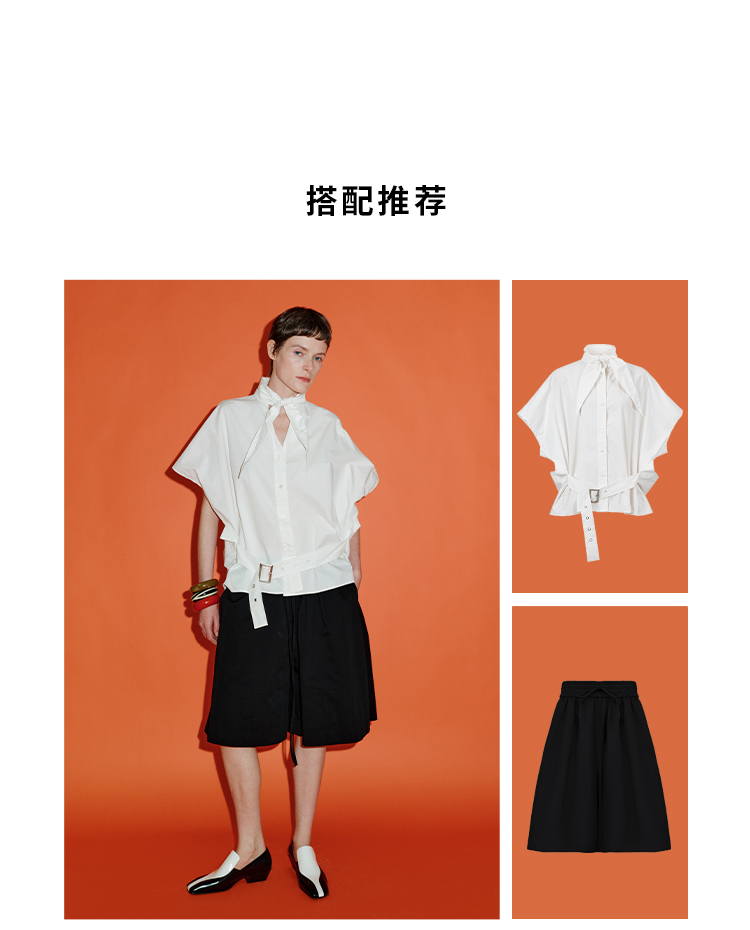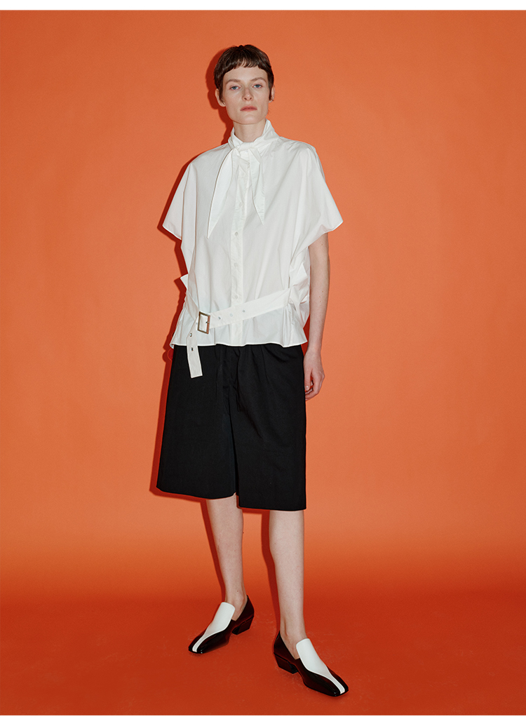 HIDEMI绑带剪刀领设计感大廓形腰带式短袖衬衫上衣