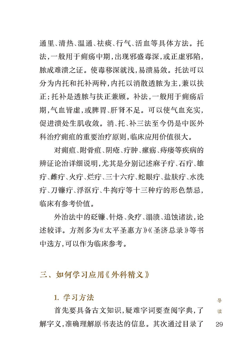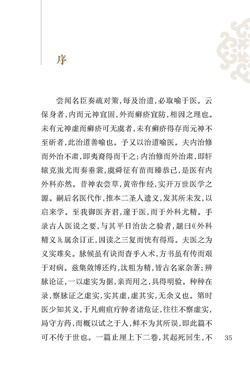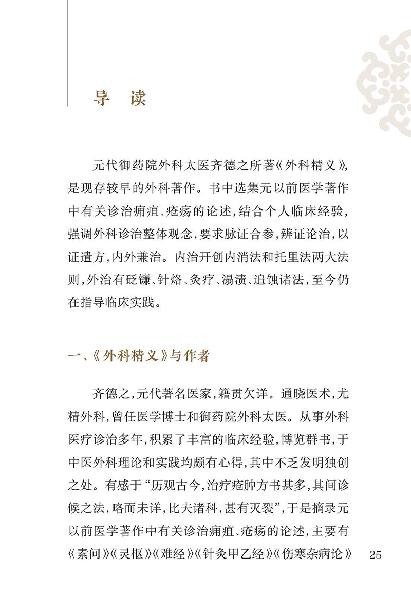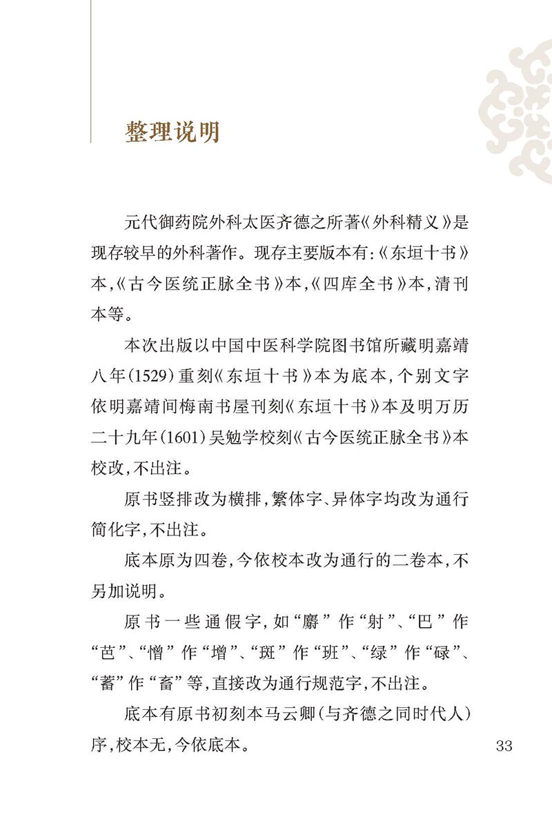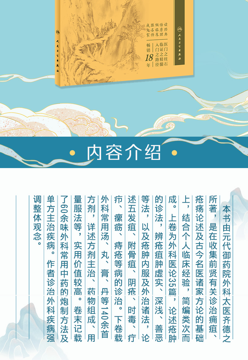 本书由元代御药院外科太医齐德之所著,是在收集前贤有关诊治痈疽、疮疡论述及古今名医诸家方论的基础上,结合个人临床经验,简编类次而成,成书于1335年。2卷。上卷为外科医论35篇,论述疮肿的诊法,辨疮疽肿虚实、深浅、善恶等法,以及疮肿内服及外治诸法,论述五发疽、附骨疽、阴疮、时毒、疔疖、瘰疬、痔疮等病的诊治。下卷载外科常用汤、丸、膏、丹等140余首方剂,详述方剂主治、药物组成、用量服法等,实用价值较高。卷末记载了60余味外科常用中药的炮制方法及单方主治疾病。作者诊治外科疾病强调整体观念,脉证合参,内治开创内消法和托里法两大法则,外治有砭镰、针烙、灸疗、溻渍、追蚀诸法,对后世外科的发展有较大影响,至今仍在指导临床实践。本次整理,精选善本,书前增加导读,书末附有方药索引,方便读者查阅。本书不仅是外科医生的临床必备书,也是临床各科医生的重要参考书。