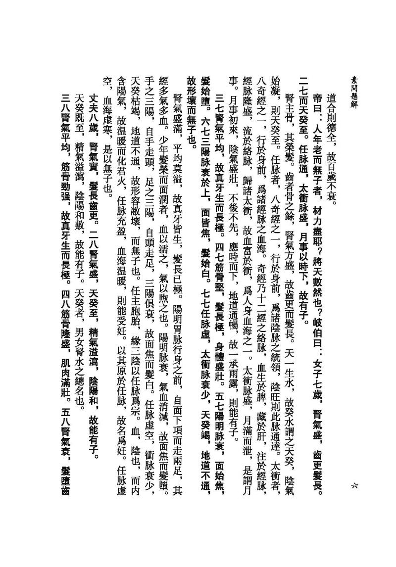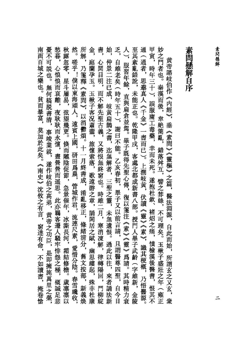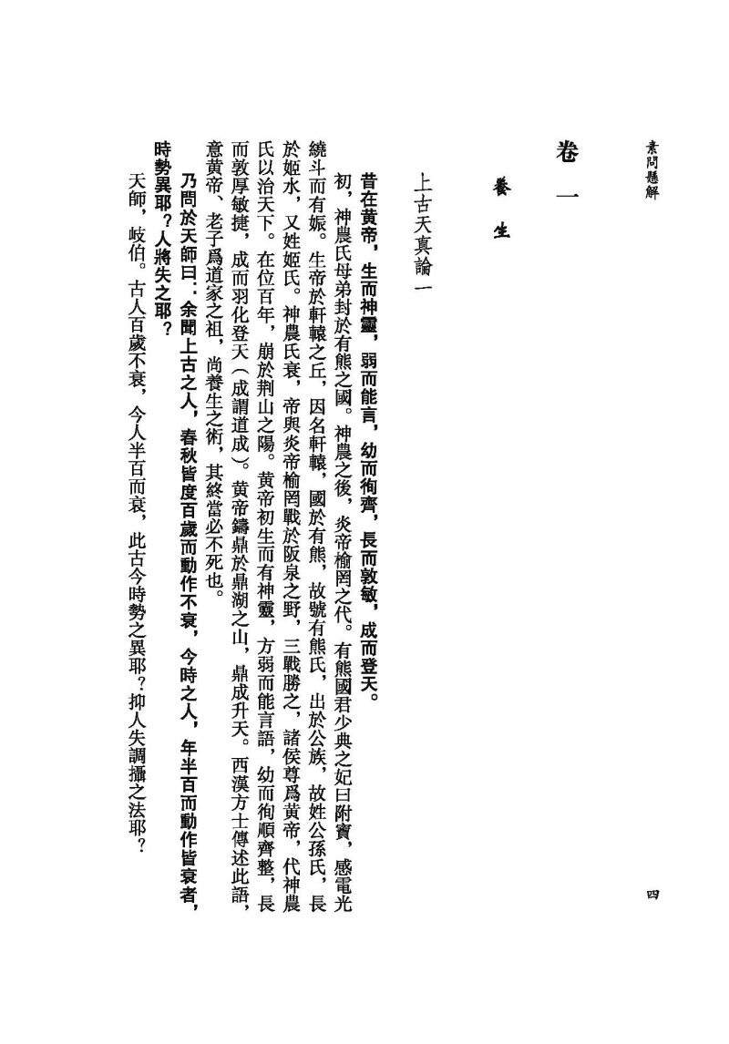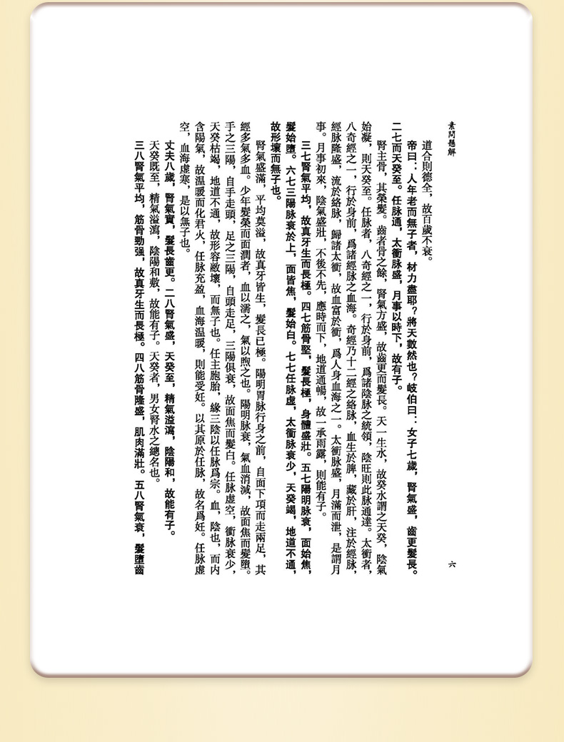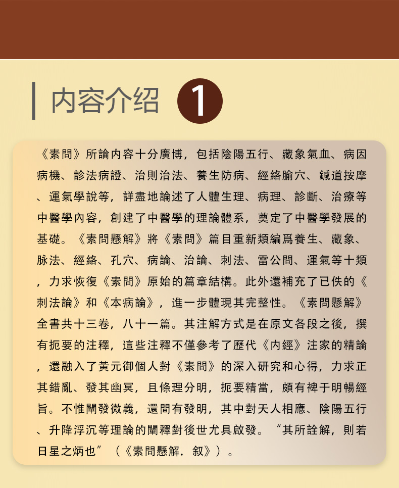 《素問》所論内容十分廣博,包括陰陽五行、藏象氣血、病因病機、診法病證、治則治法、養生防病、經絡腧穴、鍼道按摩、運氣學說等,詳盡地論述了人體生理、病理、診斷、治療等中醫學內容,創建了中醫學的理論體系,奠定了中醫學發展的基礎。《素問懸解》將《素問》篇目重新類編爲養生、藏象、脉法、經絡、孔穴、病論、治論、刺法、雷公問、運氣等十類,力求恢復《素問》原始的篇章結構。此外還補充了已佚的《刺法論》和《本病論》,進一步體現其完整性。《素問懸解》全書共十三卷,八十一篇。其注解方式是在原文各段之後,撰有扼要的注釋,這些注釋不僅參考了歷代《内經》注家的精論,還融入了黃元御個人對《素問》的深入研究和心得,力求正其錯亂、發其幽冥,且條理分明,扼要精當,頗有裨于明暢經旨。不惟闡發微義,還間有發明,其中對天人相應、陰陽五行、升降浮沉等理論的闡釋對後世尤具啟發。“其所詮解,則若日星之炳也”(《素問懸解.叙》)。