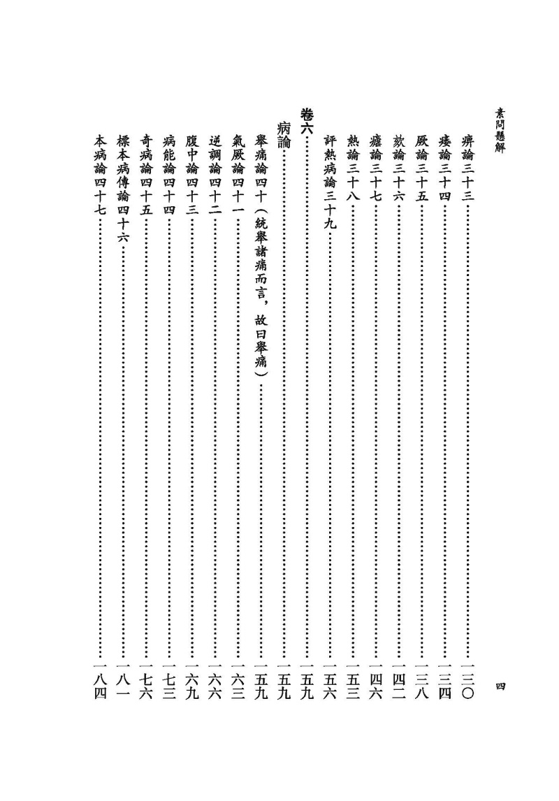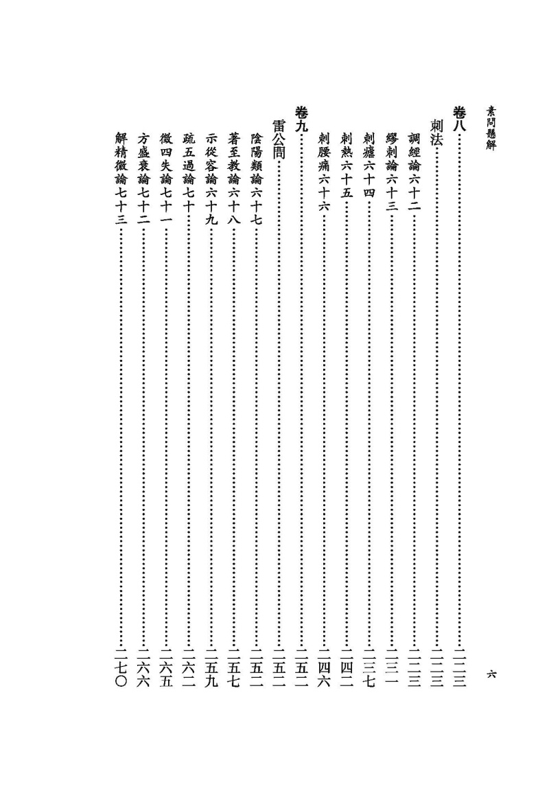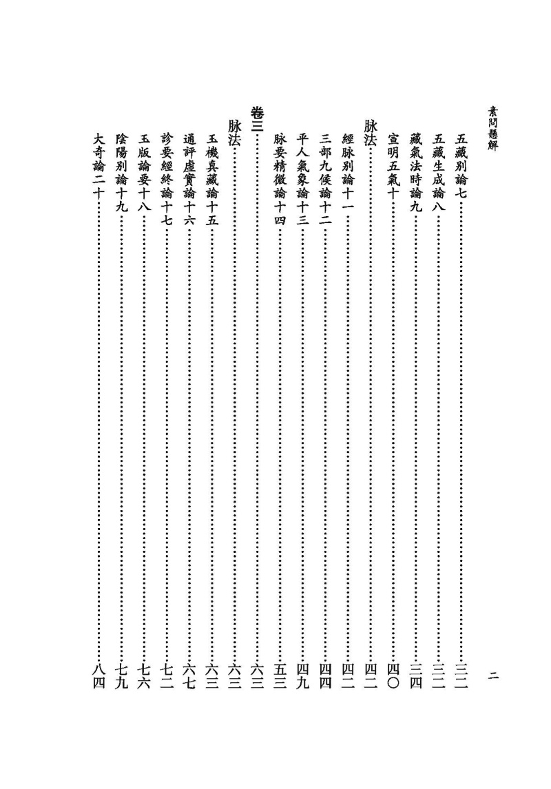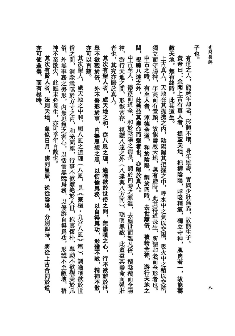 《素問》所論内容十分廣博,包括陰陽五行、藏象氣血、病因病機、診法病證、治則治法、養生防病、經絡腧穴、鍼道按摩、運氣學說等,詳盡地論述了人體生理、病理、診斷、治療等中醫學內容,創建了中醫學的理論體系,奠定了中醫學發展的基礎。《素問懸解》將《素問》篇目重新類編爲養生、藏象、脉法、經絡、孔穴、病論、治論、刺法、雷公問、運氣等十類,力求恢復《素問》原始的篇章結構。此外還補充了已佚的《刺法論》和《本病論》,進一步體現其完整性。《素問懸解》全書共十三卷,八十一篇。其注解方式是在原文各段之後,撰有扼要的注釋,這些注釋不僅參考了歷代《内經》注家的精論,還融入了黃元御個人對《素問》的深入研究和心得,力求正其錯亂、發其幽冥,且條理分明,扼要精當,頗有裨于明暢經旨。不惟闡發微義,還間有發明,其中對天人相應、陰陽五行、升降浮沉等理論的闡釋對後世尤具啟發。“其所詮解,則若日星之炳也”(《素問懸解.叙》)。