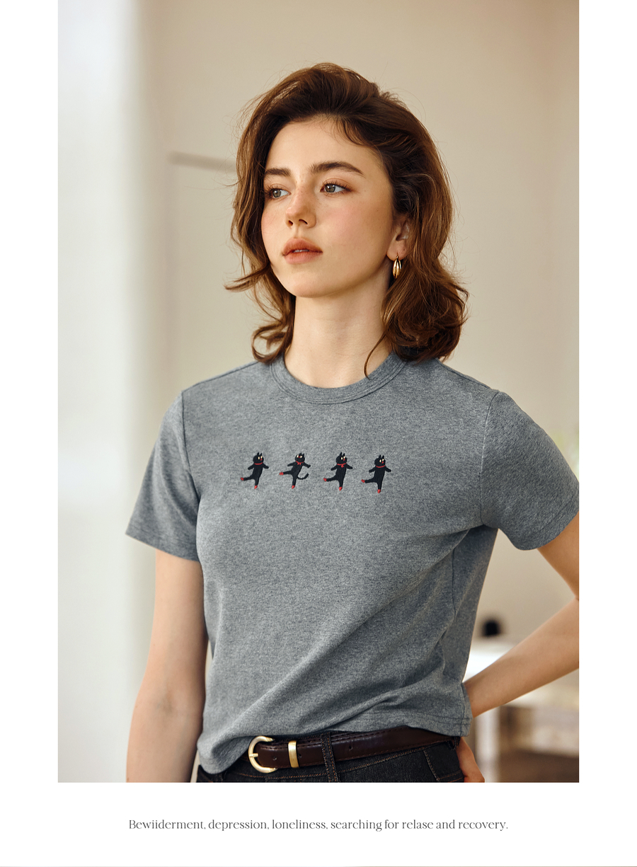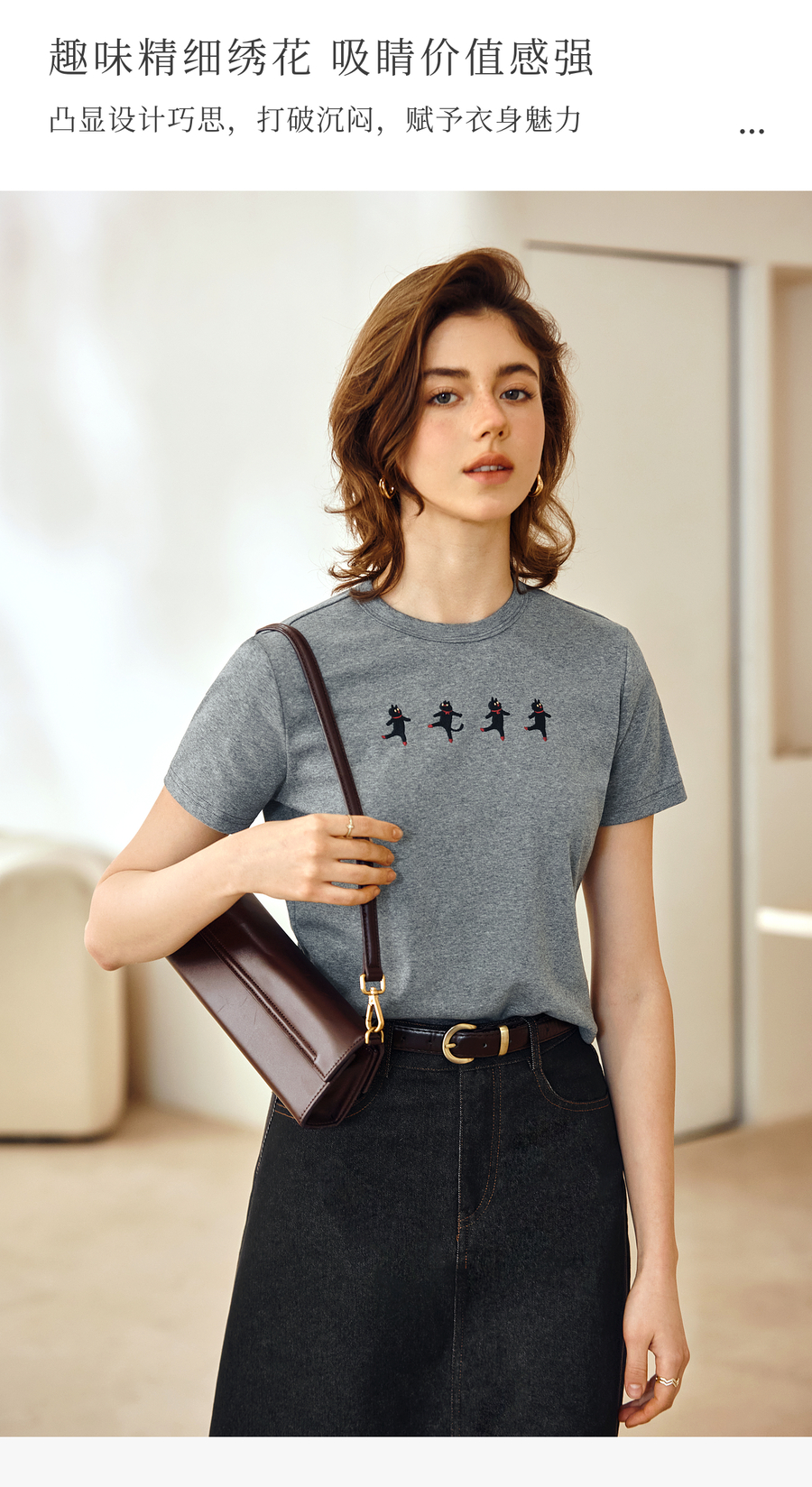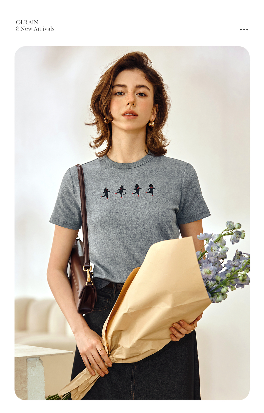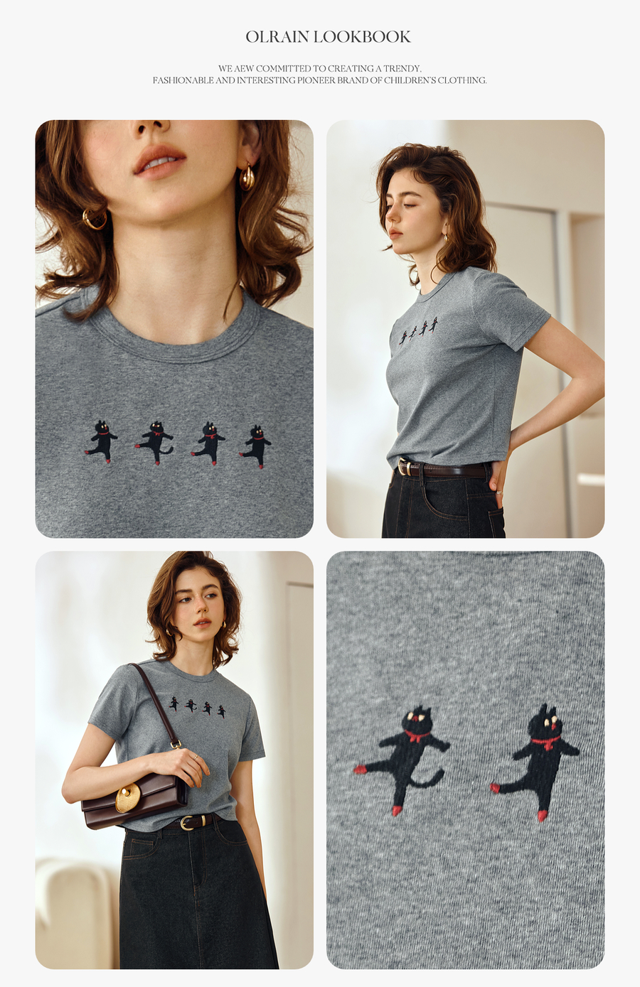 OLrain欧芮儿2025新款夏季猫咪趣味绣花正肩简约短袖T恤女上衣
