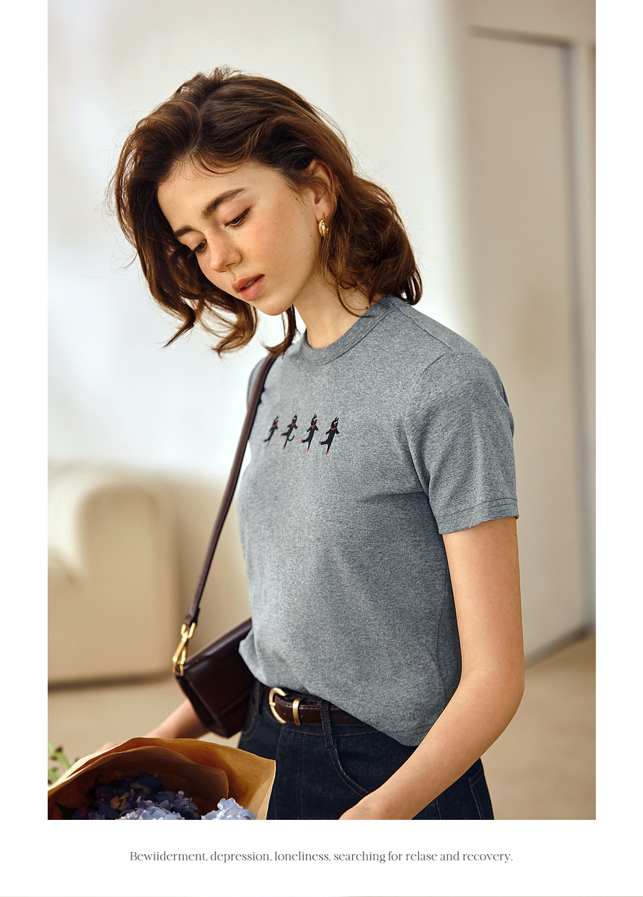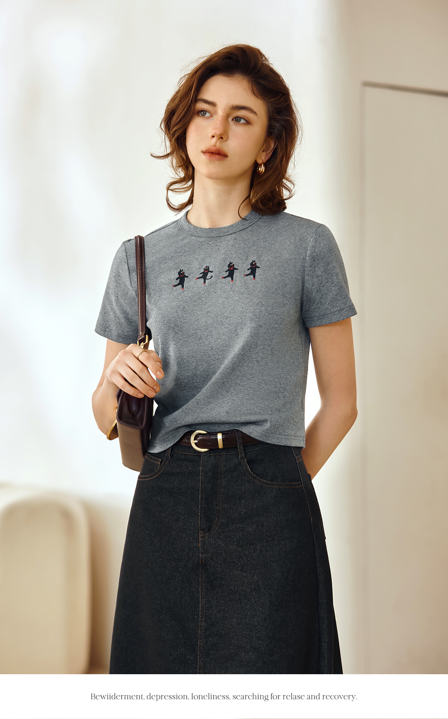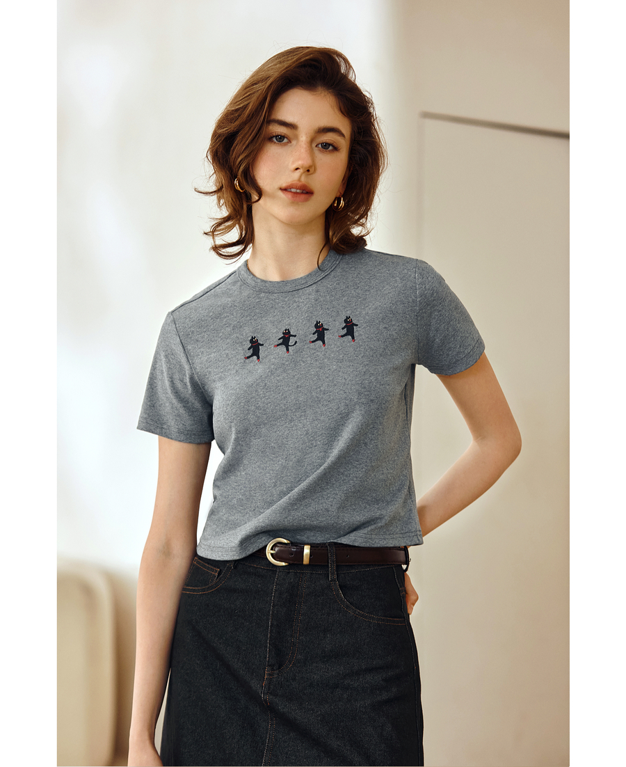OLrain欧芮儿2025新款夏季猫咪趣味绣花正肩简约短袖T恤女上衣