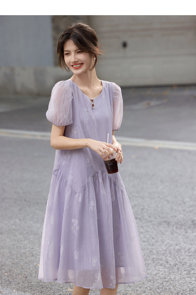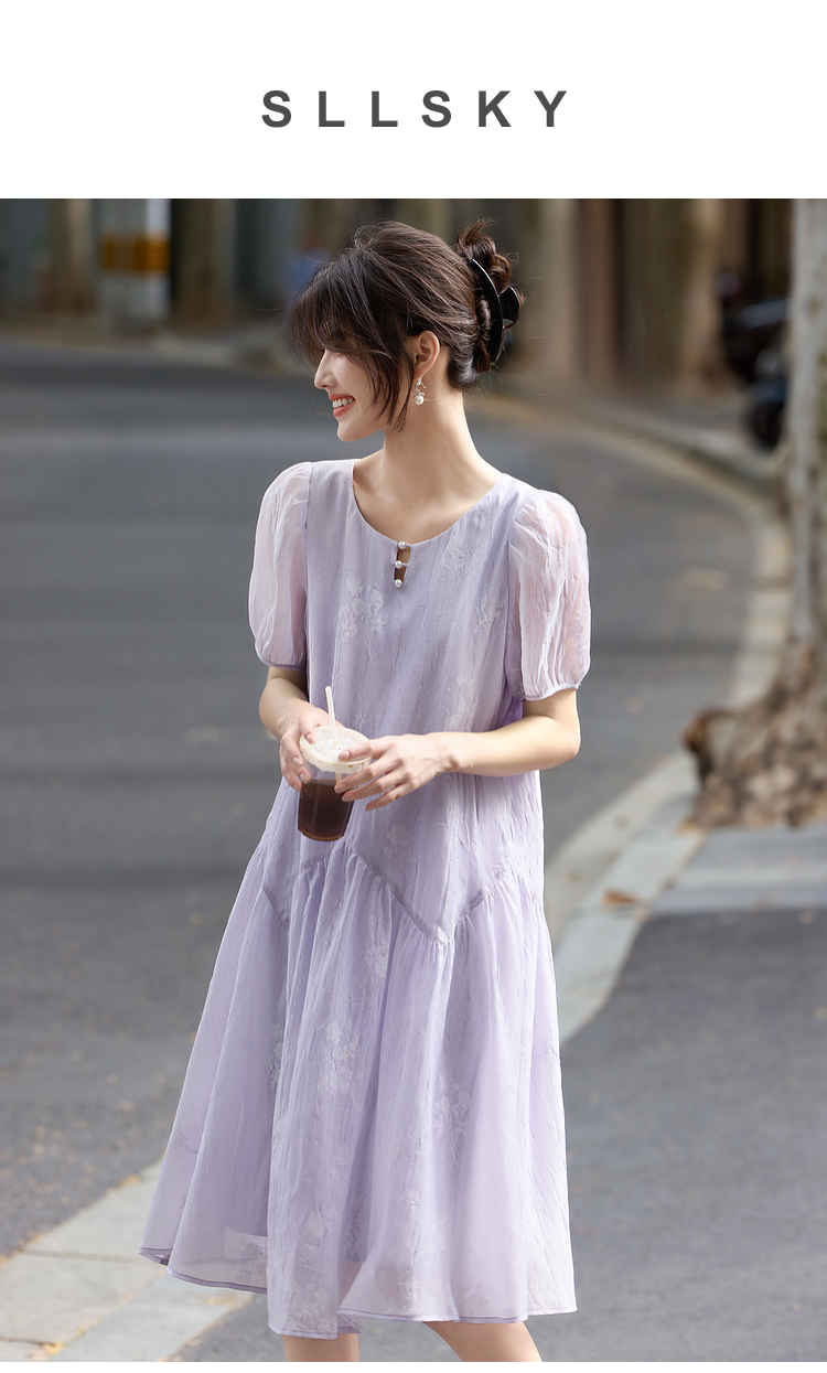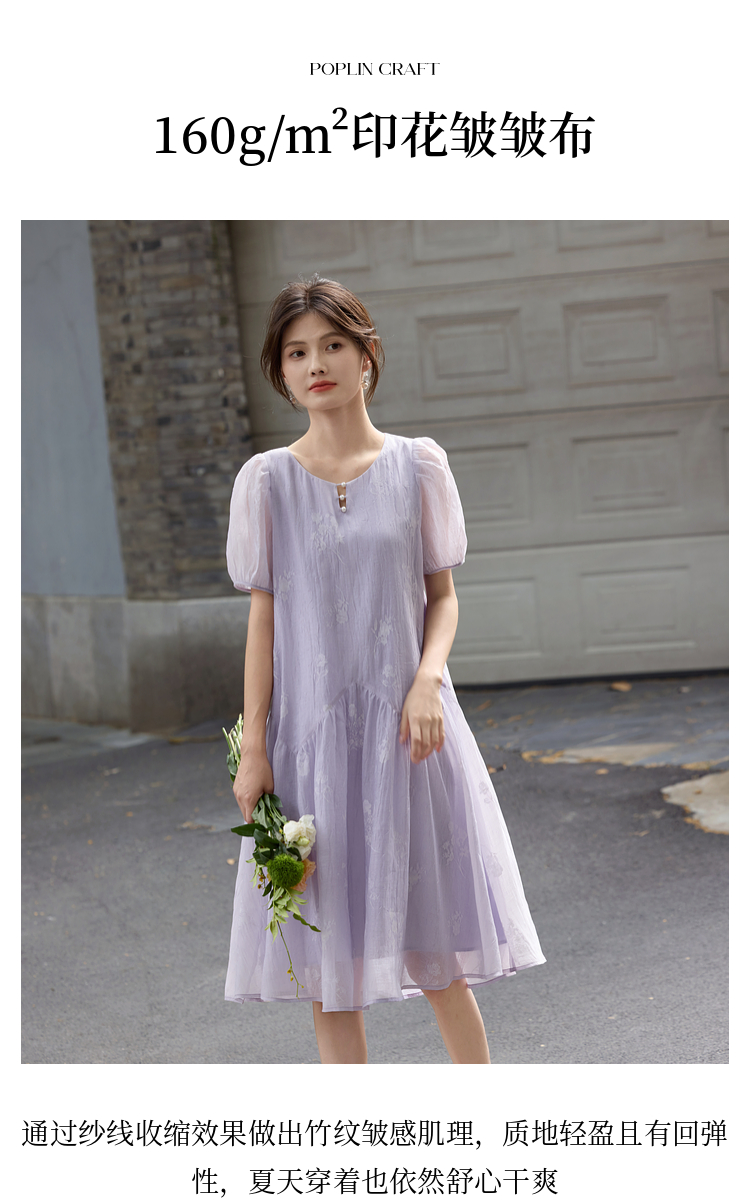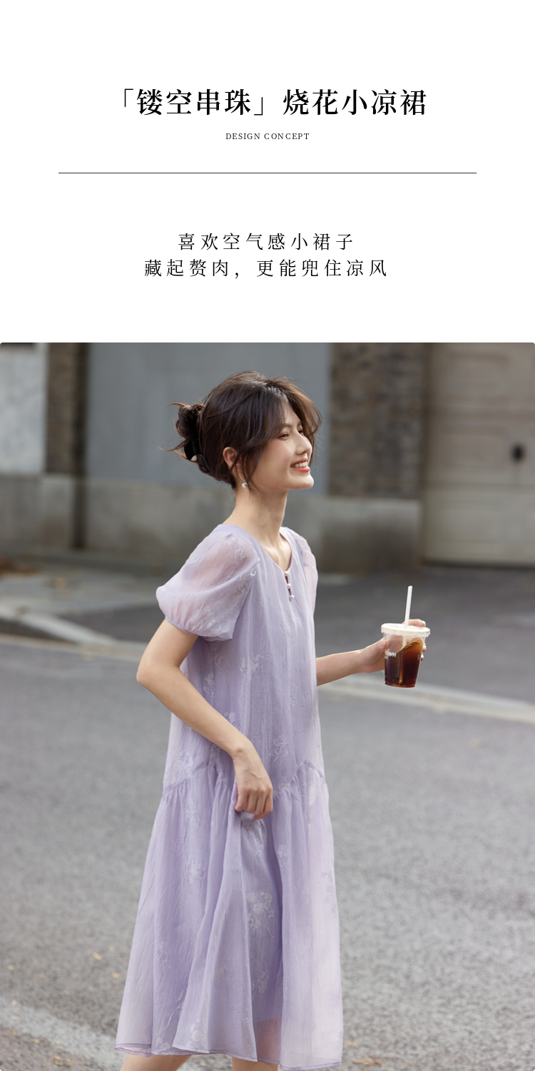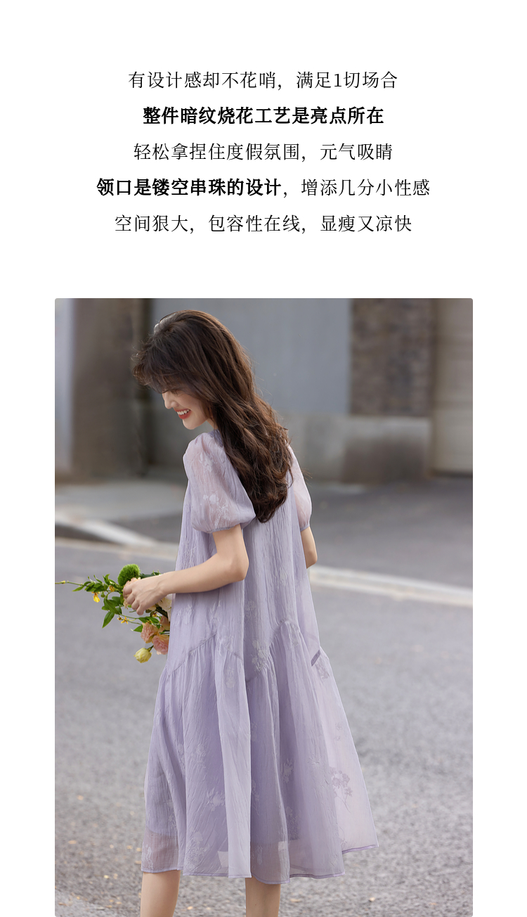 【08/06新品】熙世界度假风紫色连衣裙女夏季法式设计感串珠暗纹烧花泡泡袖裙子