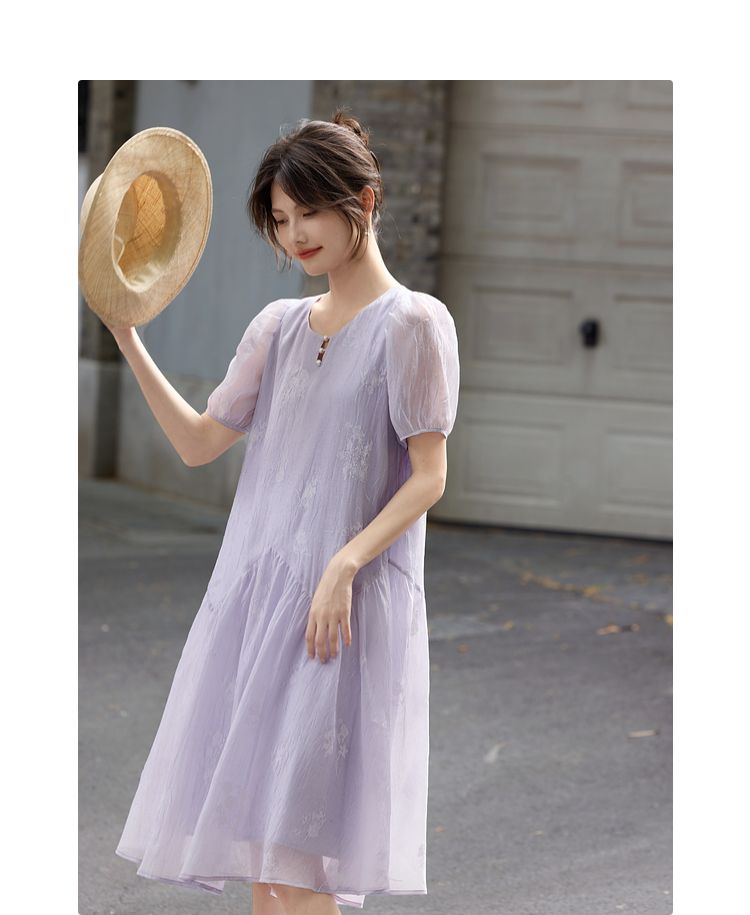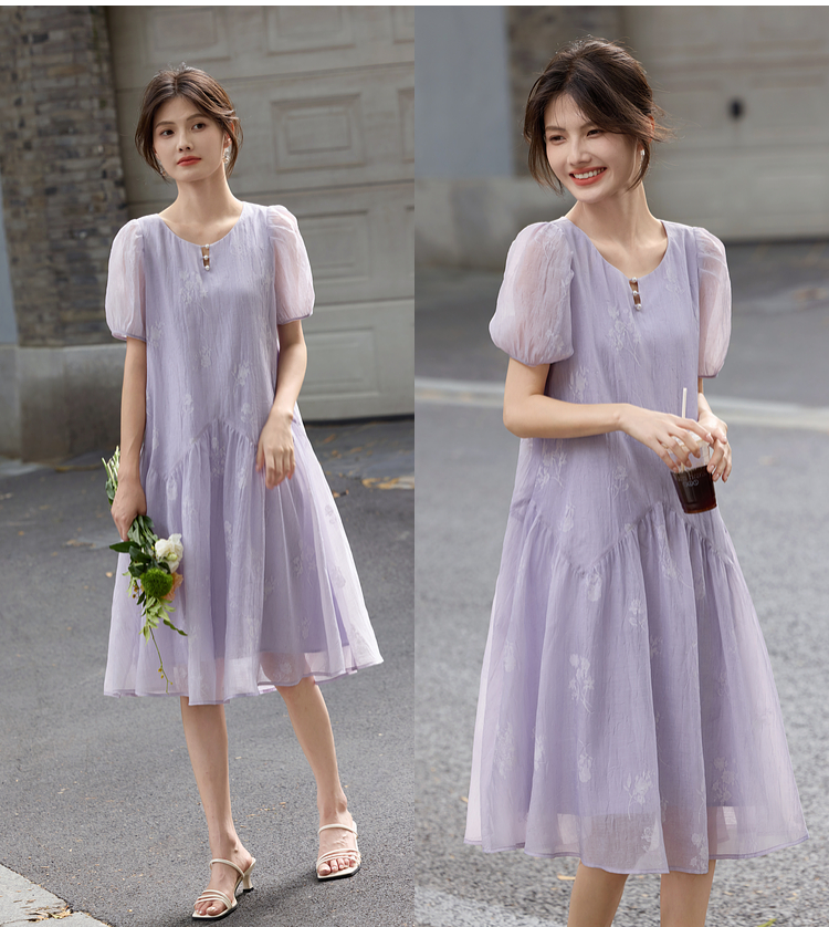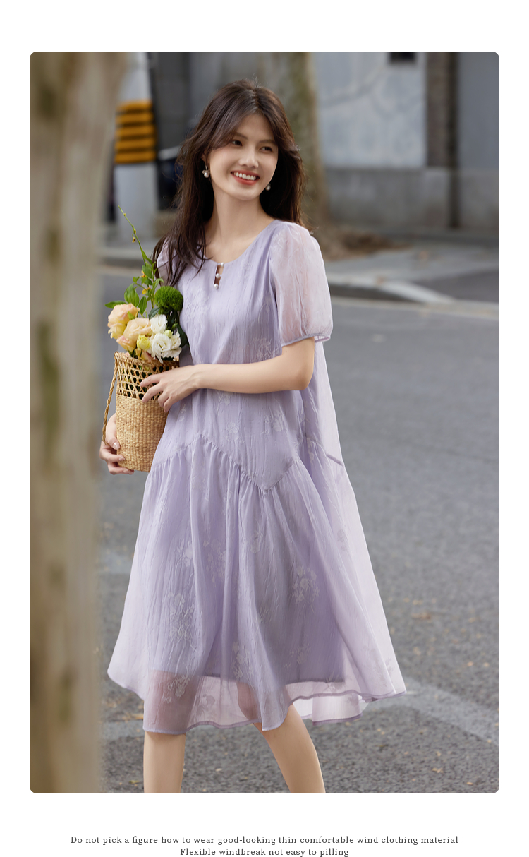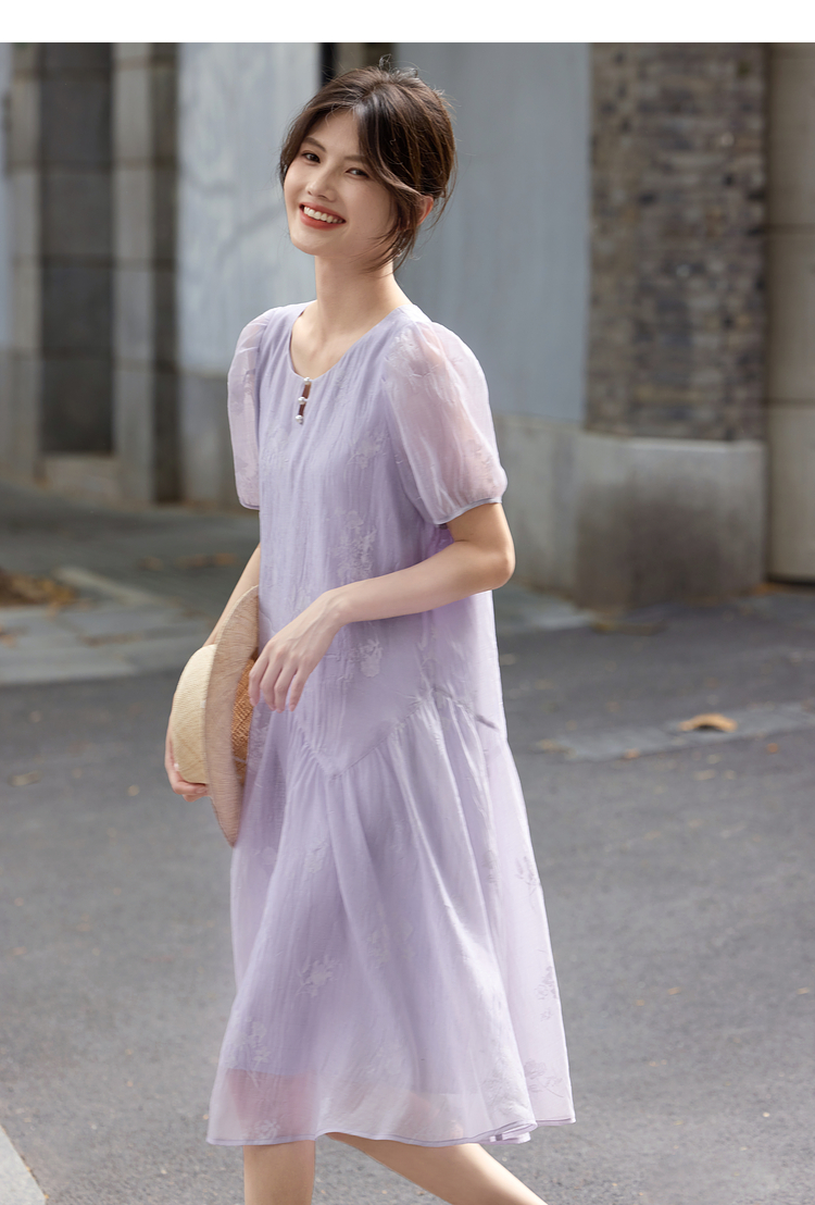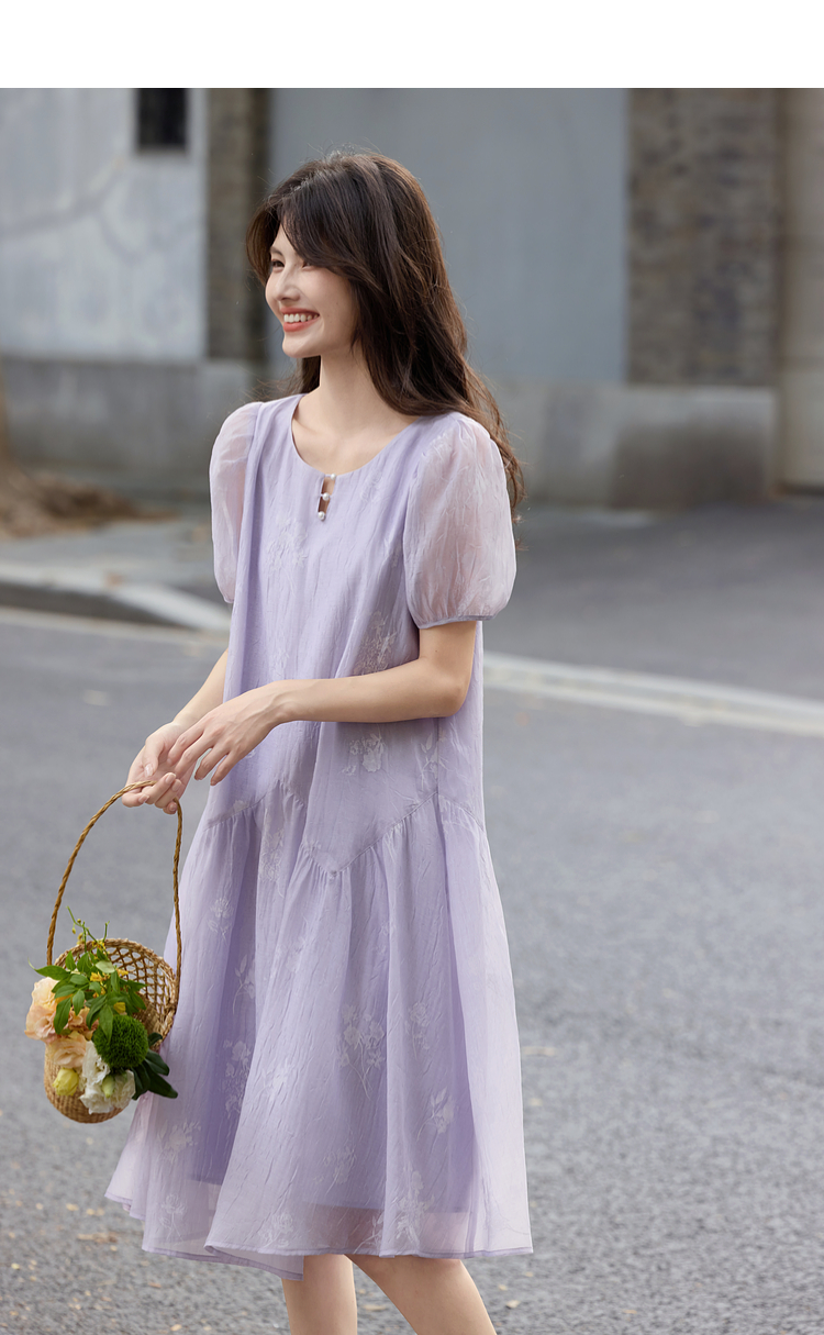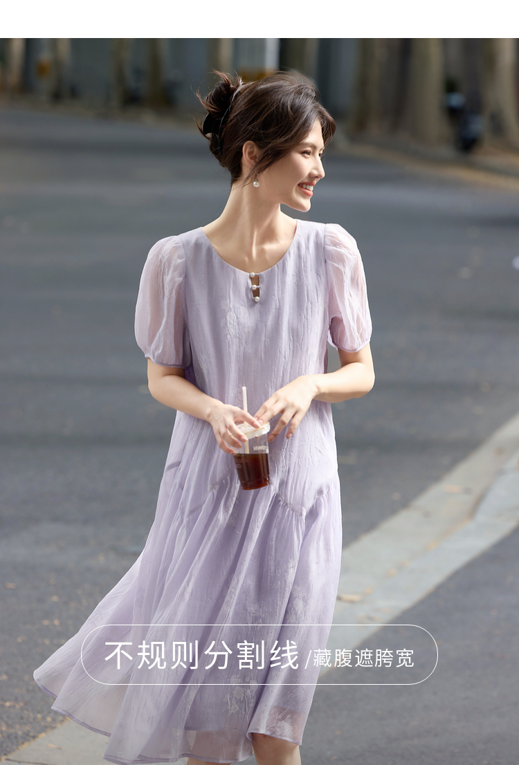 【08/06新品】熙世界度假风紫色连衣裙女夏季法式设计感串珠暗纹烧花泡泡袖裙子