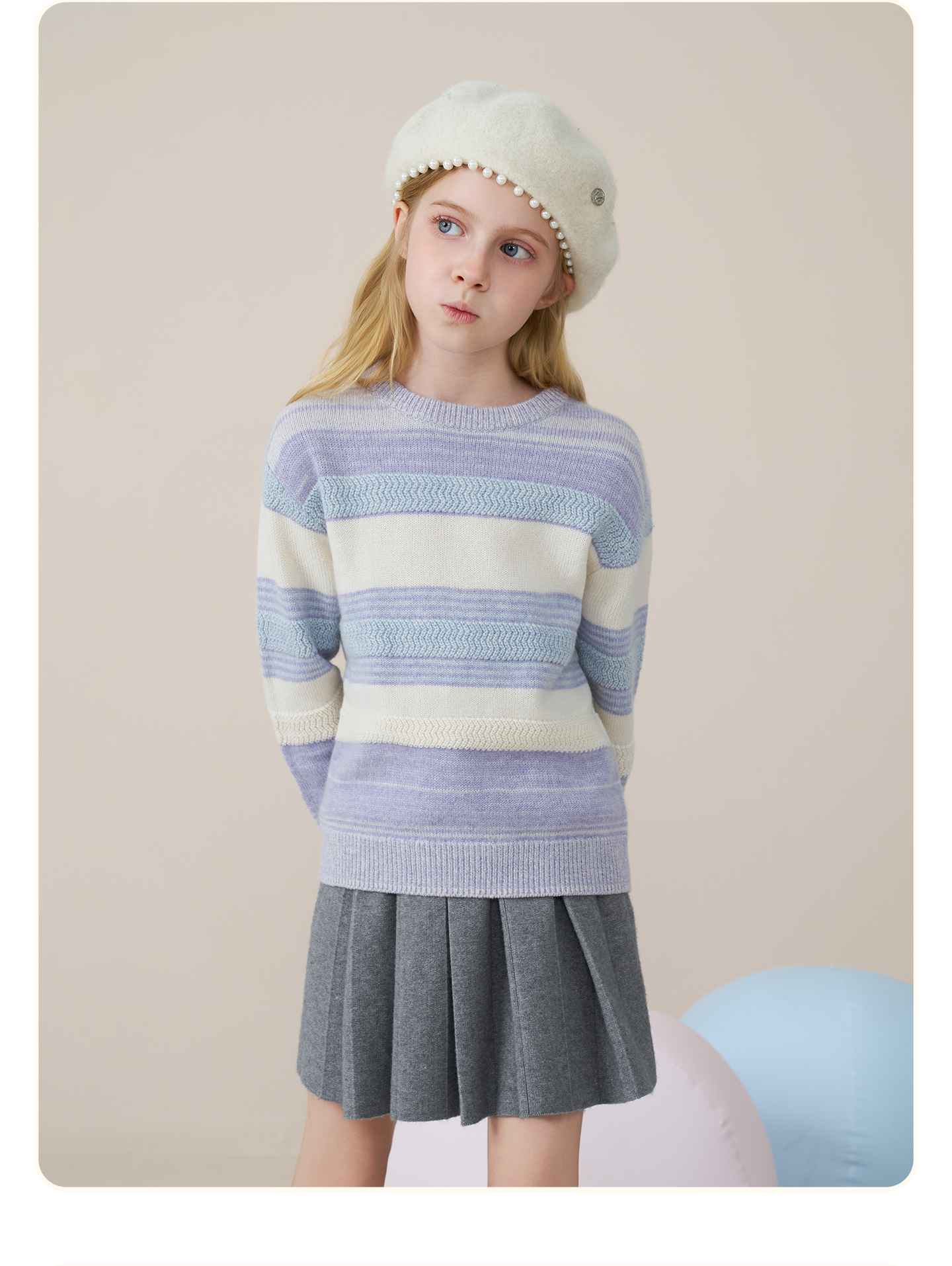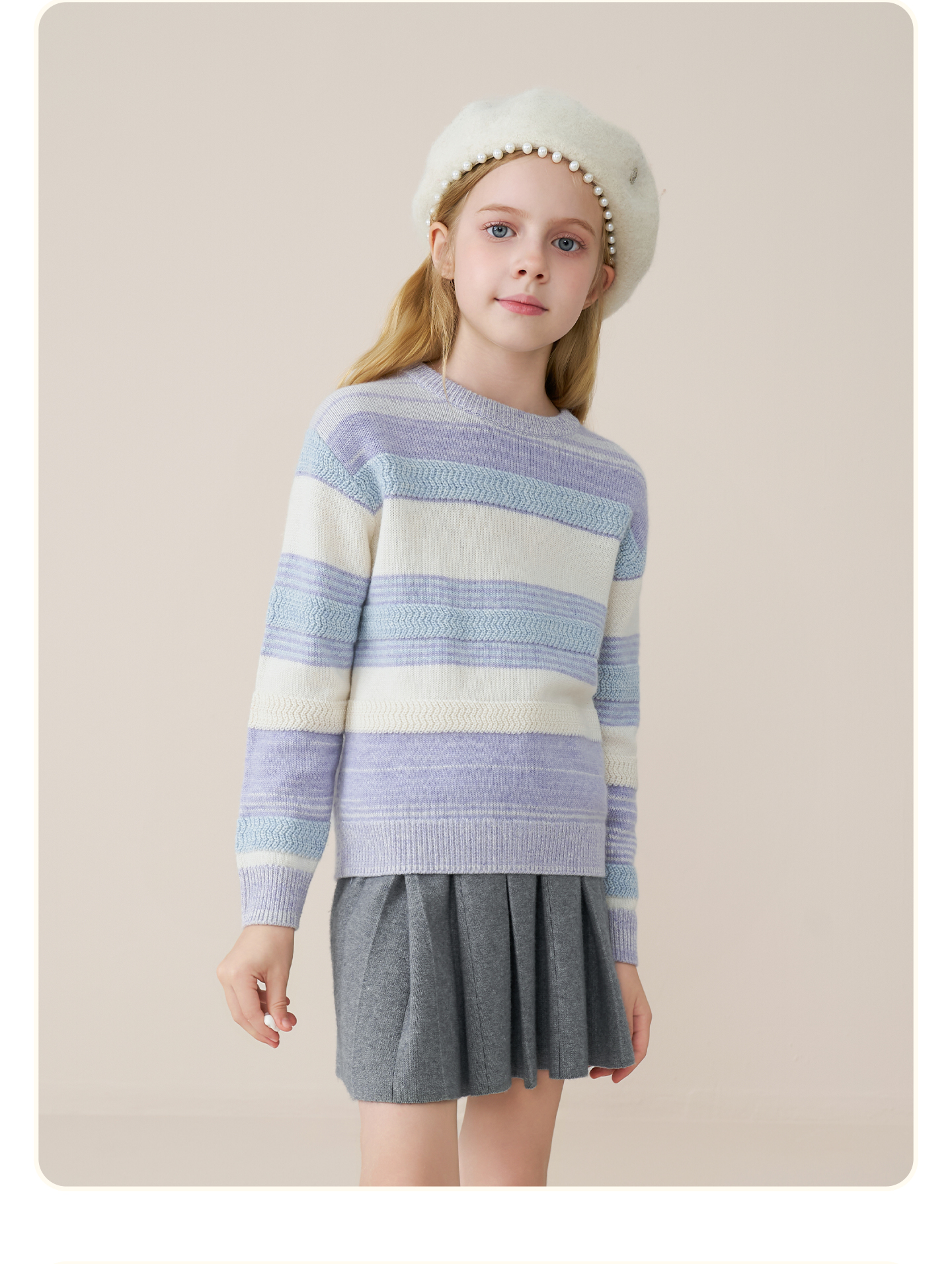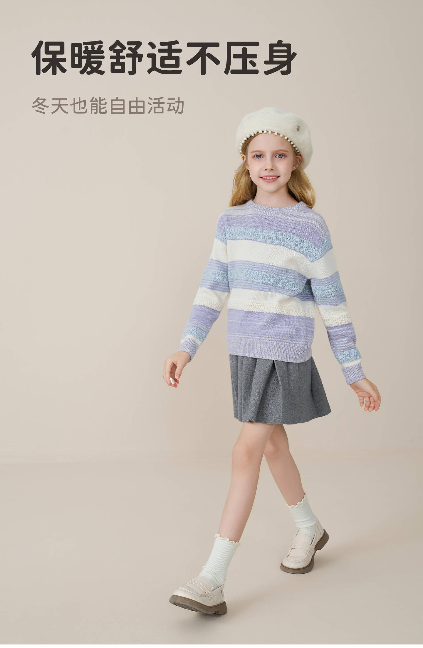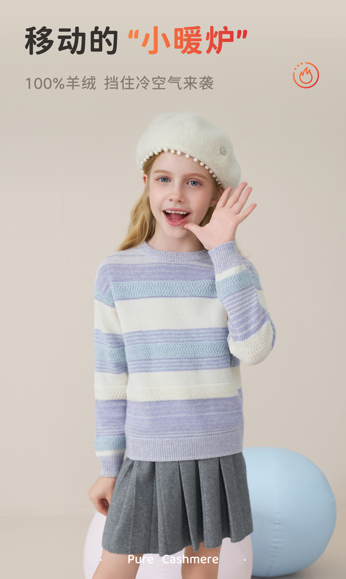 儿童100%羊绒衫2025秋冬女童圆领撞色条纹洋气针织套头毛衣打底衫