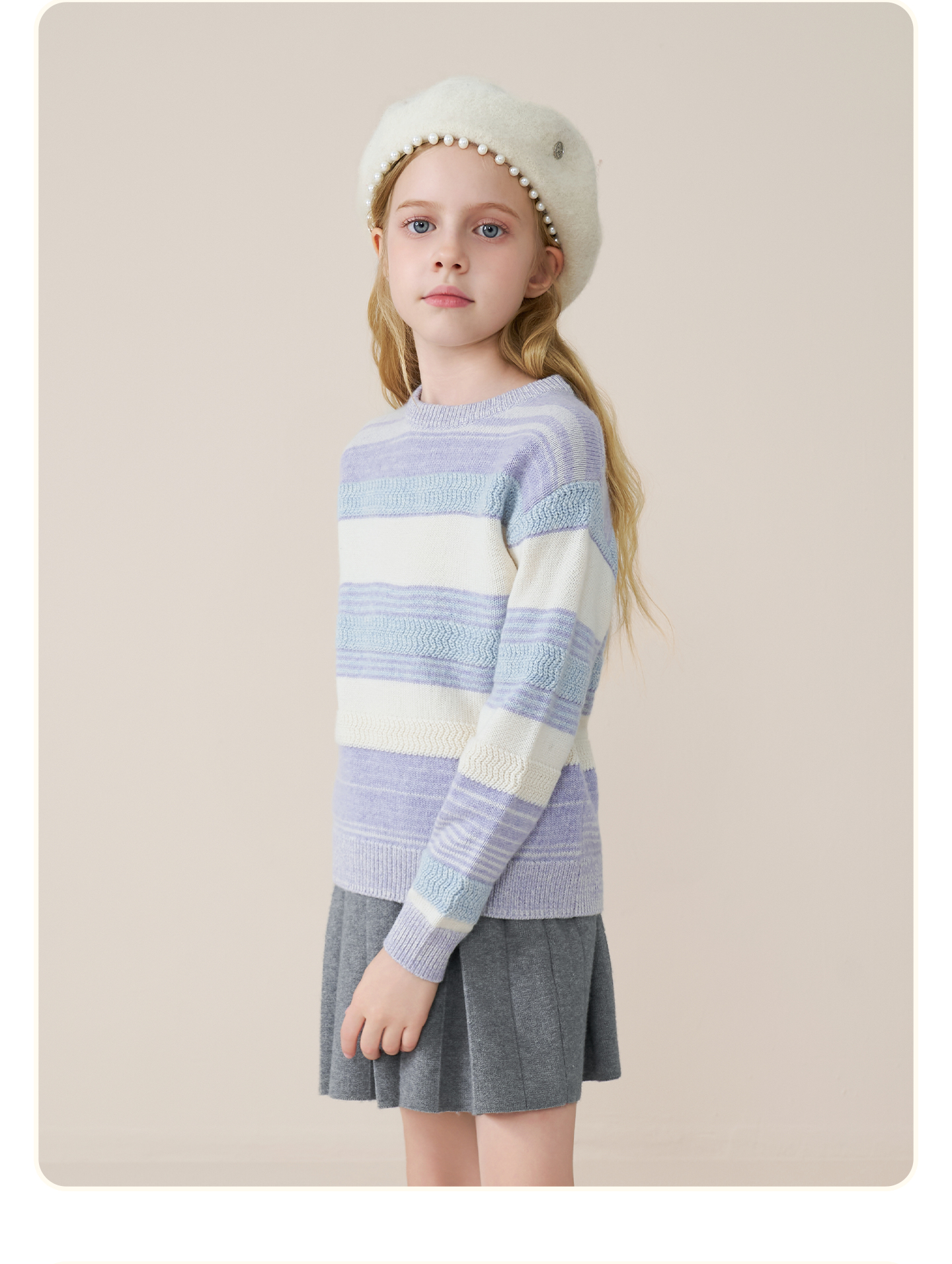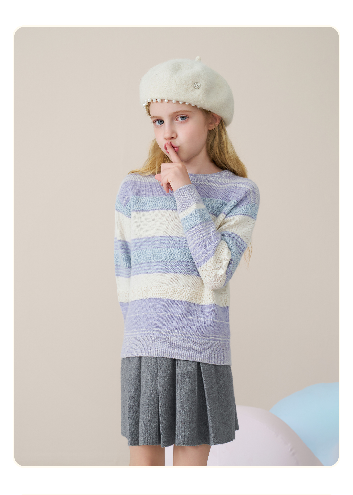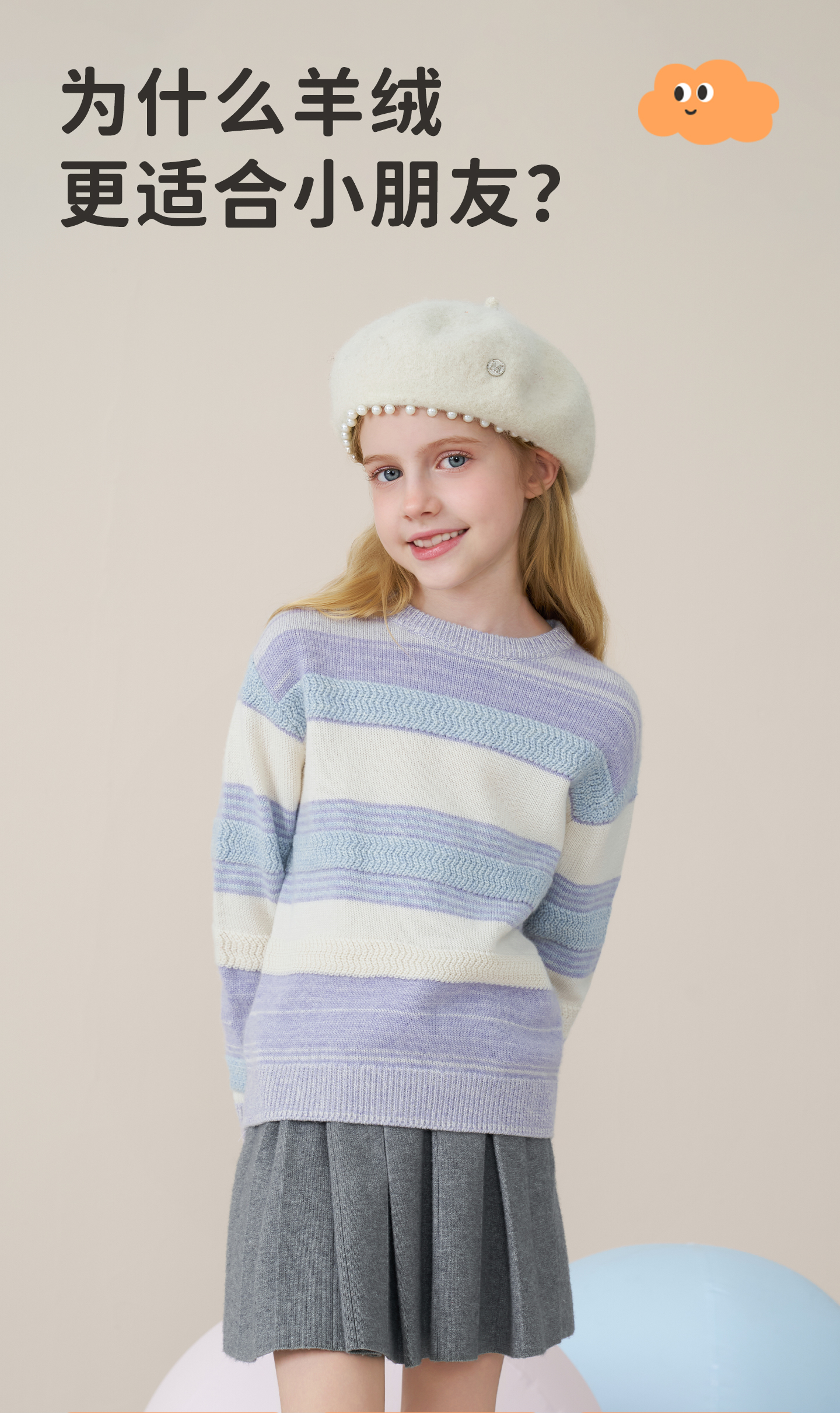 儿童100%羊绒衫2025秋冬女童圆领撞色条纹洋气针织套头毛衣打底衫