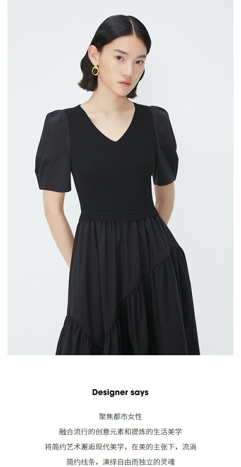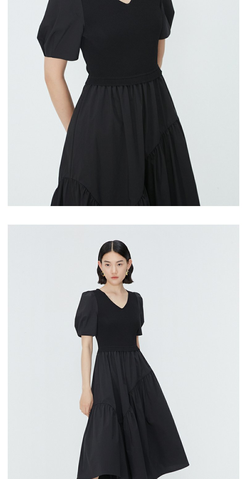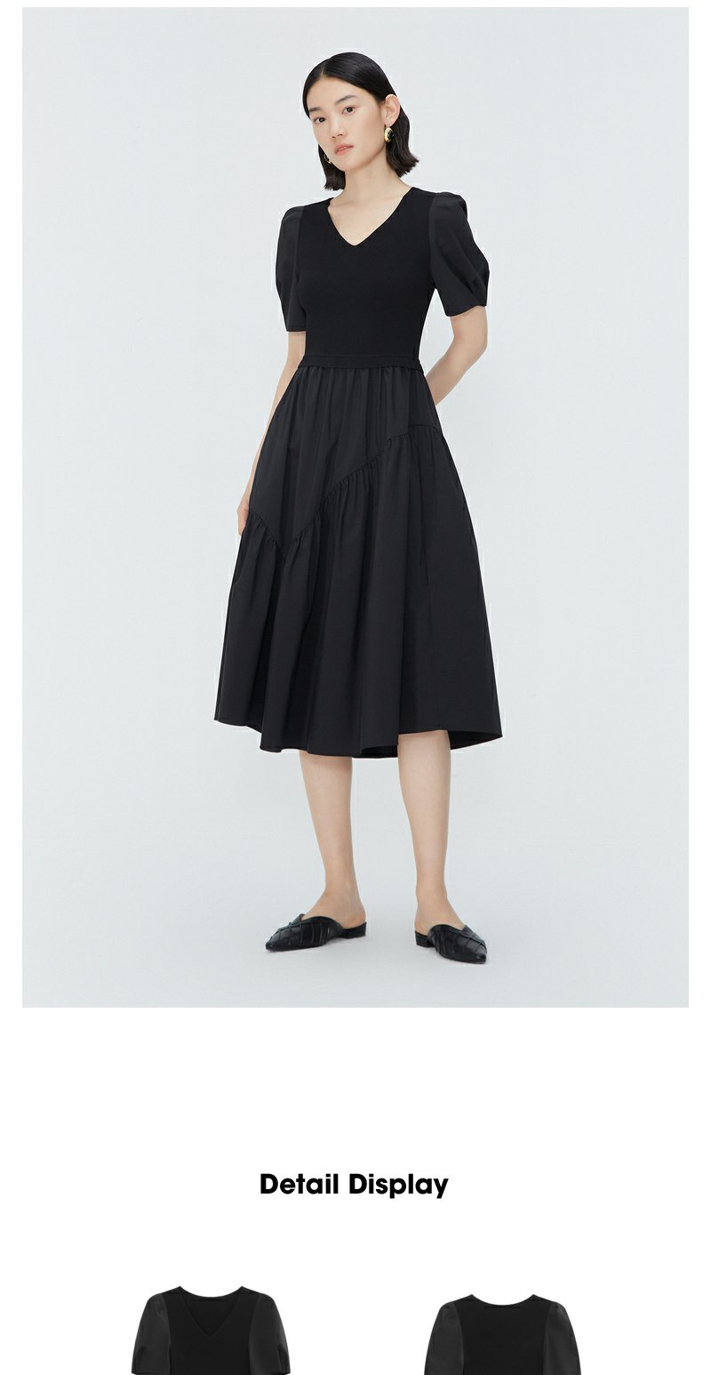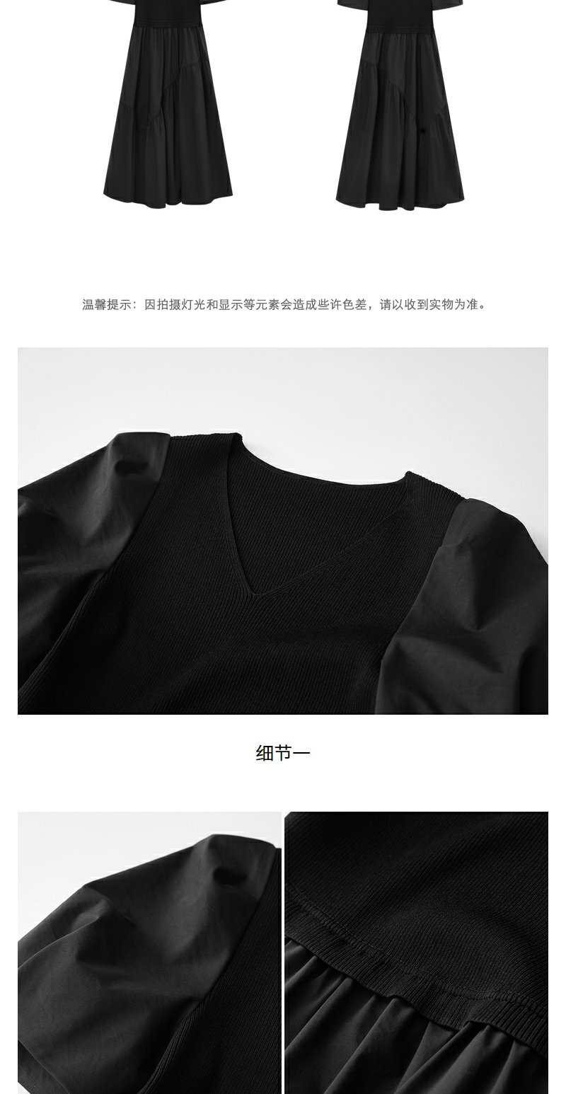 NEELLY纳俪商场同款夏季新款针织拼接短袖连衣裙女V领优雅长裙N25054Y04656