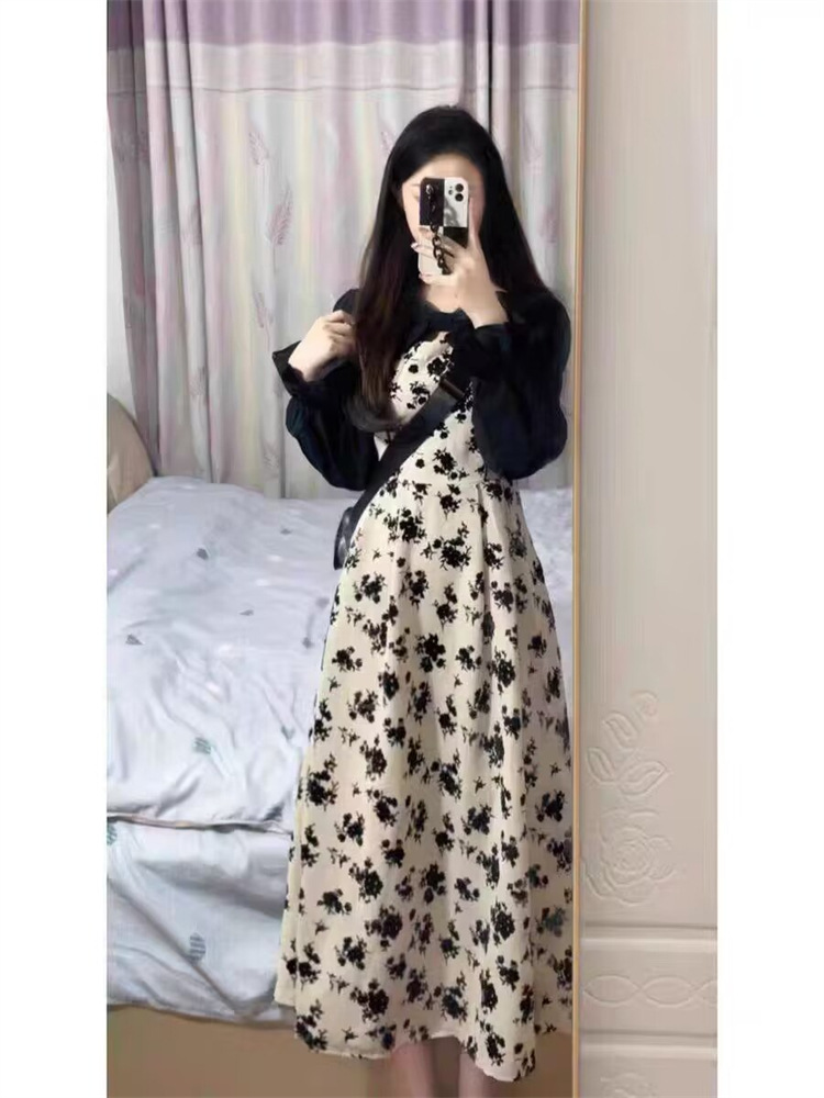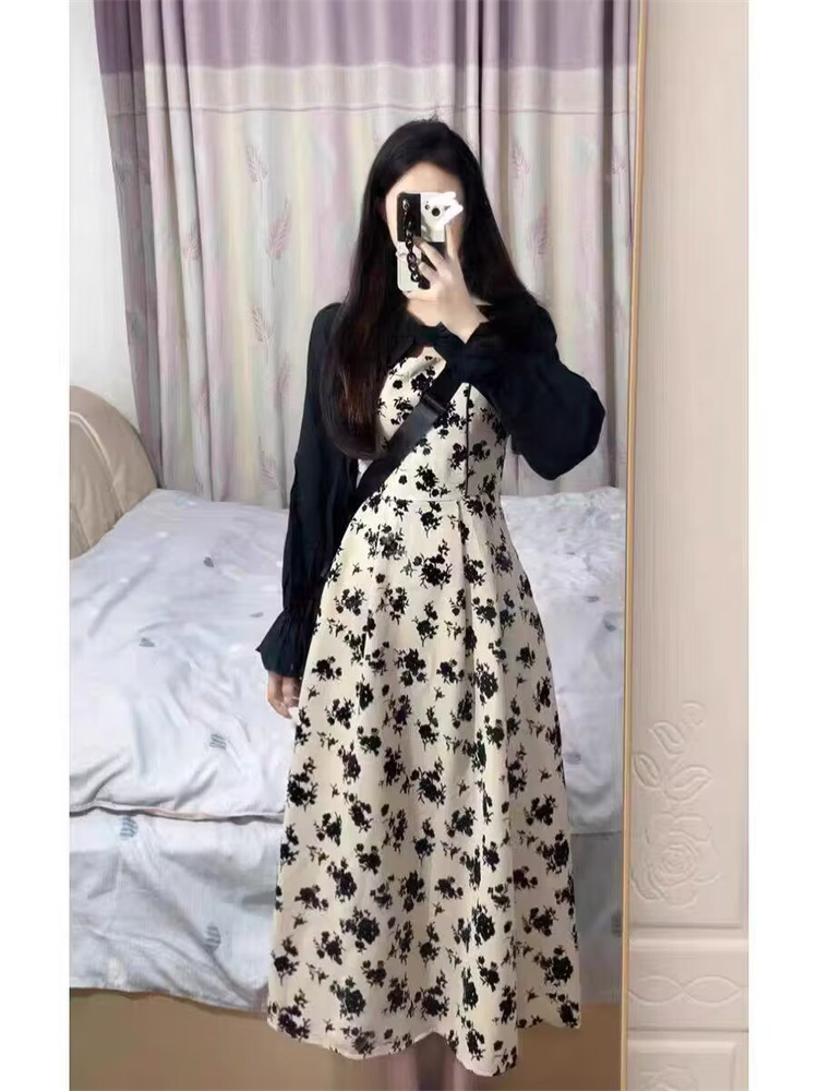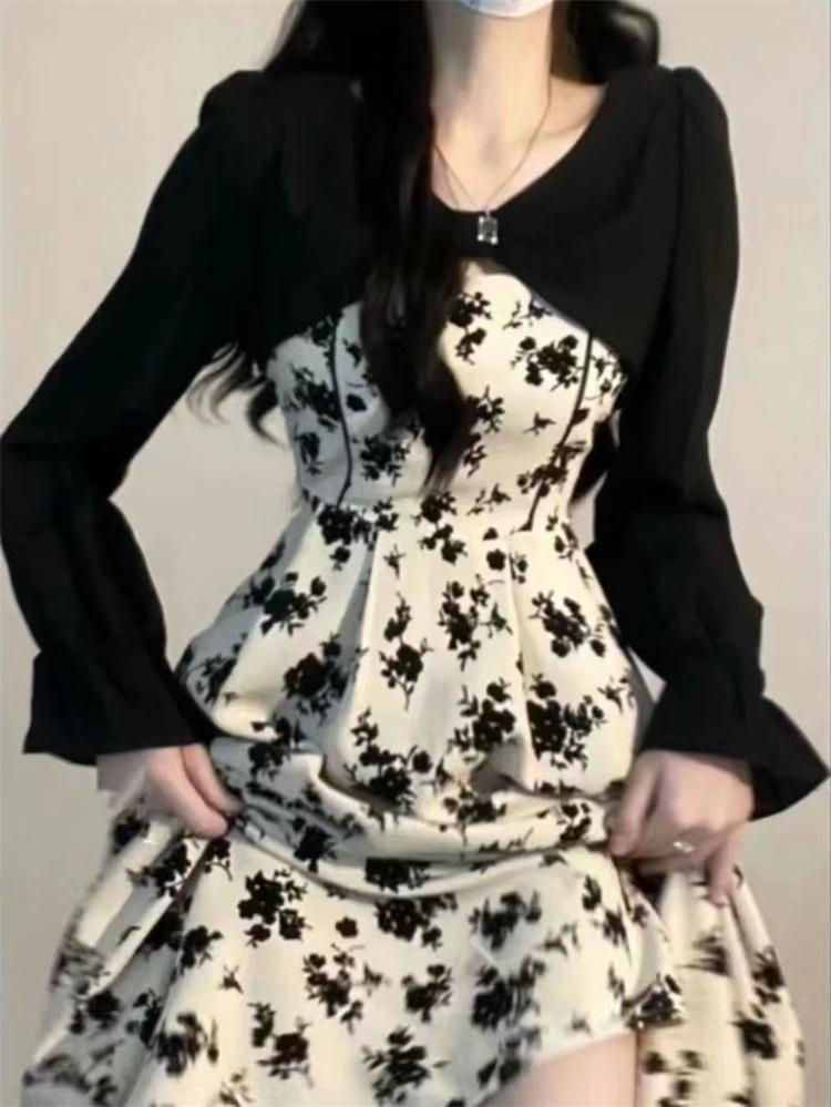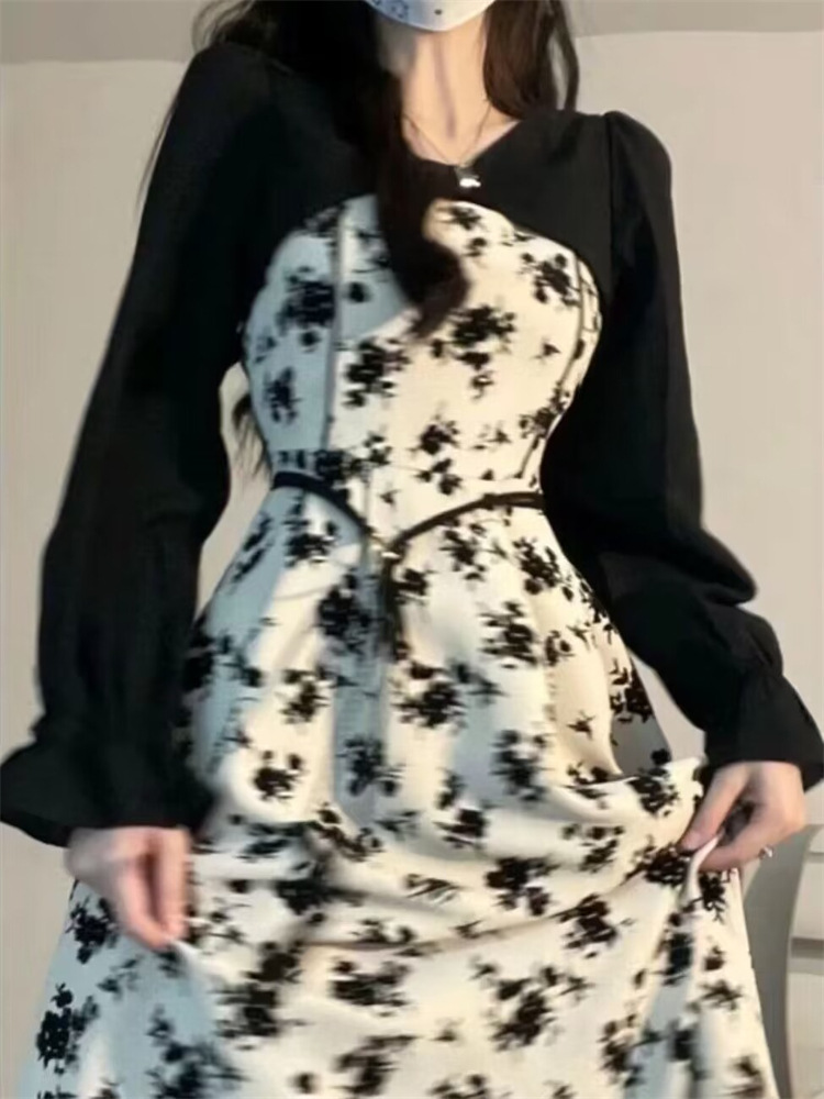【纯欲甜辣赫本风法式碎花连衣裙】春秋新款女设计感长袖假两件裙子潮