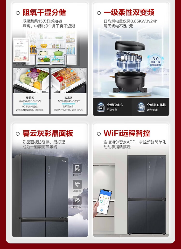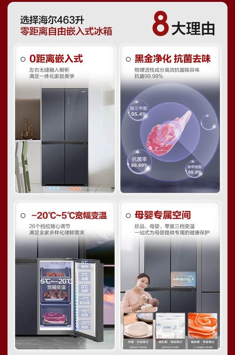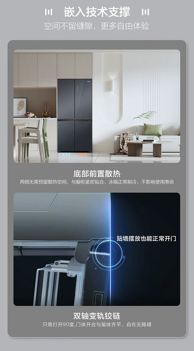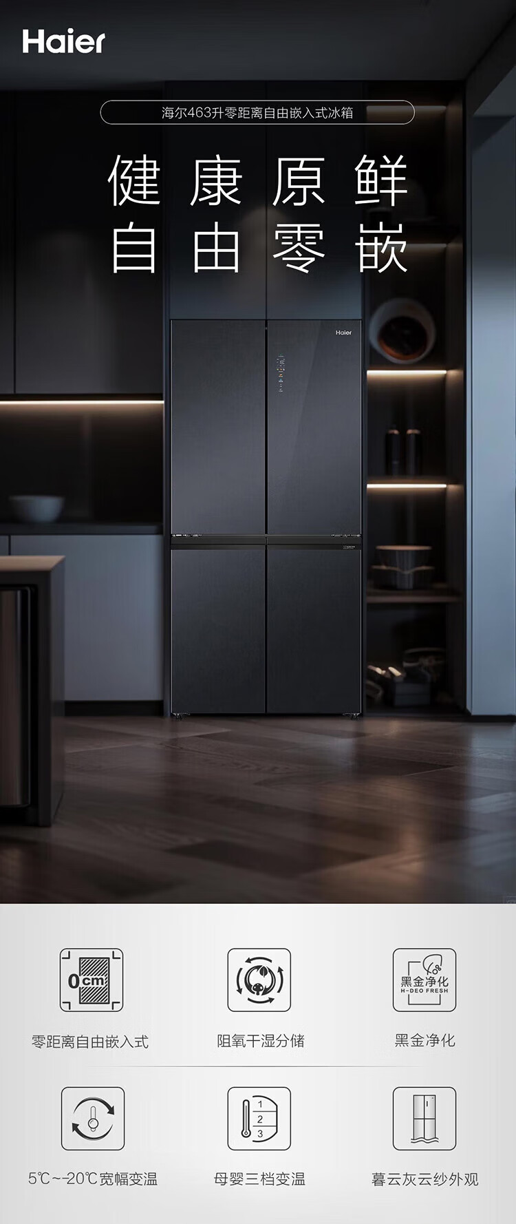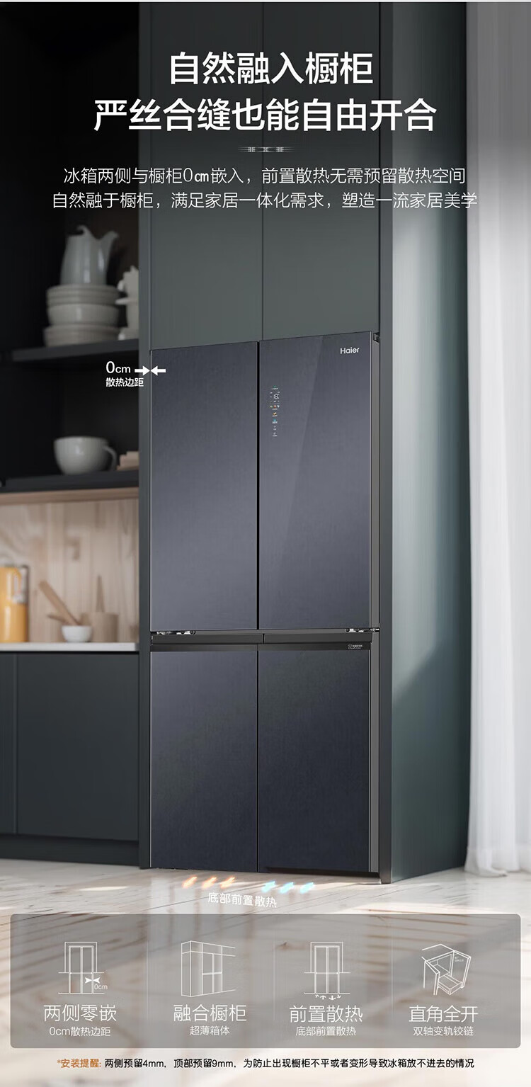 海尔(Haier)零嵌入式冰箱463升零距离四开门双开门十字门家用超薄家电一级能效双变频风冷无霜大容量底部散热 463L+黑金净化+阻氧干湿分储+WiFi智控