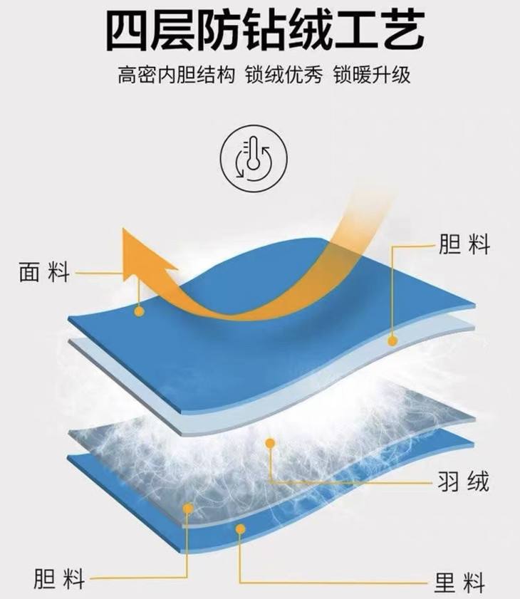 采用四层防钻绒工艺,高密内丹结构,里料、胆料、面料层层锁住白鹅绒,锁绒优秀还有缝线锁绒技术