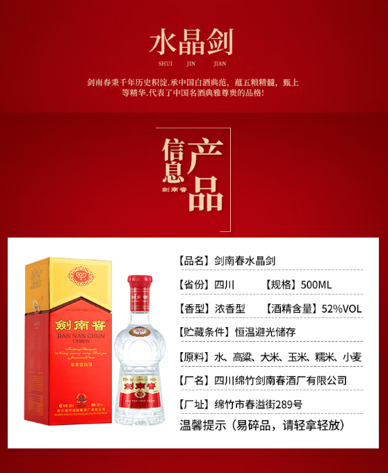 剑南春 水晶剑 52度500ml 浓香型白酒 单瓶装