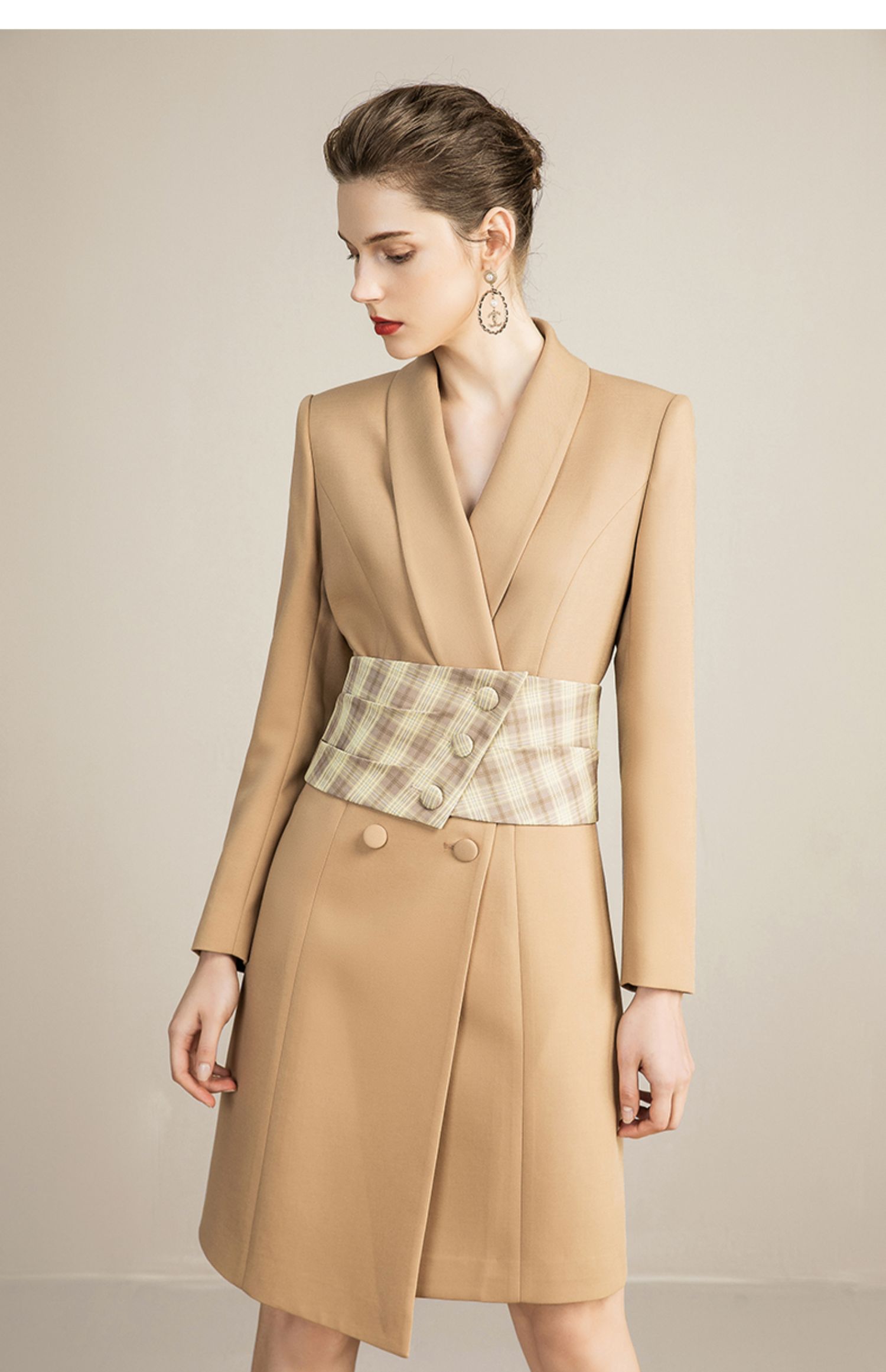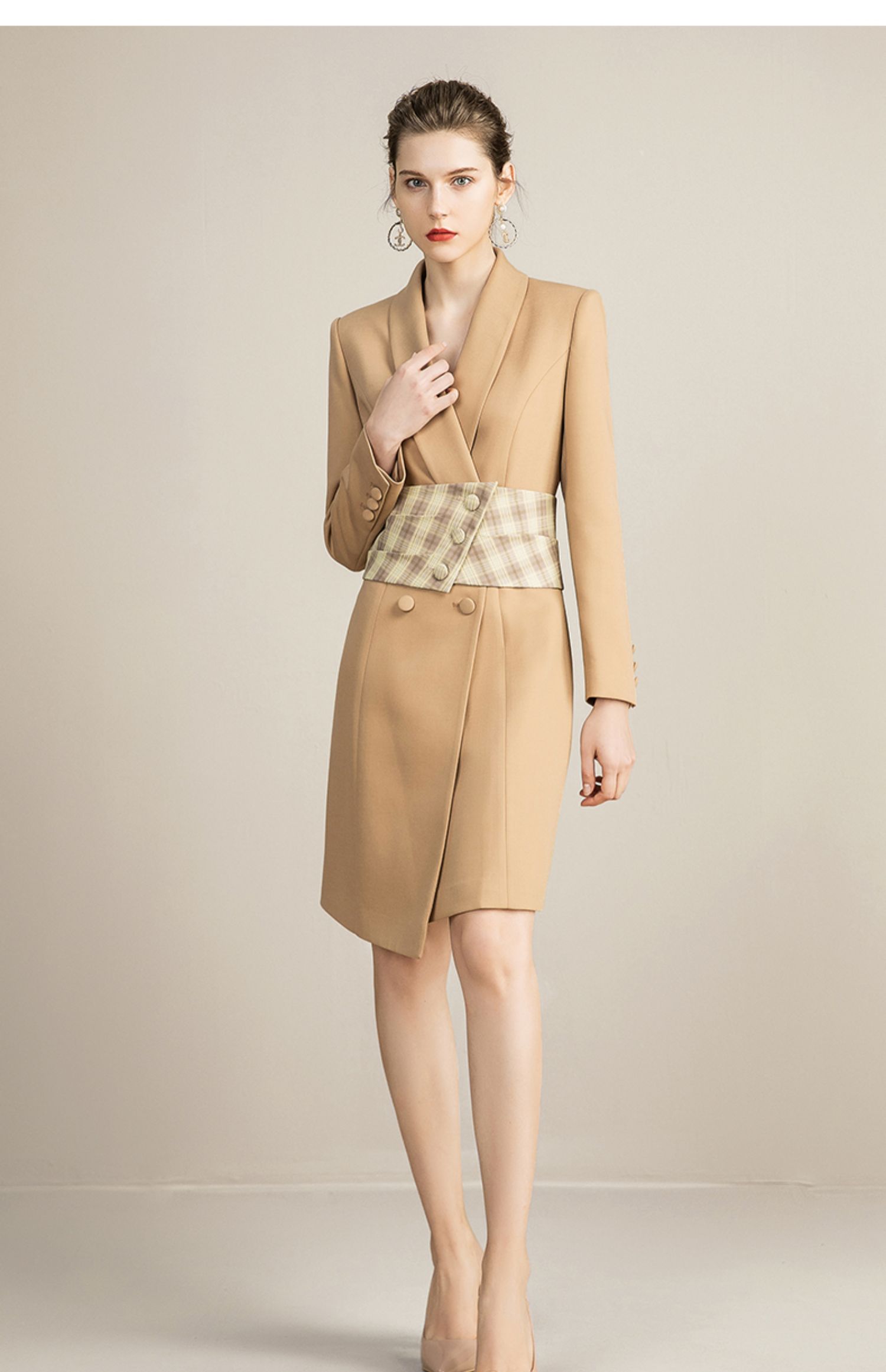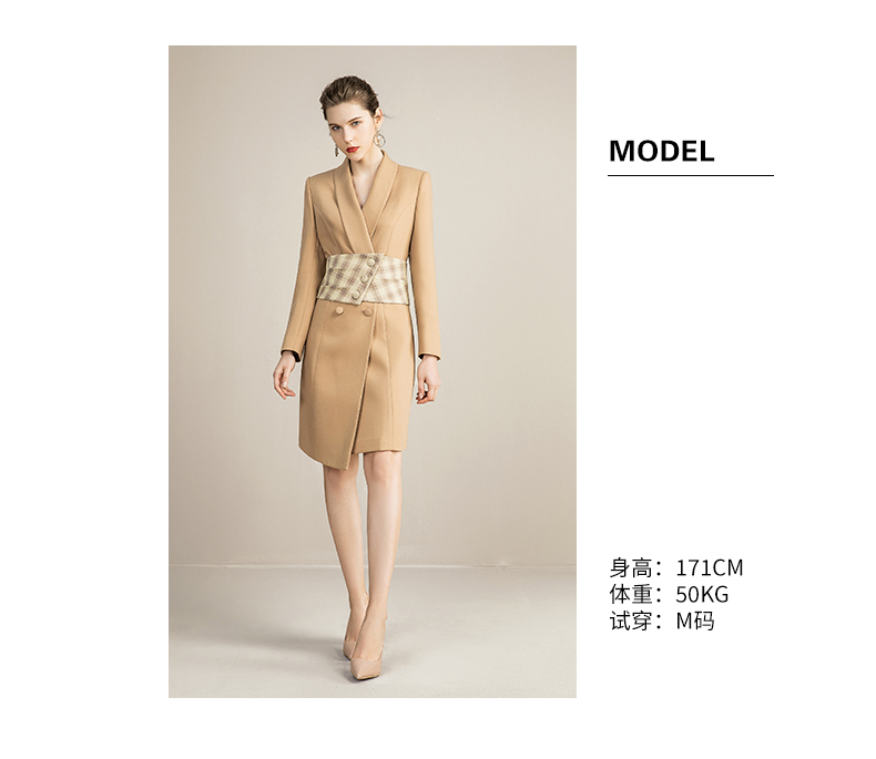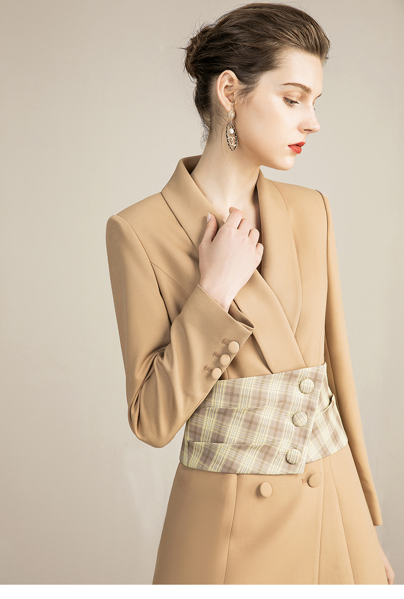 IWY/主持人同款显瘦职业连衣裙女长袖高端工作服时尚气质名媛卡其西服正装OL 213157Q1