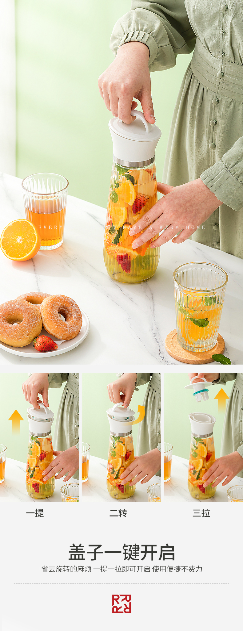 乐博家居冷水壶的盖子设计简洁实用,只需轻轻按下,即可一键开启。不需要费力拧紧或拆卸盖子,让你在享受清凉的同时,也节省了使用的时间和力气。