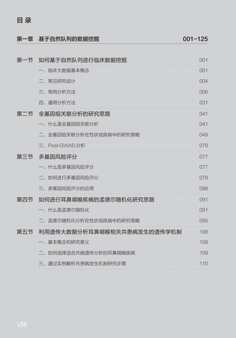 本书主要围绕如何基于大型临床及基因数据库、自然人队列、专病队列等数据形式开展大数据研究,并以耳鼻咽喉头颈外科疾病为实例进行step by step讲解,从基本概念到提出科学问题,从实验设计到实战操作进行全方位讲解,每个章节提供具体实现代码,以期让读者阅读完本章节内容后可基本掌握分析要点以独立完成数据分析工作。本书初步设计包括11个大章节和近40个小节内容,其中,大章节内容包括1.基于自然队列的耳鼻喉数据挖掘;2. 基于专病队列做疾病发展和预后相关研究;3.整合分析多组学数据筛选疾病靶点的精准医学策略;4. 基于转录组学进行耳鼻喉疾病探究;5. 单细胞转录组数据分析;6. 全外显子数据分析;7. 全基因组数据分析;8. 免疫组学数据分析;9.甲基化数据挖掘;10.耳聋遗传数据分析及耳聋队列研究;11.人工智能在耳鼻喉中的应用。全书覆盖了临床医学、流行病学、生物信息学、遗传学、计算机学等领域,结合编者团队的实战研究经验,呈现了众多前沿数据分析技术在耳鼻咽喉头颈外科学中的应用实例,如全基因组关联分析、药物基因组、孟德尔随机化、多组学关联分析、环境基因交互分析、耳聋遗传分析等。