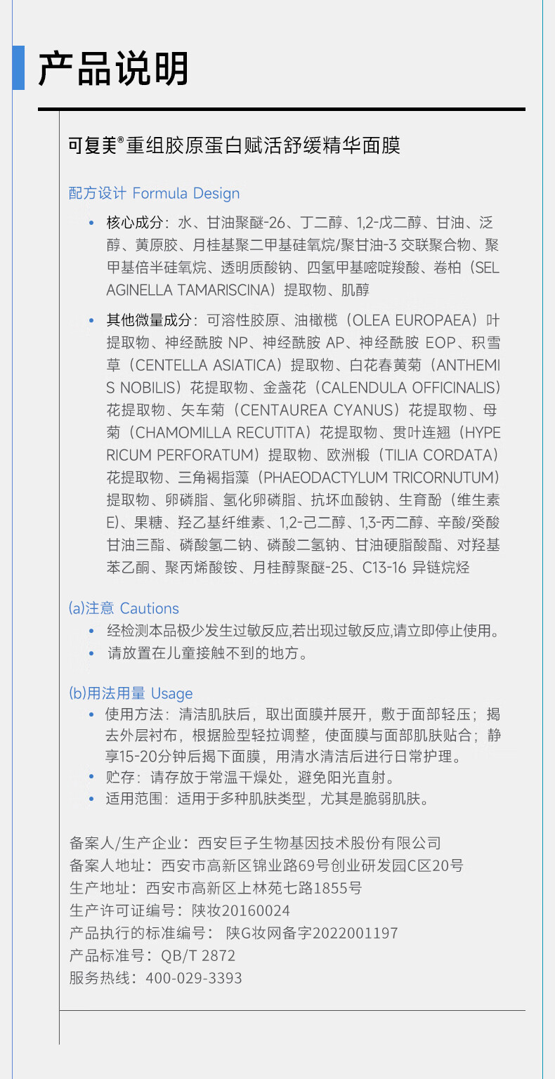 可复美重组胶原蛋白赋活舒缓精华面膜25g*5片/盒(舒舒贴)