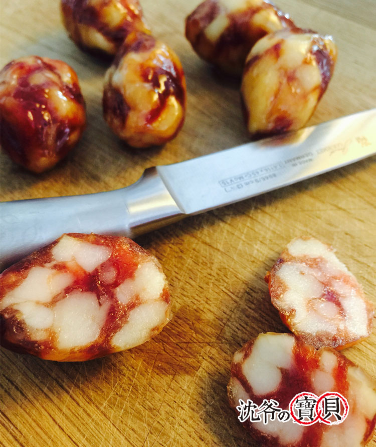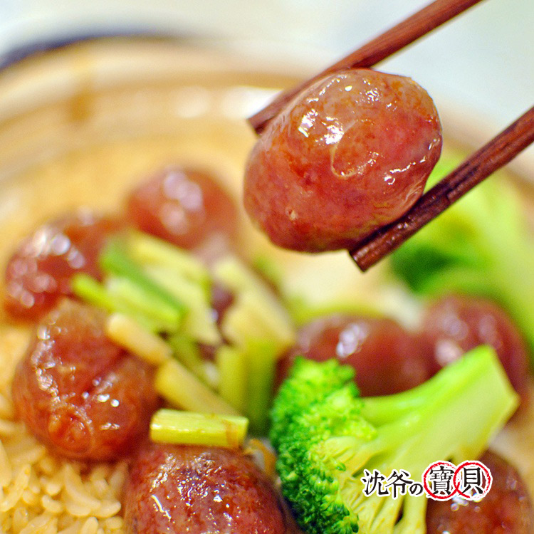 "东莞腊肠"属粤式腊肠里的异形版,它不仅是好吃的一种,而且在外型上是有型的一种。味荤,形也荤,因为长得就比普通腊肠粗且短挫,拇指(当然是成人的)般大小,说它是"香肠",实在有些用词不当,称它为"一根"或"一条",就更说不出口了,它其实更接近于一坨圆咕抡敦的小肉弹。长这个个枣模样,主要是为了让它在晒干的过程中得以更为全方位地受光受热。阳光和风的外力作用之外,要制成一截好吃的莞肠,尚有赖于材料的选择及配比。沈爷私人订制的小肉弹,特选陈年山西特沽杏花村汾酒,使用高级土猪肉,至于腊肠的灵魂──酱油,则使用做酱油达36年之久的老师傅的手作产品,黄豆+面粉和面蒸好之后入缸进行8个月风吹日晒,然后换大缸进行2个月的生晒,只有这样的酱油,才会产生更复杂的鲜香。