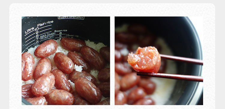 注一:"肉弹"不可切段或切片蒸,须整粒!这样才会有15分钟之后的爆浆效果。当然,如果你想让"肉弹"里油脂漏一些到正煮着的米饭里,也可以在保留整粒的同时切上它几粒。