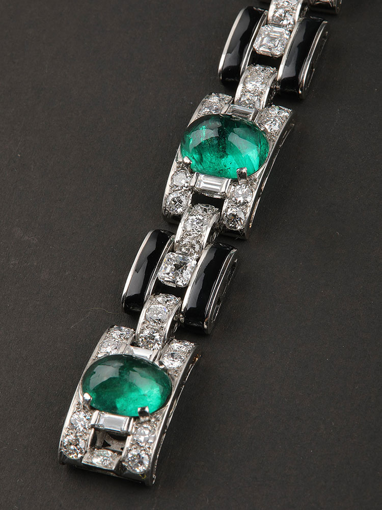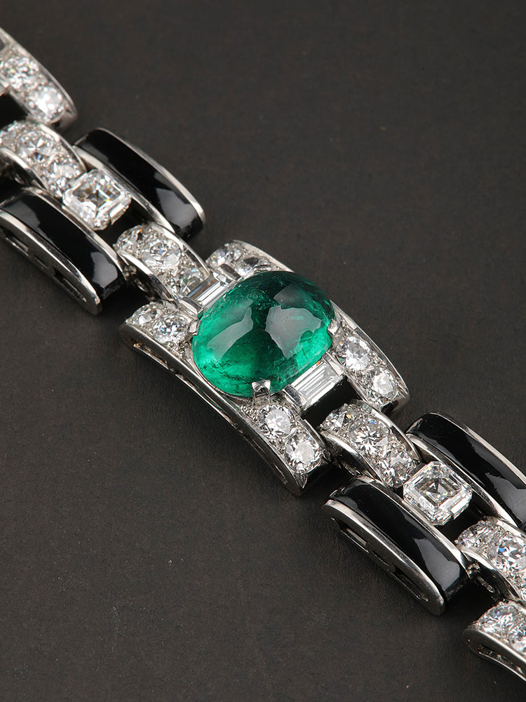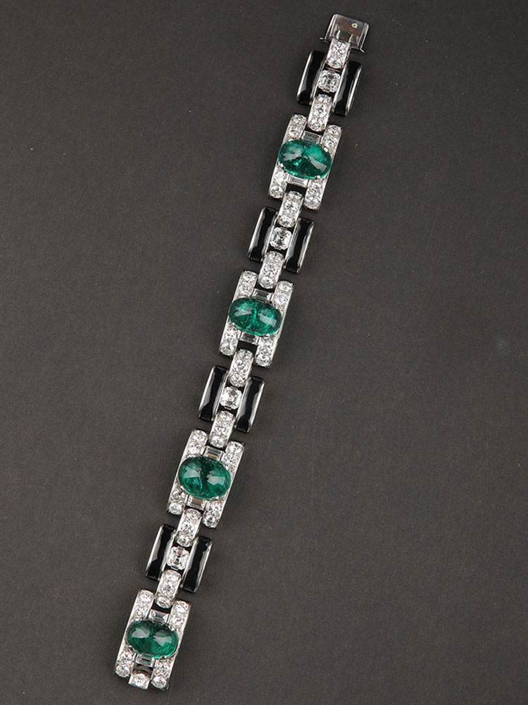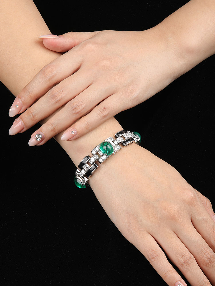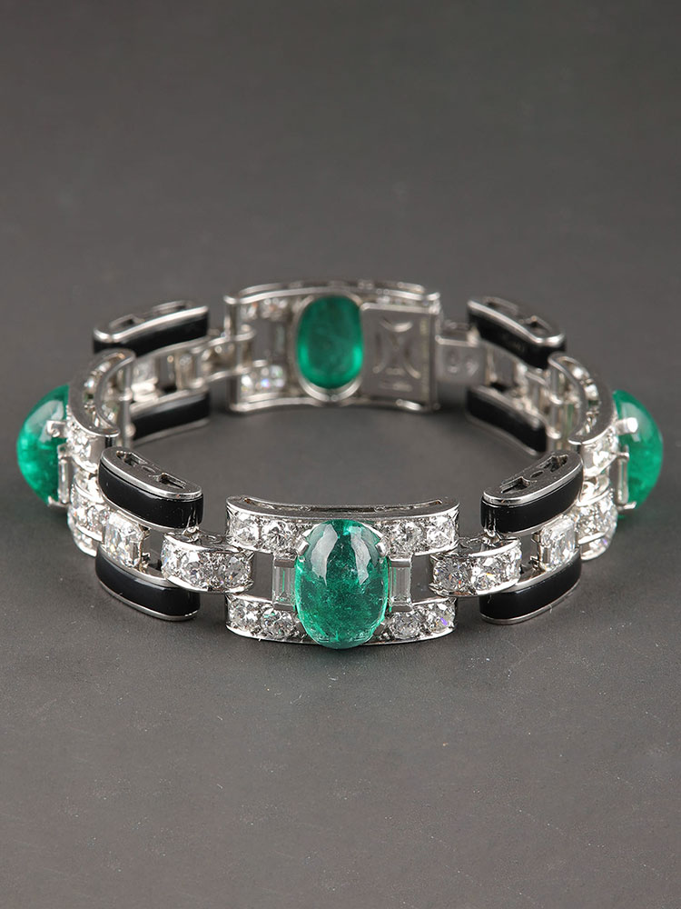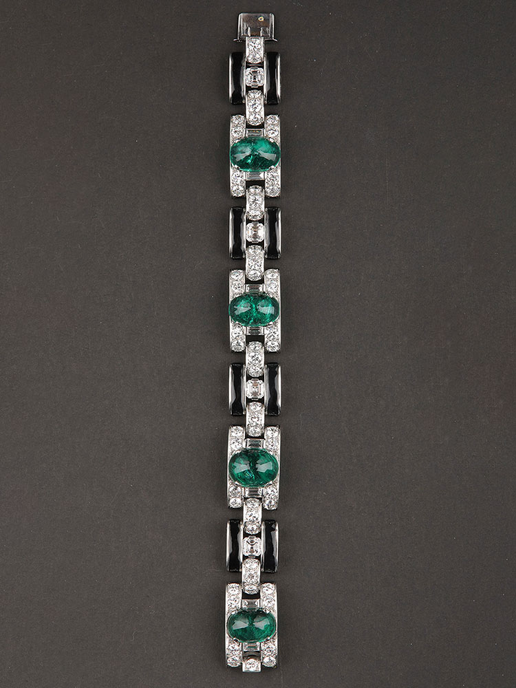 1925年代法国出品装饰艺术风格铂金镶嵌祖母绿钻石手链