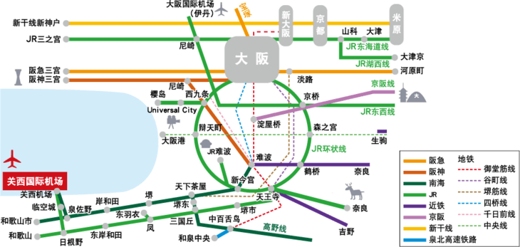 机场距离高铁中心新大阪站约 50 分钟,距离京都站 75 分钟。机场与大阪市中心之间有多趟 JR 特急列车和快速列车,搭乘便捷,只需 1 个多小时即可抵达。