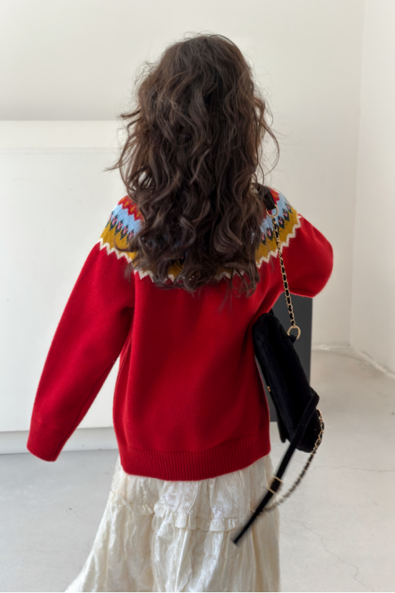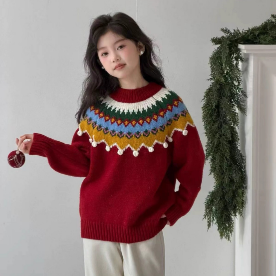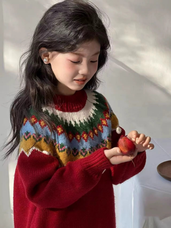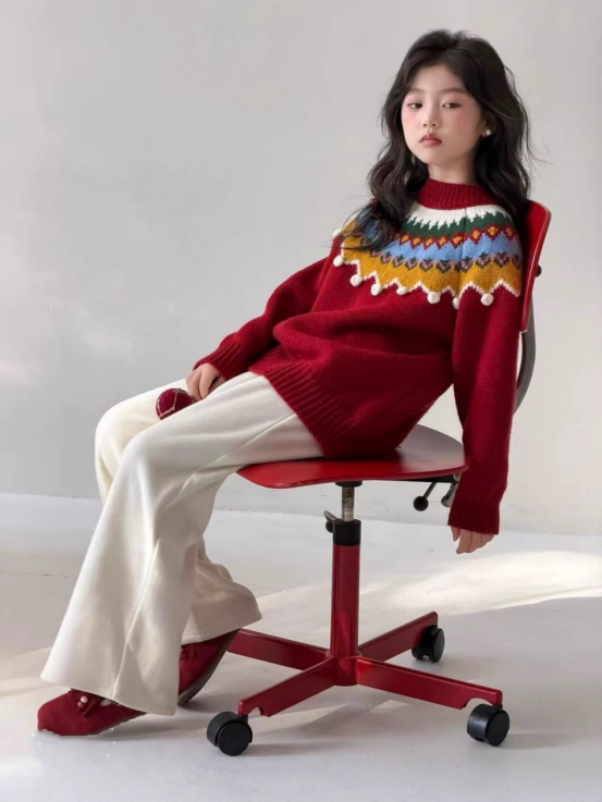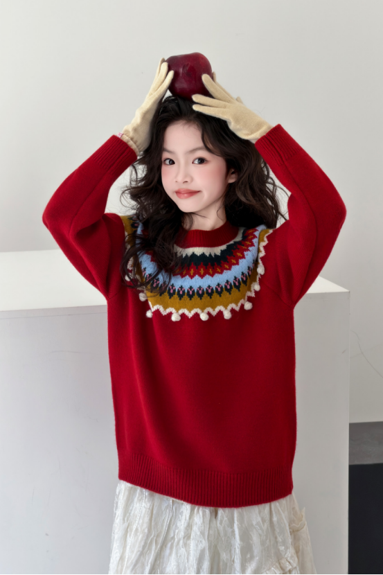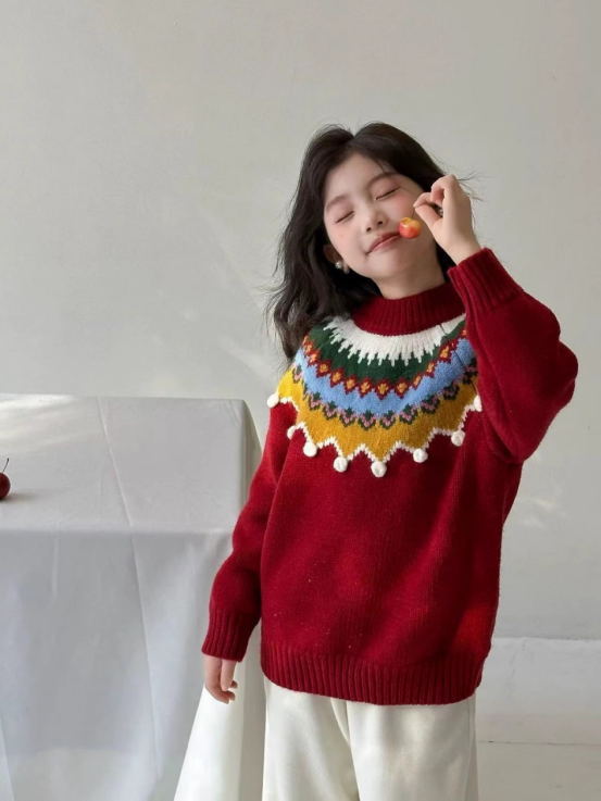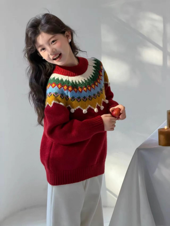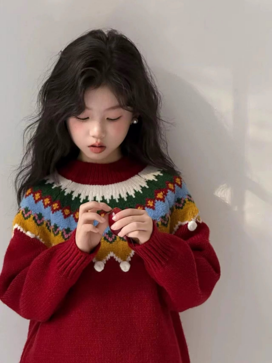被问爆的圣诞红毛衣!民族风花纹+小绒球也太会了🎄” 浓郁酒红色,自带圣诞/新年氛围感,显白又衬气色 领口下方的民族风彩色花纹(绿+白+黄+蓝渐变)+下摆小绒球, 甜而不幼稚,比纯色毛衣更有记忆点 宽松落肩款,对身材包容度高,穿起来软乎乎的很有冬日松弛感 配米白色阔腿裤,浅色系中和了红毛衣的厚重感,视觉上清爽又温柔 “谁懂啊!红毛衣+白裤子=冬日氛围天花板❄️”