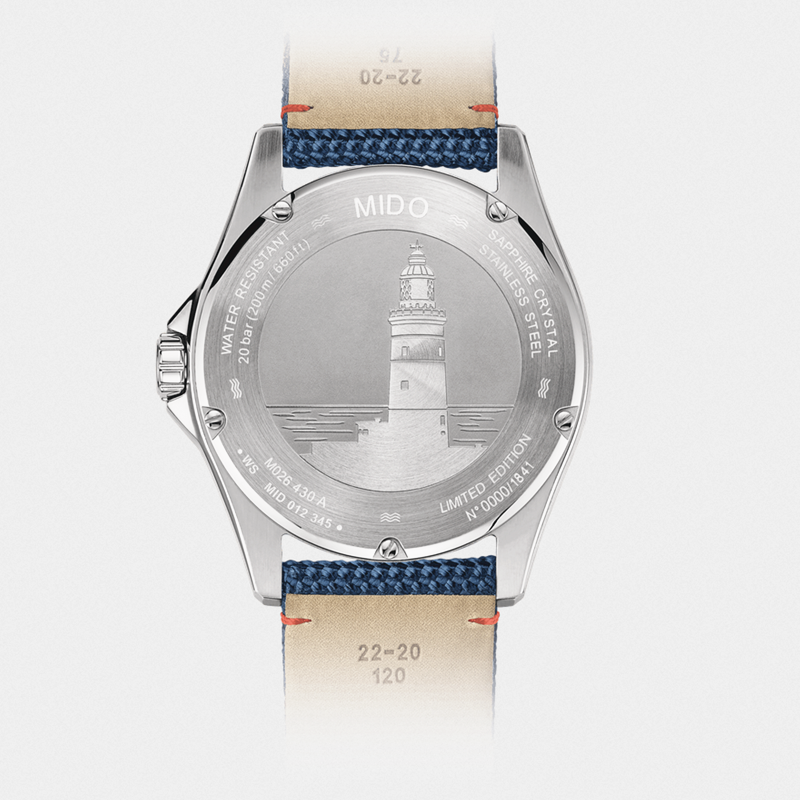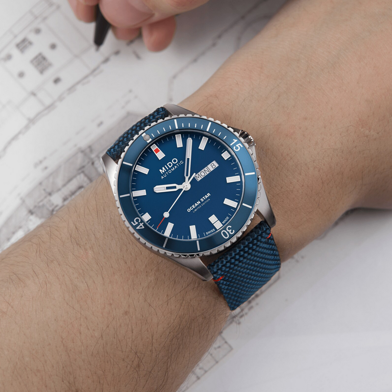 镜面 材质 | 蓝宝石水晶玻璃 | 表盘 | 不锈钢表壳 蓝色表盘立体镶嵌刻度,刻度上设有Super-LumiNova® 白点,日期星期窗位于3点钟位置。螺旋式表冠,表壳背面清晰地饰有抛光海星,镌刻序列号 不透底 |