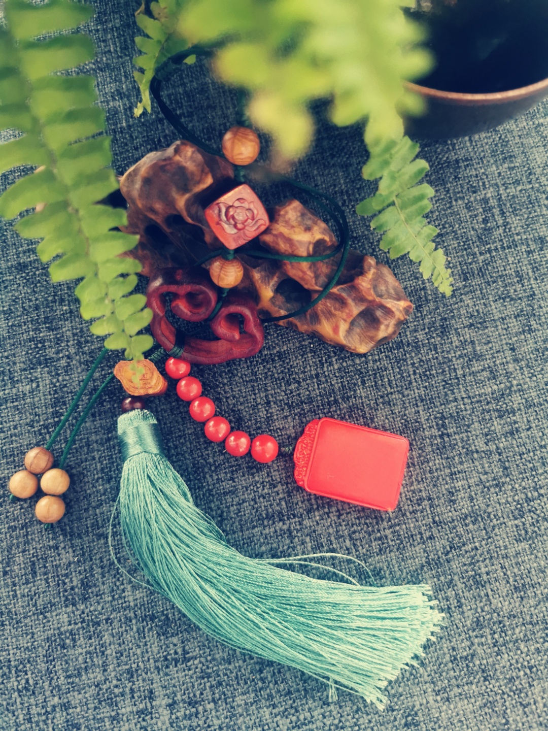 朱砂,我确实建议人手一串,平时摆在床头案边,进门右手边挂件,汽车挂件、钥匙扣,二十四节气应该带一下(节=劫),然后去医院、寺庙、墓地等地,要带上。